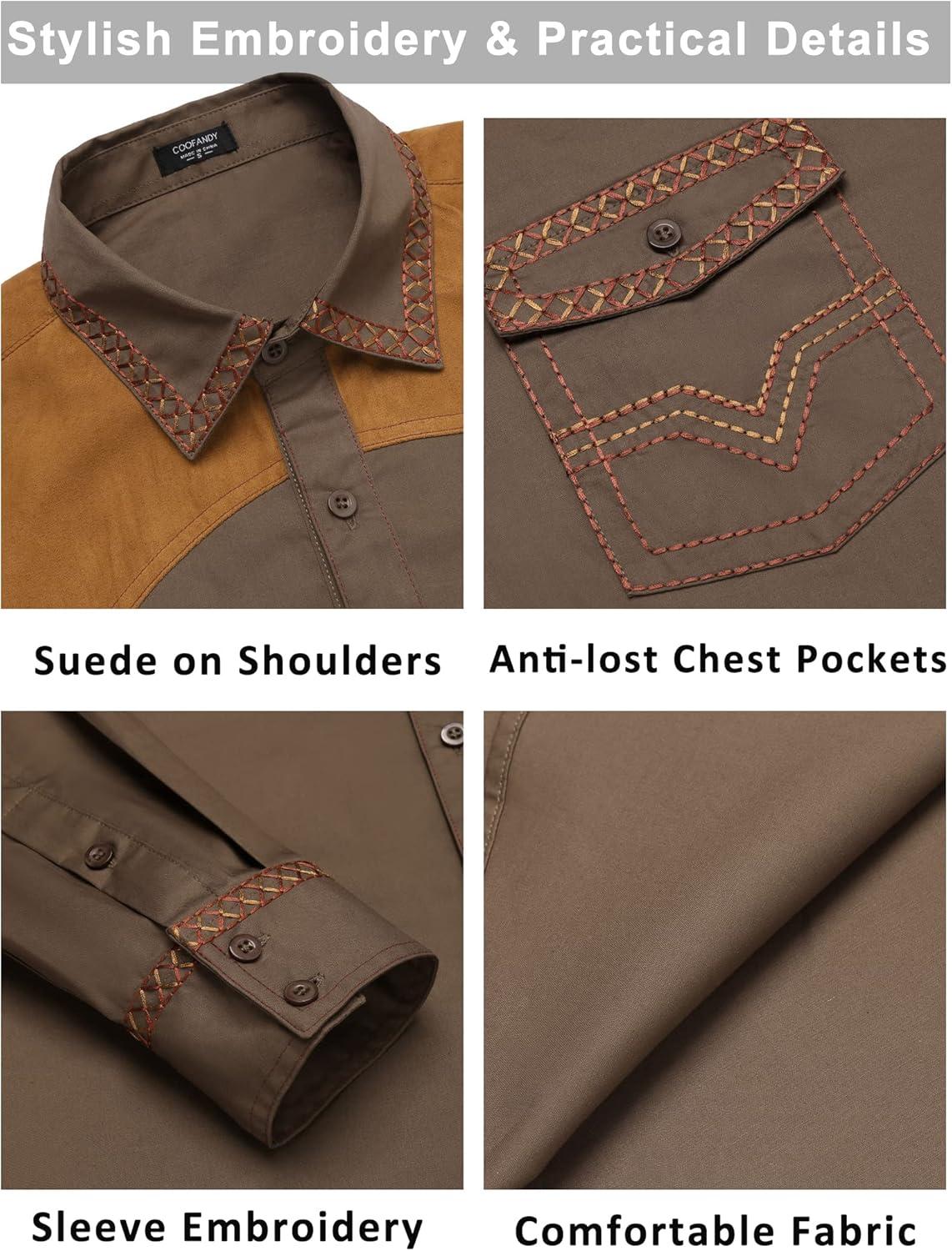 imageCOOFANDY Mens Western Cowboy Shirt Embroidered Long Sleeve Slim Fit Casual Cotton Button Down Hippie Shirts with PocketsCoffee