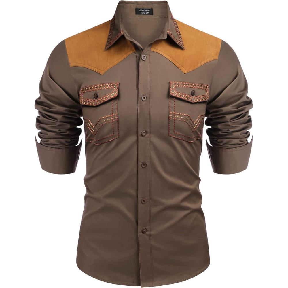 COOFANDY Men’s Western Cowboy Shirt Embroidered Long Sleeve Slim Fit Casual Cotton Button Down Hippie Shirts with Pockets(Coffee)