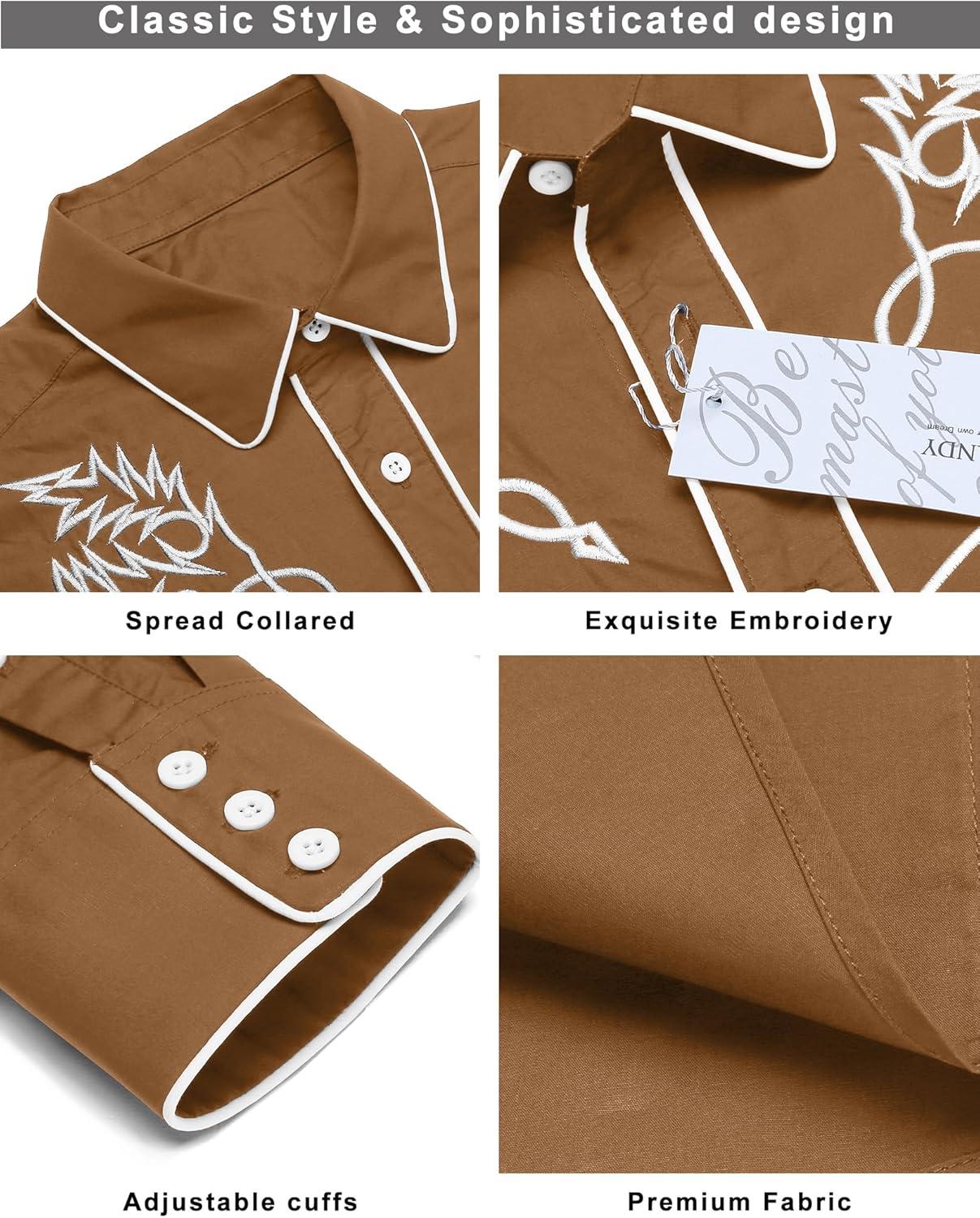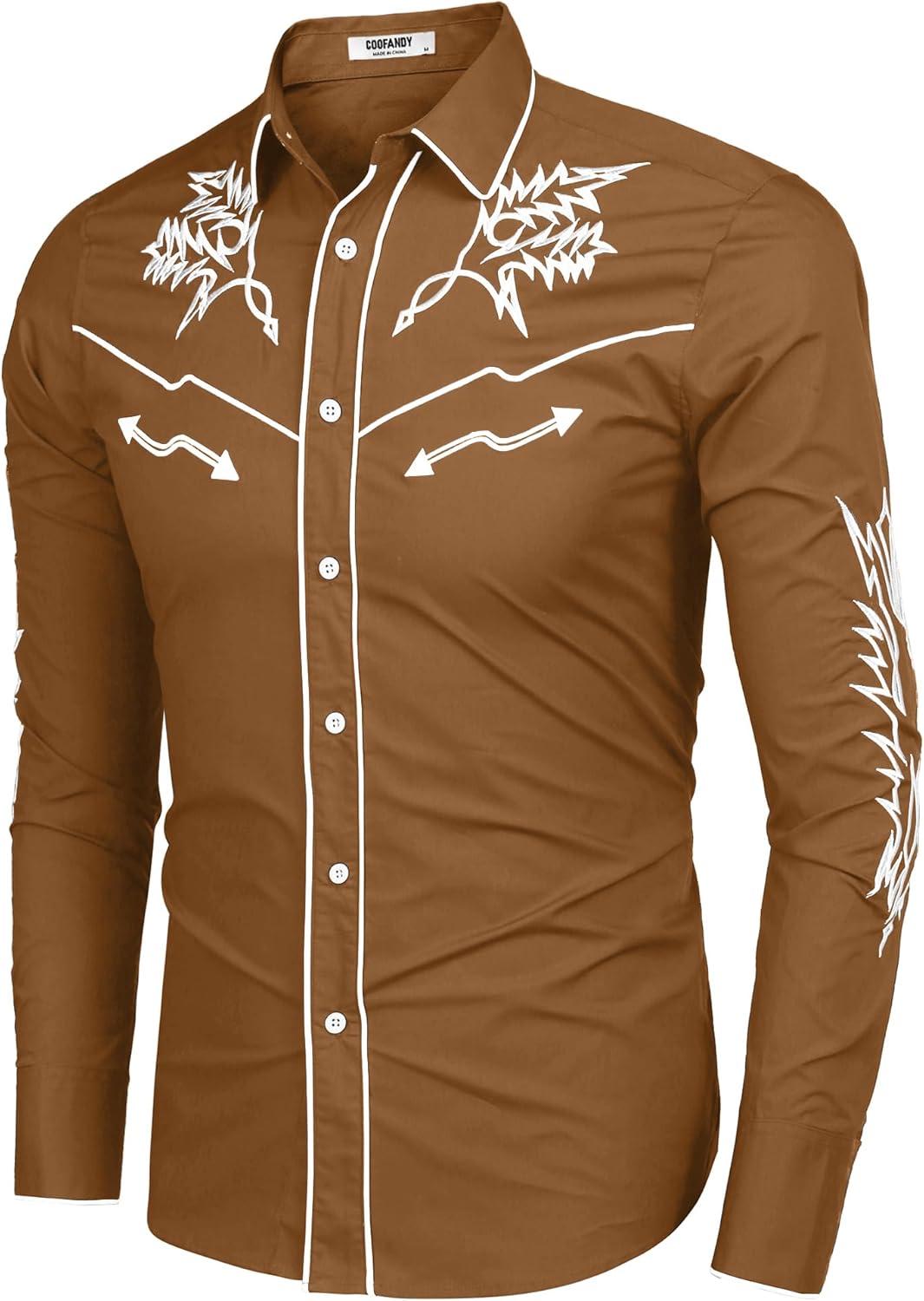 COOFANDY Men's Western Cowboy Shirt Long Sleeve Embroidered Shirt Slim Fit Cotton Casual Button Down Shirt(Light Brown)