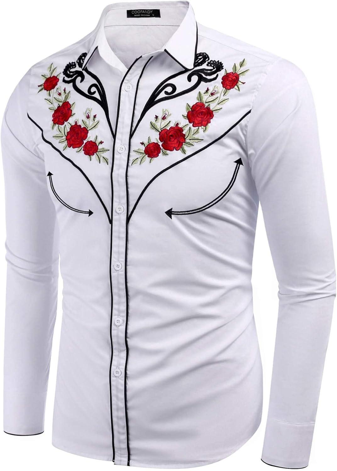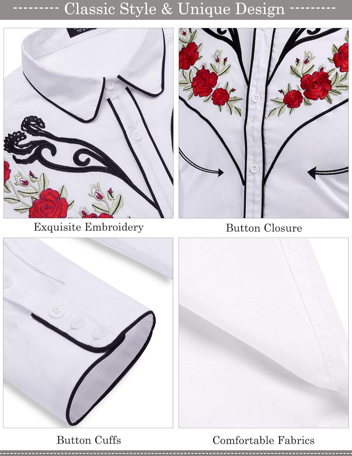 COOFANDY Men's Western Cowboy Shirt Long Sleeve Embroidered Shirt Slim Fit Cotton Casual Button Down Shirt(White (Retro Rose))