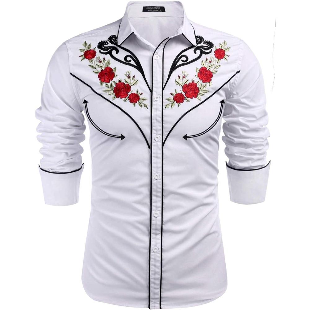 COOFANDY Men’s Western Cowboy Shirt Long Sleeve Embroidered Shirt Slim Fit Cotton Casual Button Down Shirt(White (Retro Rose))