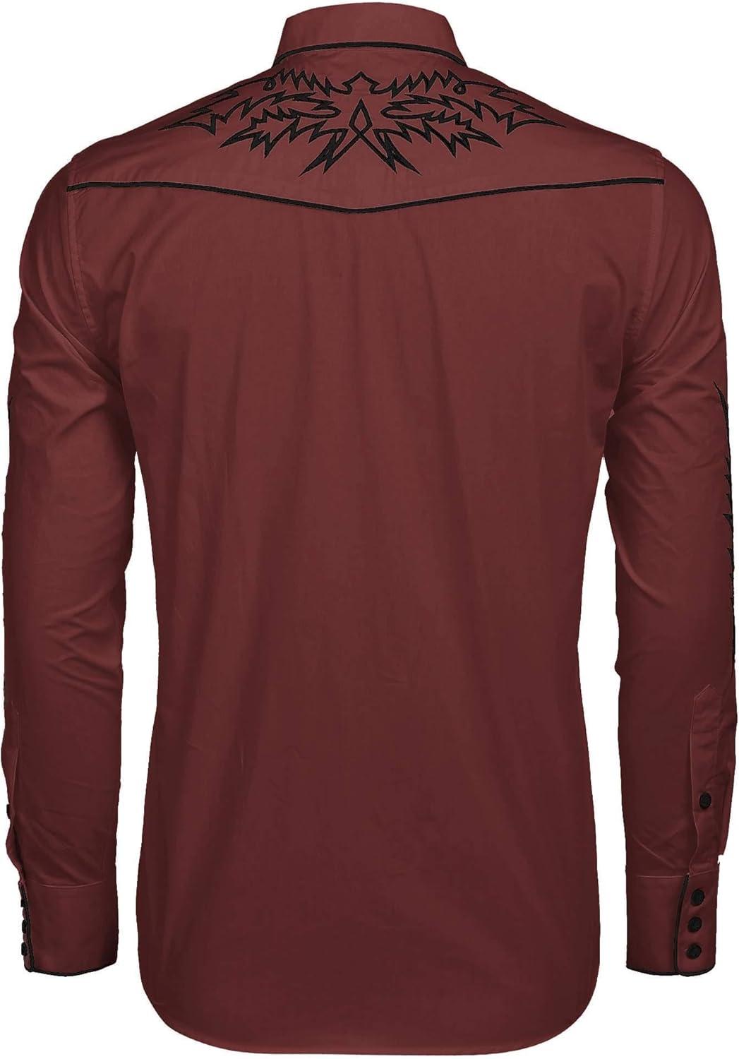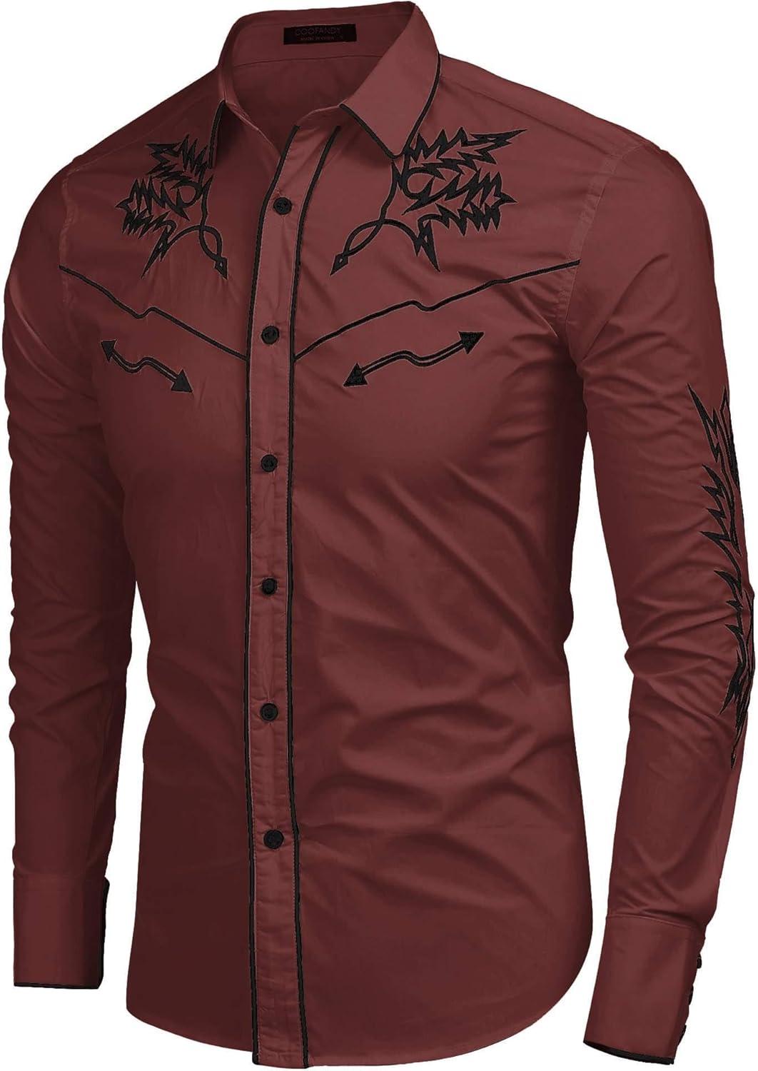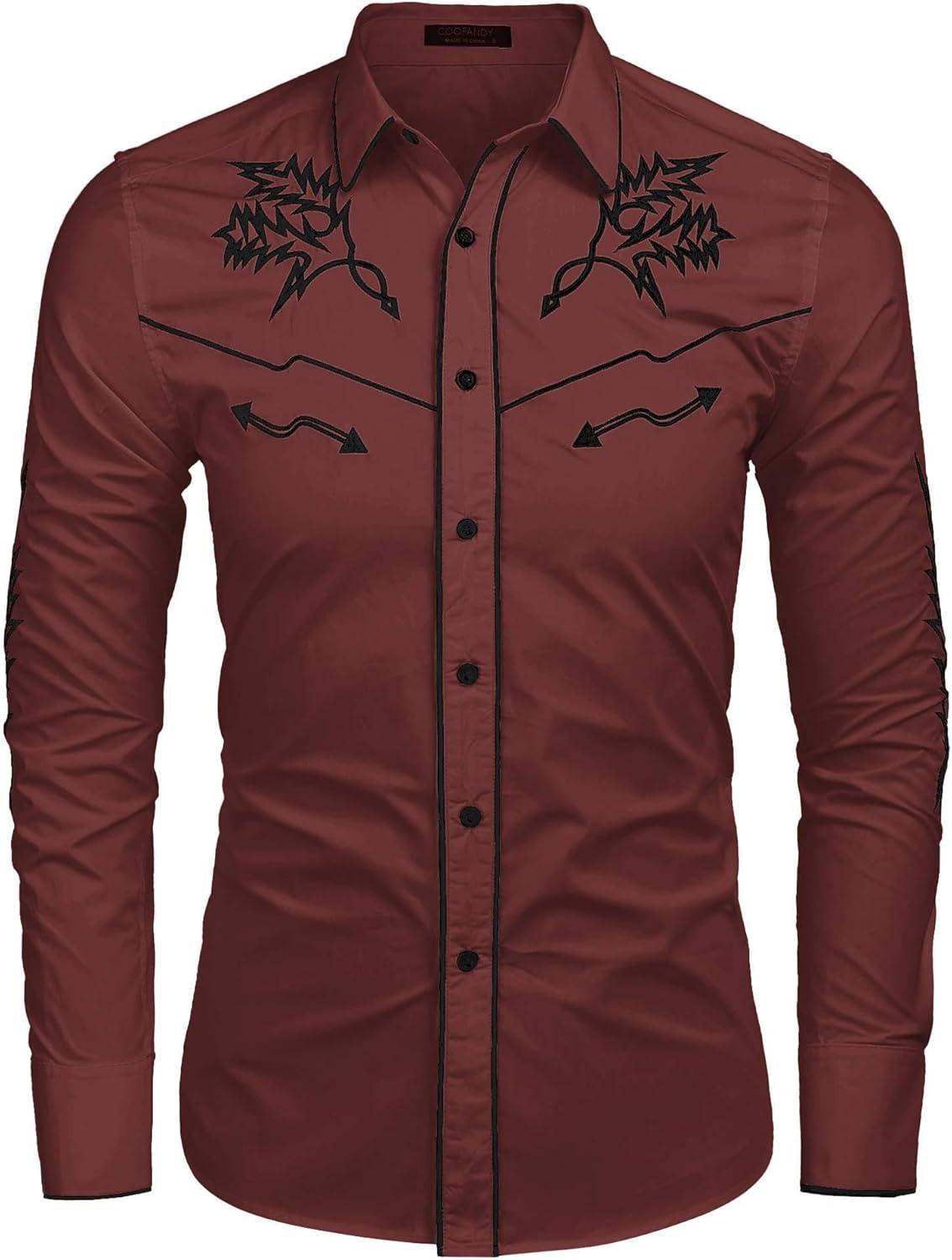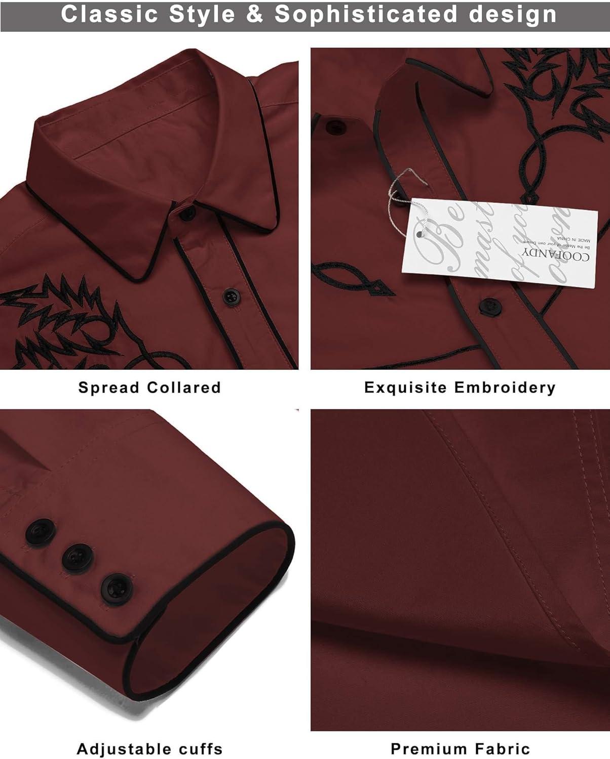 COOFANDY Men's Western Cowboy Shirt Long Sleeve Embroidered Shirt Slim Fit Cotton Casual Button Down Shirt(Wine Red)
