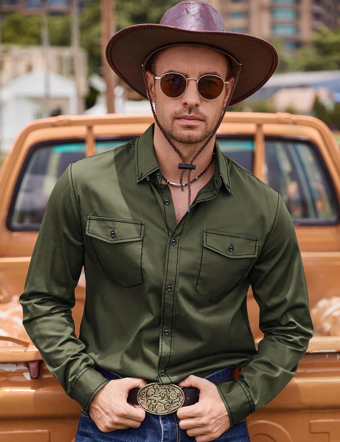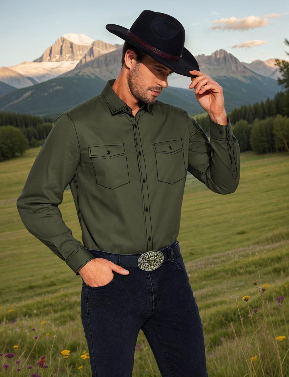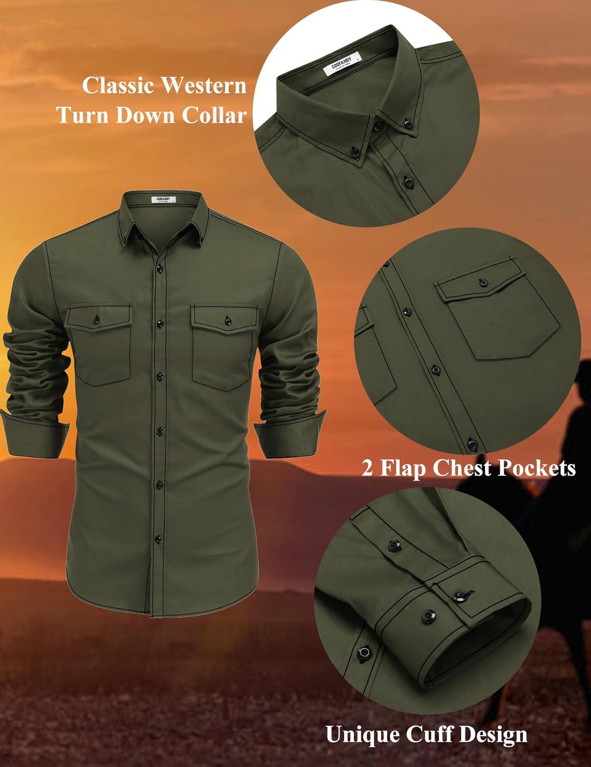 COOFANDY Mens Western Cowboy Shirts Cotton Long Sleeve Shirts with Two Pockets Embroidered(Army Green)