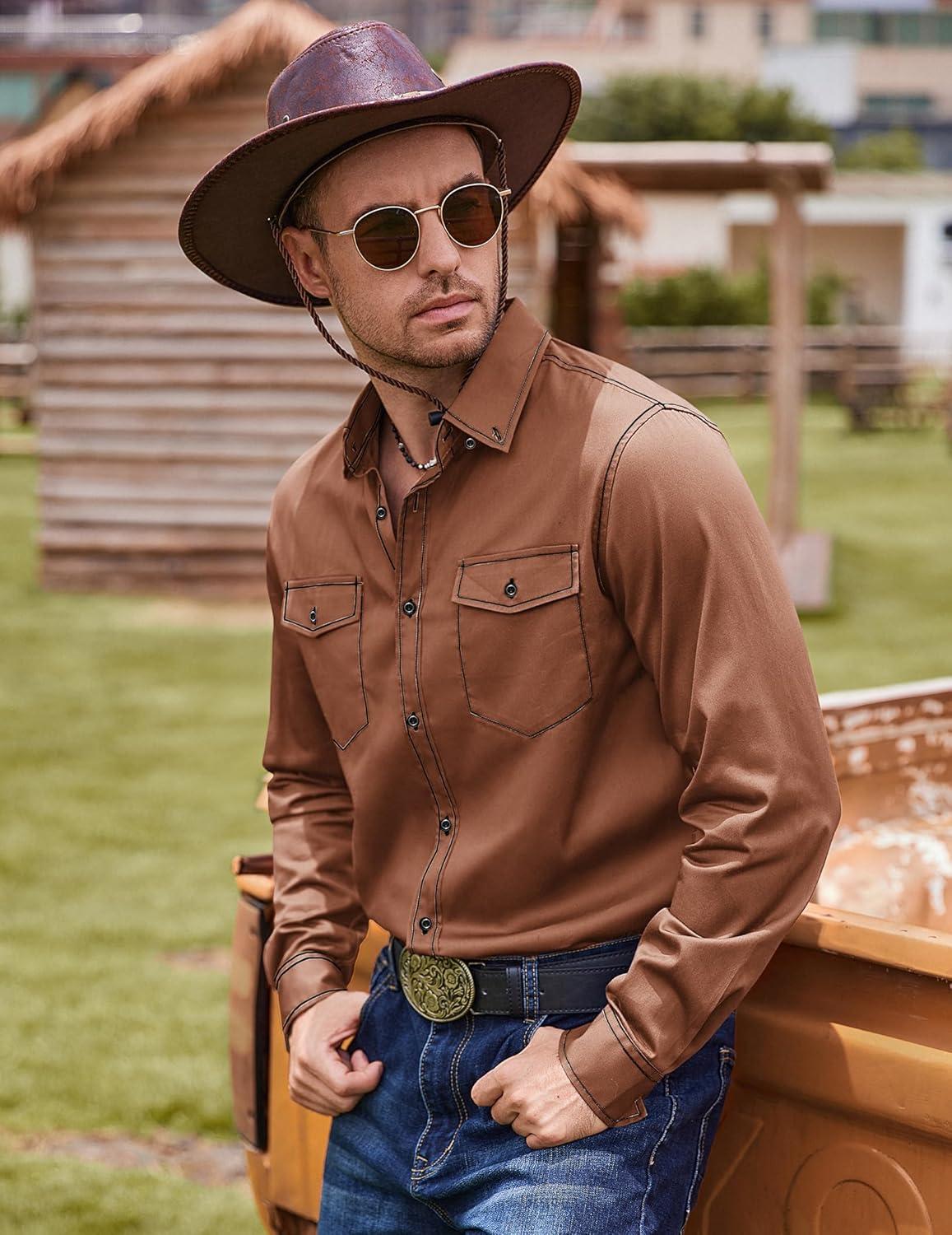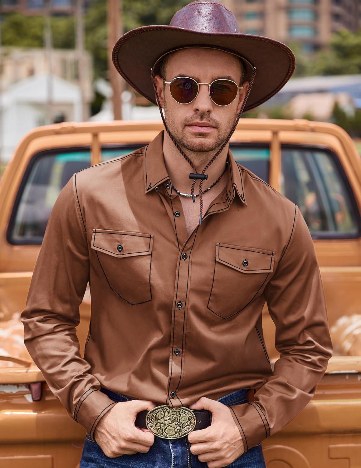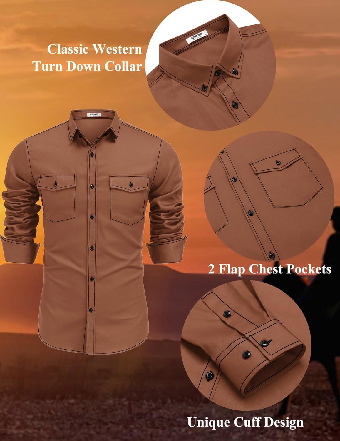 COOFANDY Mens western cowboy shirt casual long sleeve button down shirt with two pockets vintage cowboy button up shirts lightweight summer beach clothes for men autumn evening