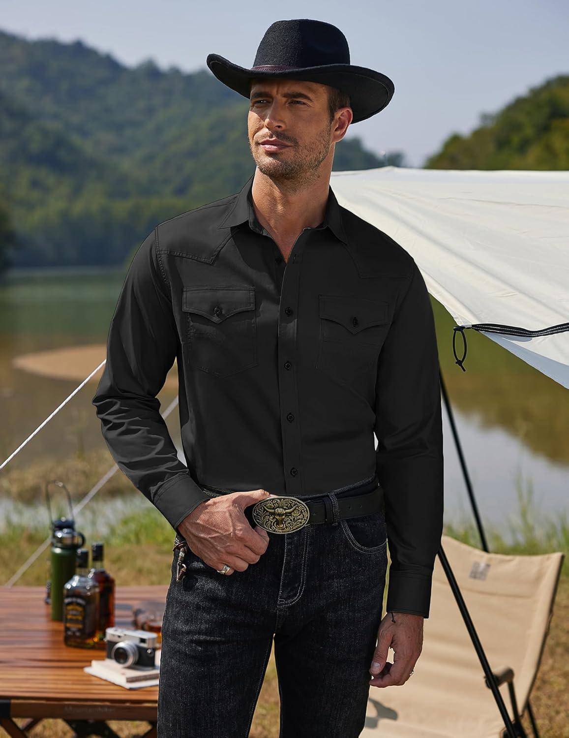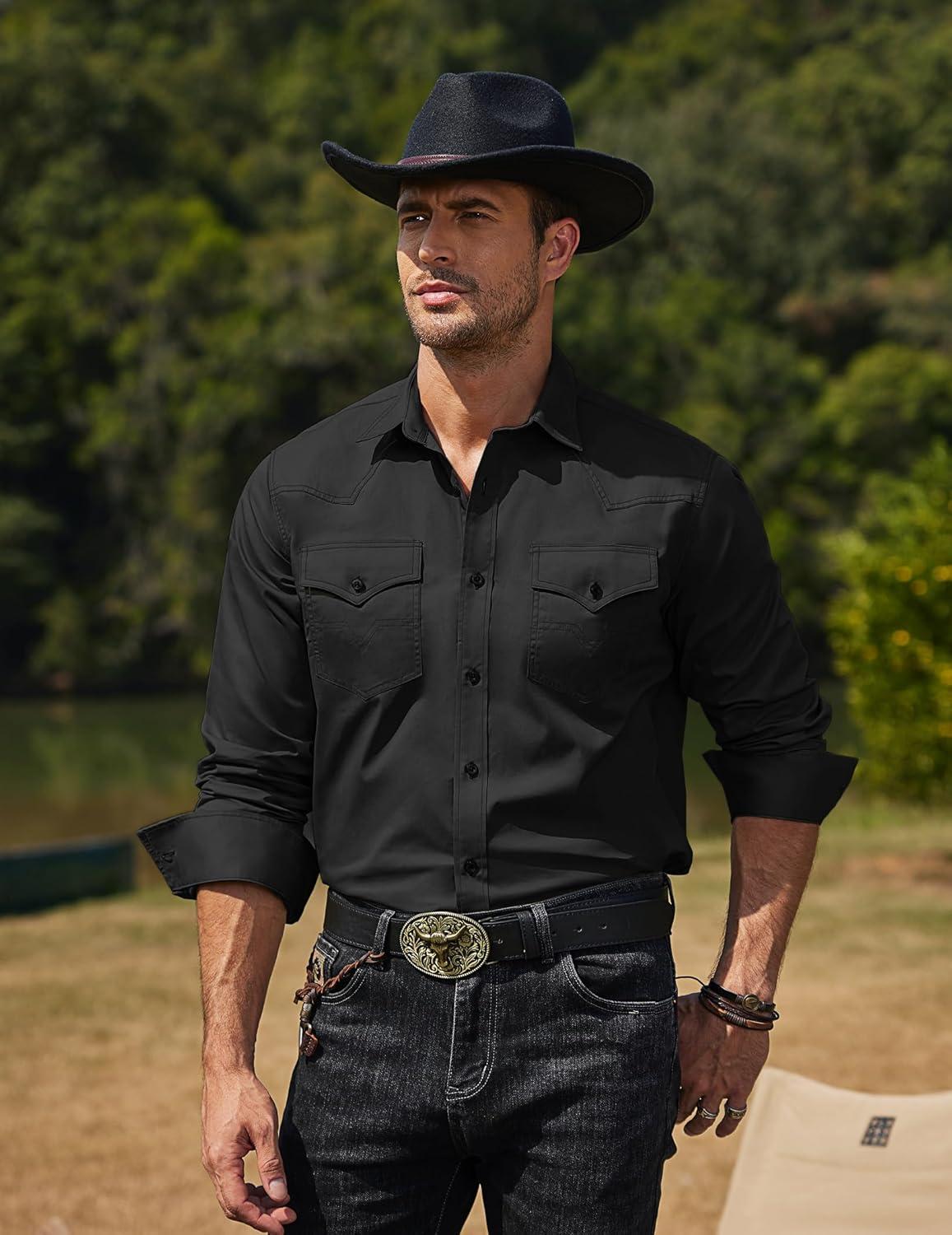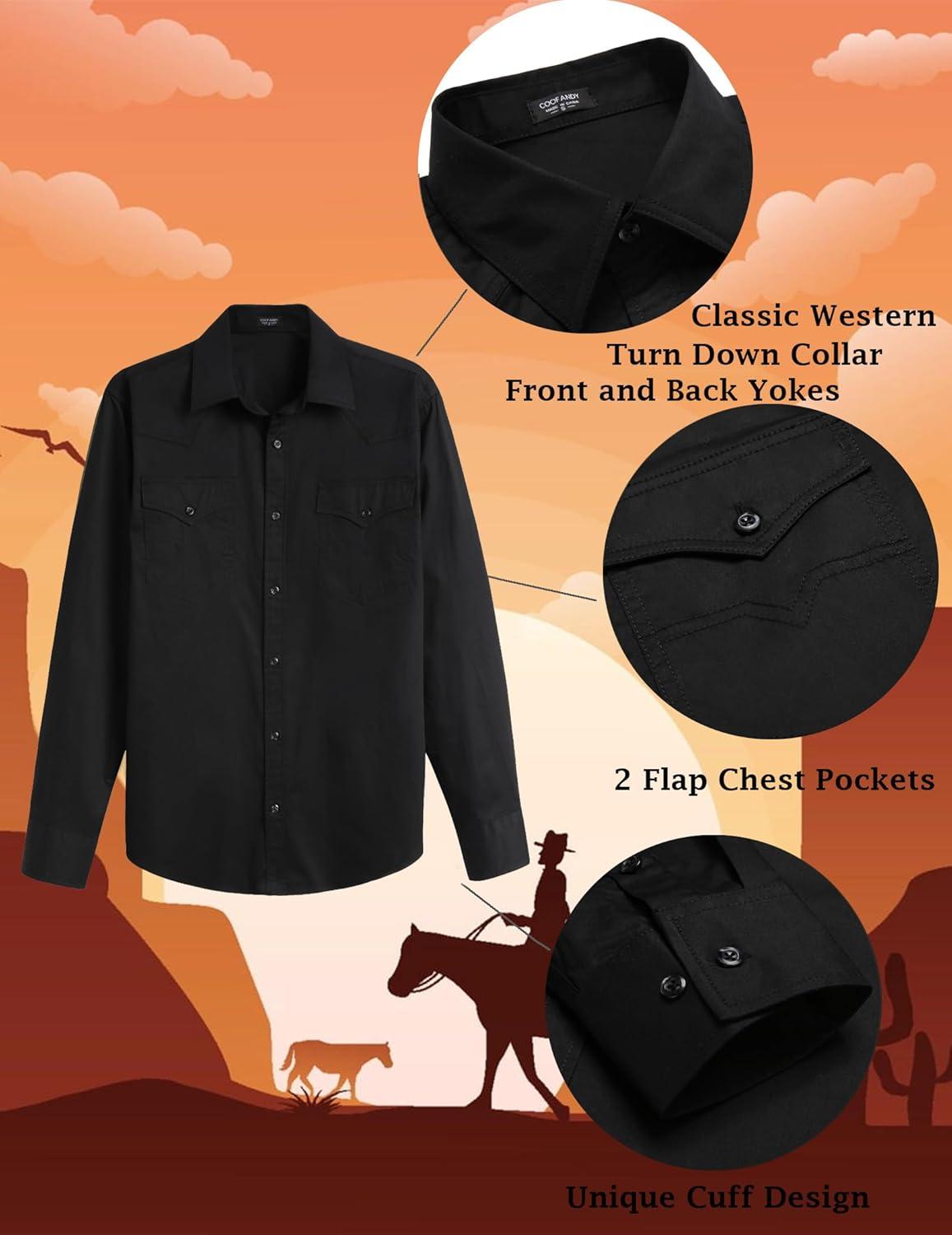 COOFANDY Men's Western Cowboy Shirts Long Sleeve Cotton Casual Button Down Work Shirt with Pockets(Solid Black)