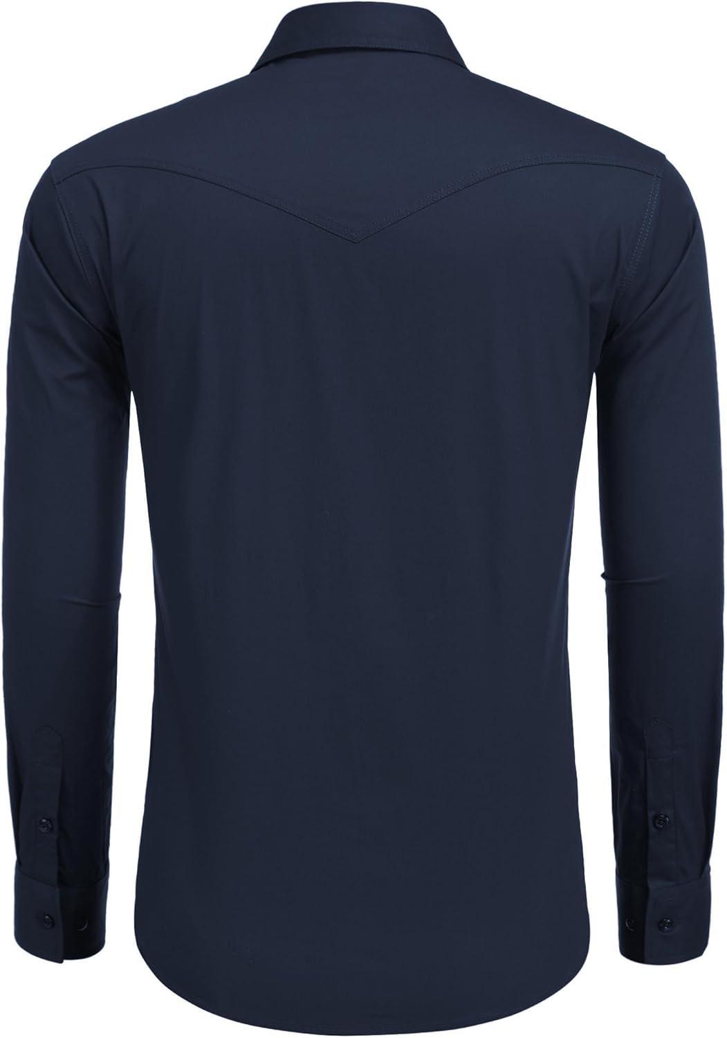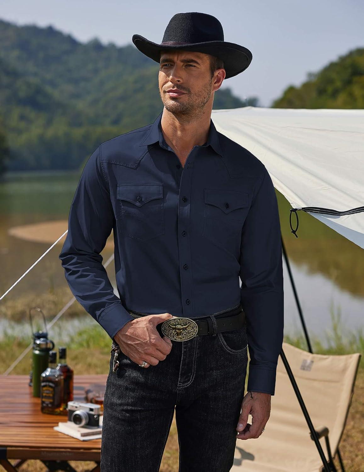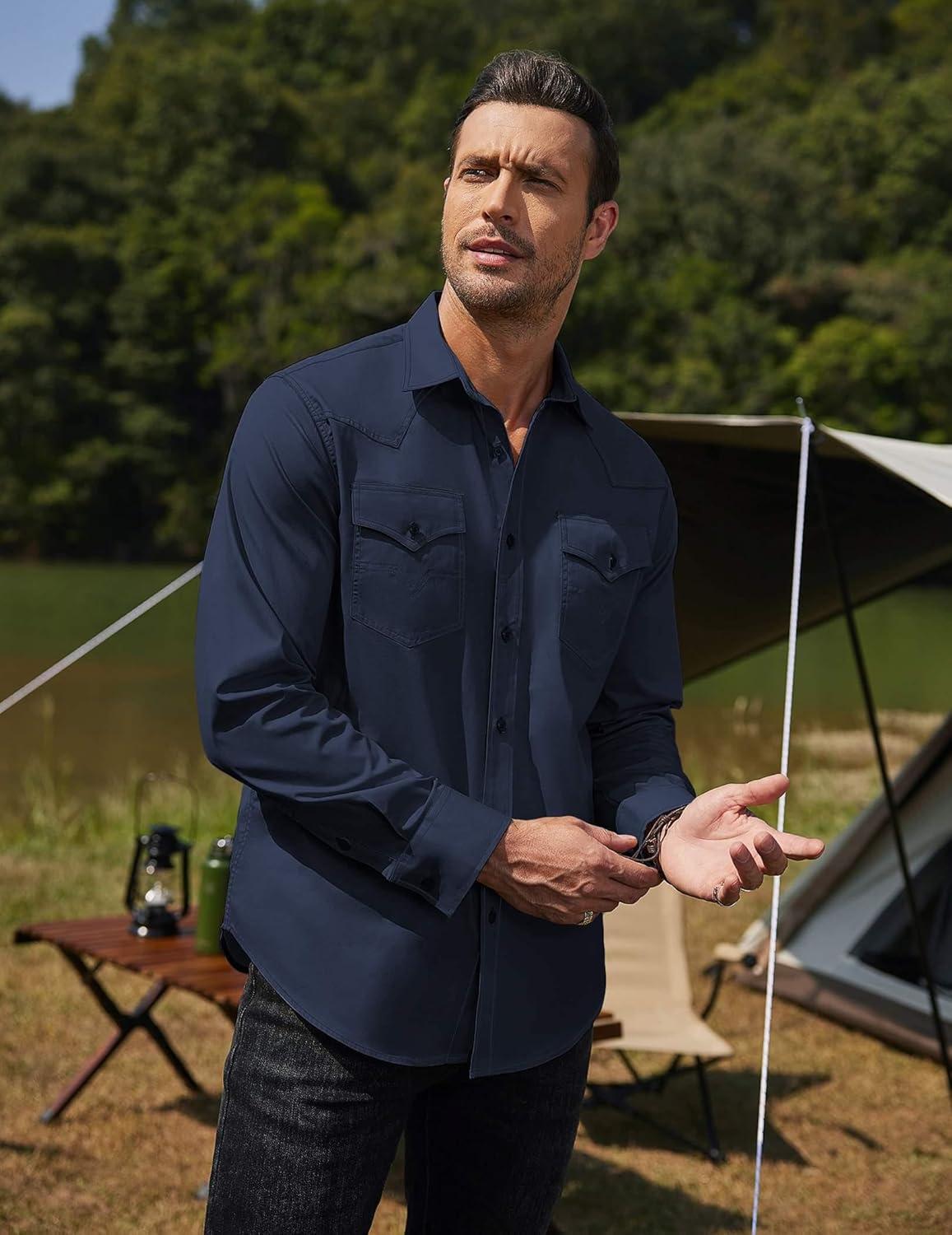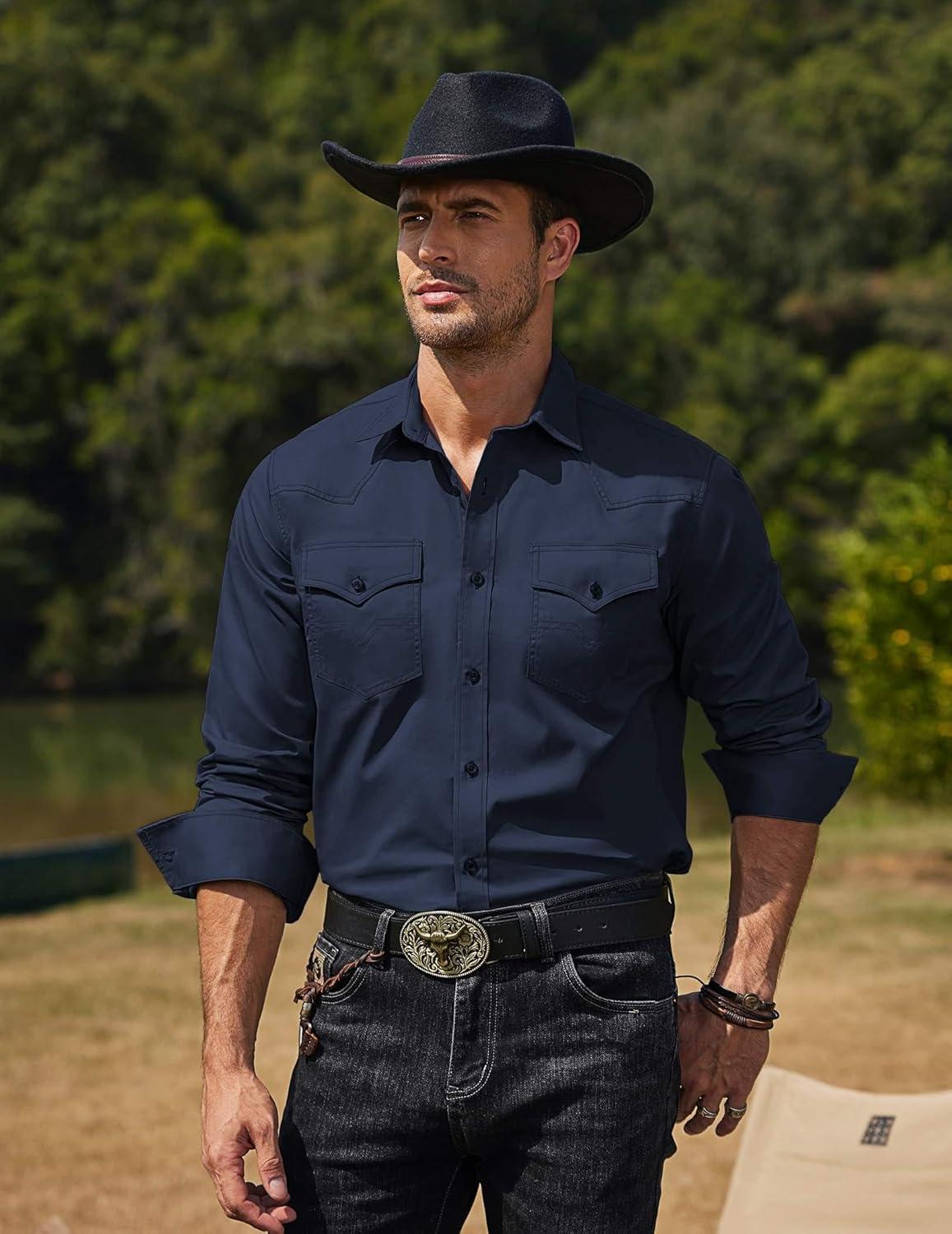 COOFANDY Men's Western Cowboy Shirts Long Sleeve Cotton Casual Button Down Work Shirt with Pockets(Solid Deep Blue)