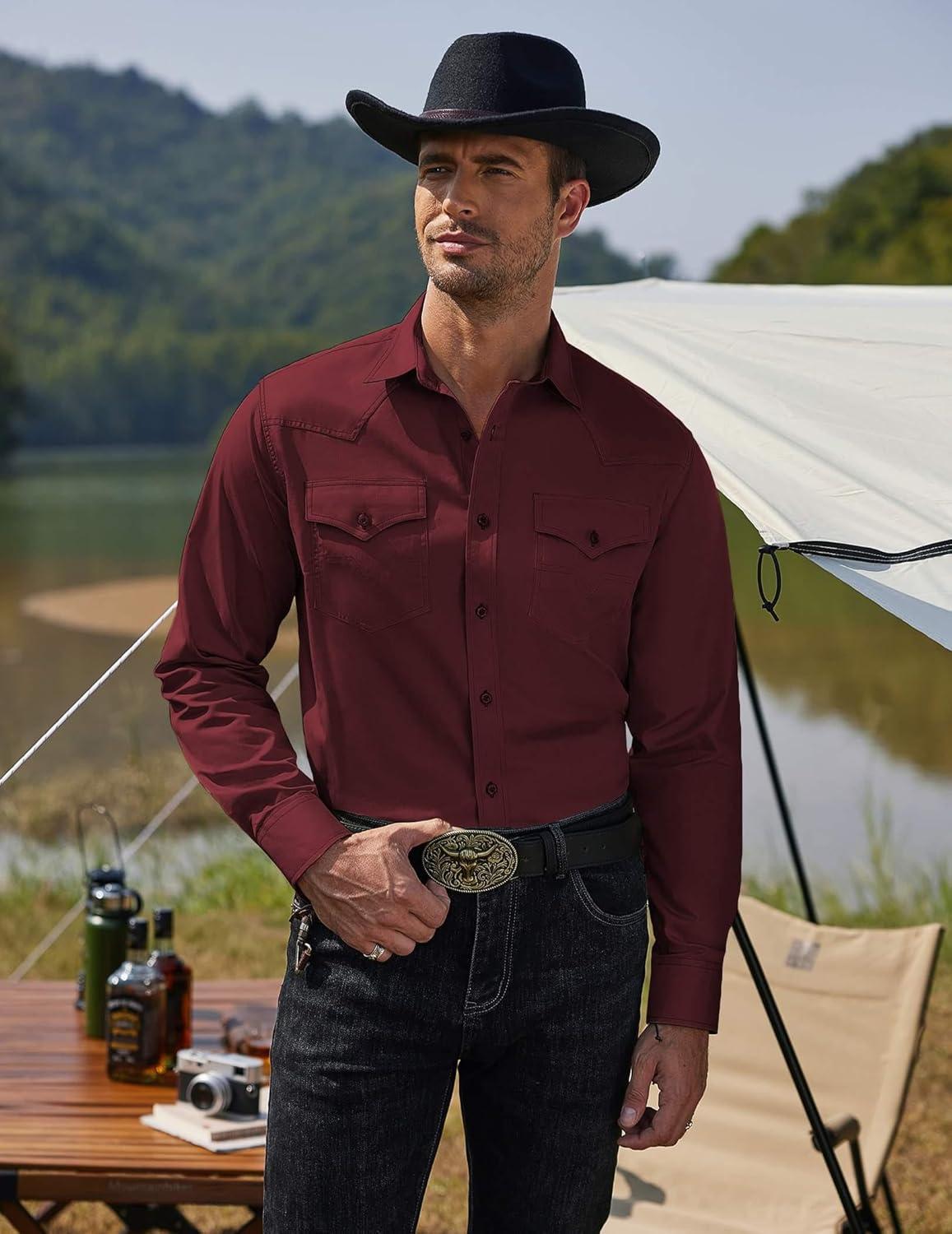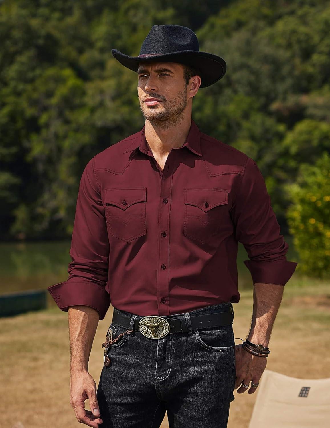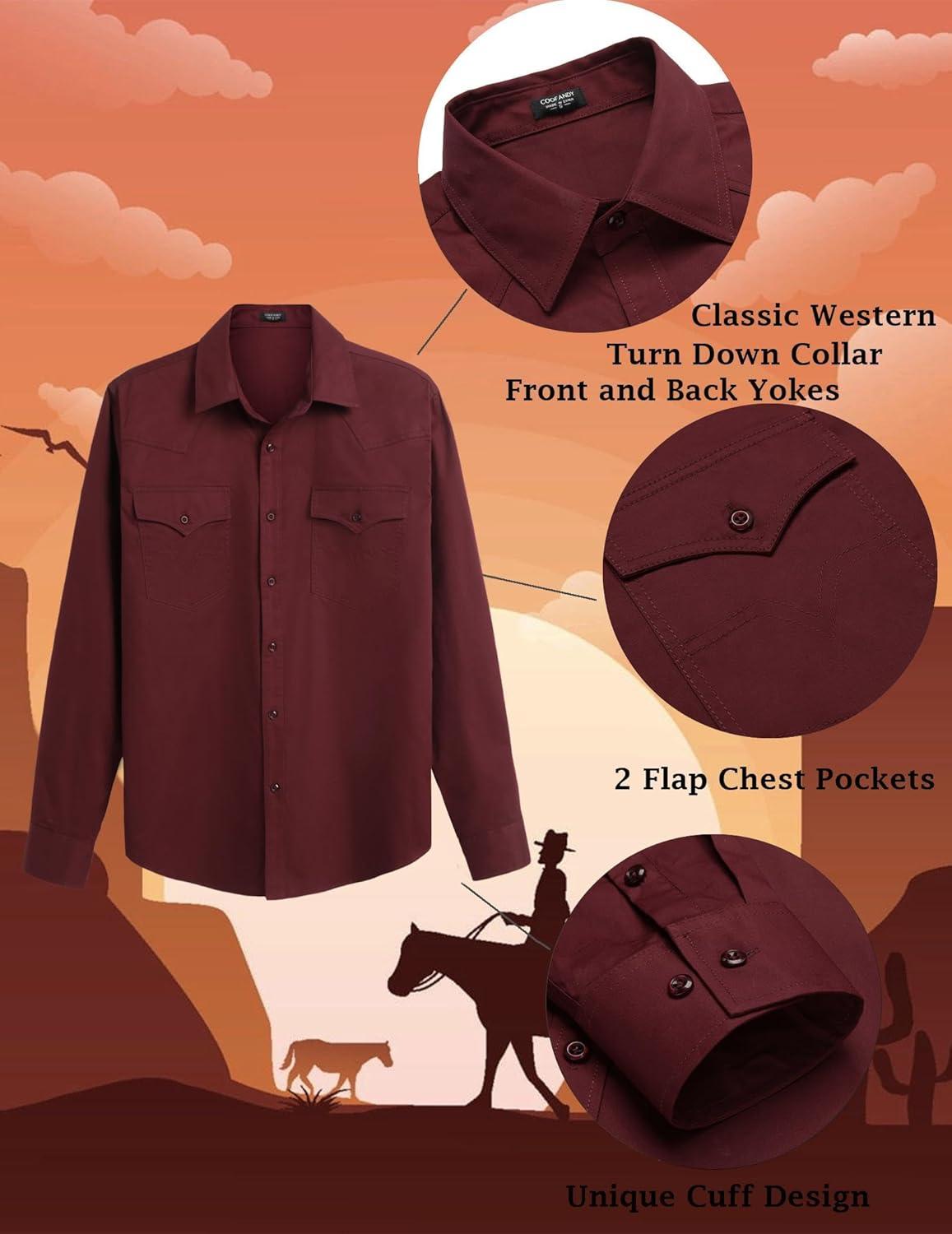 Get up to 60% off on COOFANDY Men’s Western Cowboy Shirts Long Sleeve Cotton Casual Button Down Work Shirt with Pockets(Solid Wine Red) styles during our winter sale event.