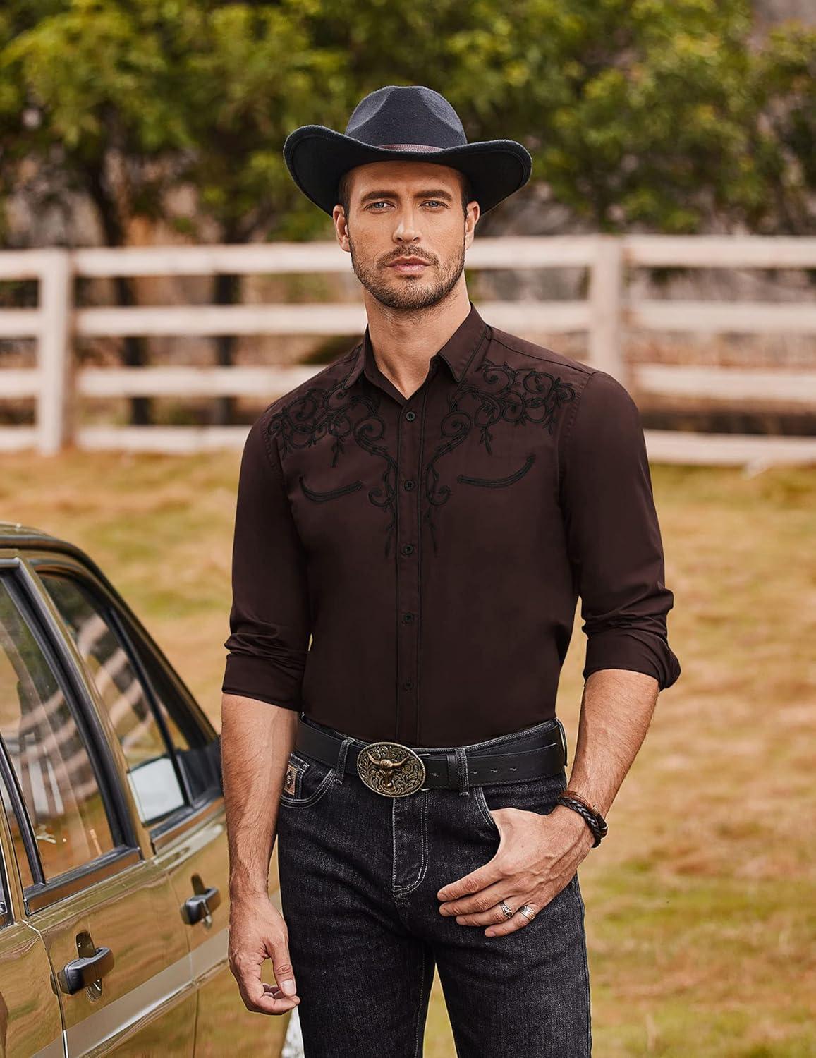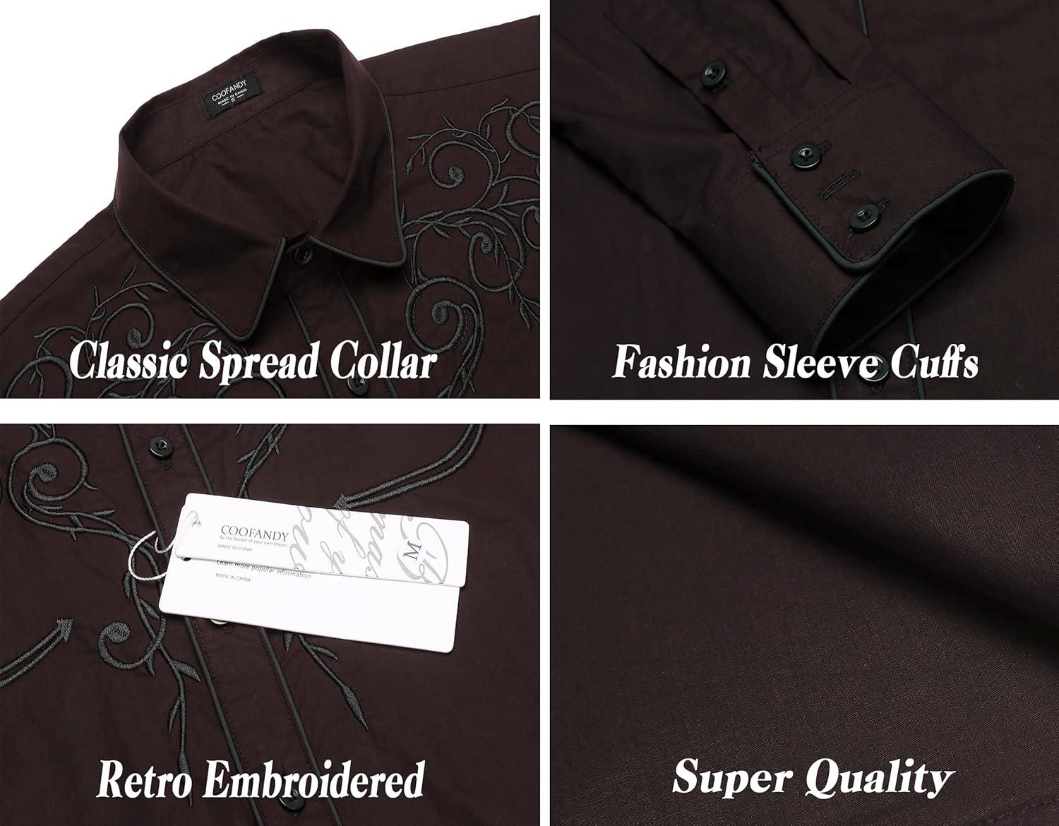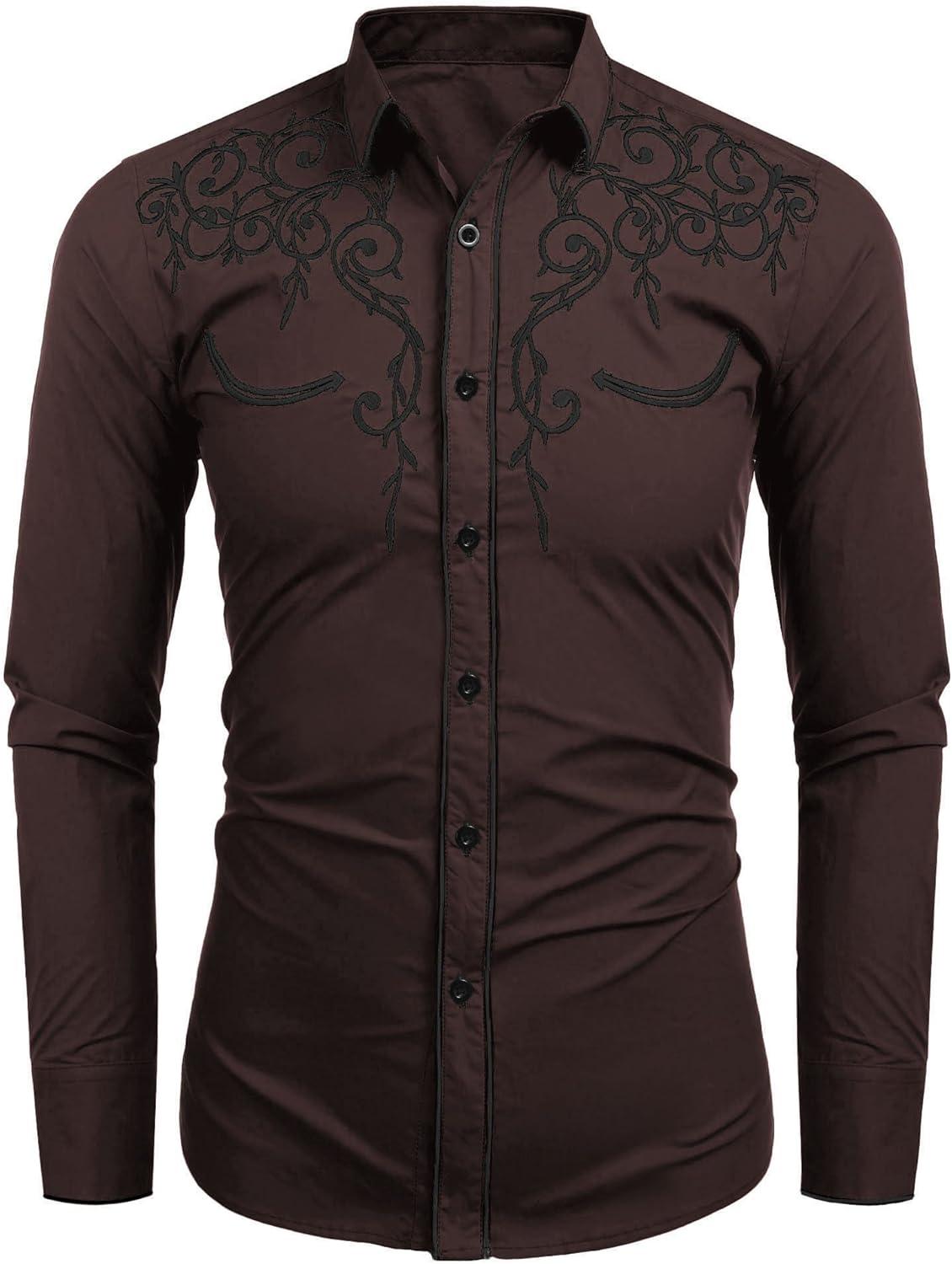 COOFANDY Men's Western Cowboy Shirts Long Sleeve Embroidered Shirt Slim Fit Casual Button Down Shirts(Brown)