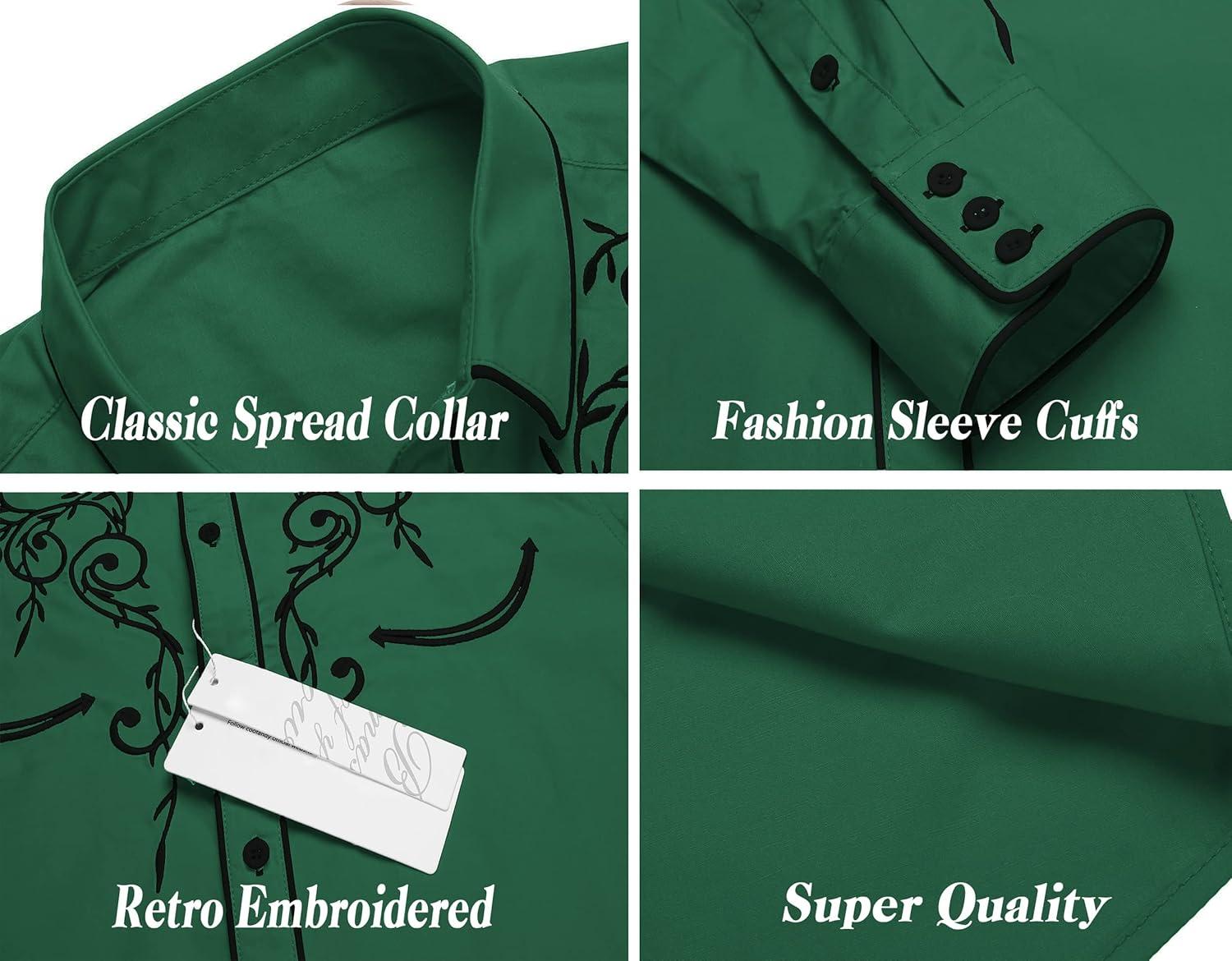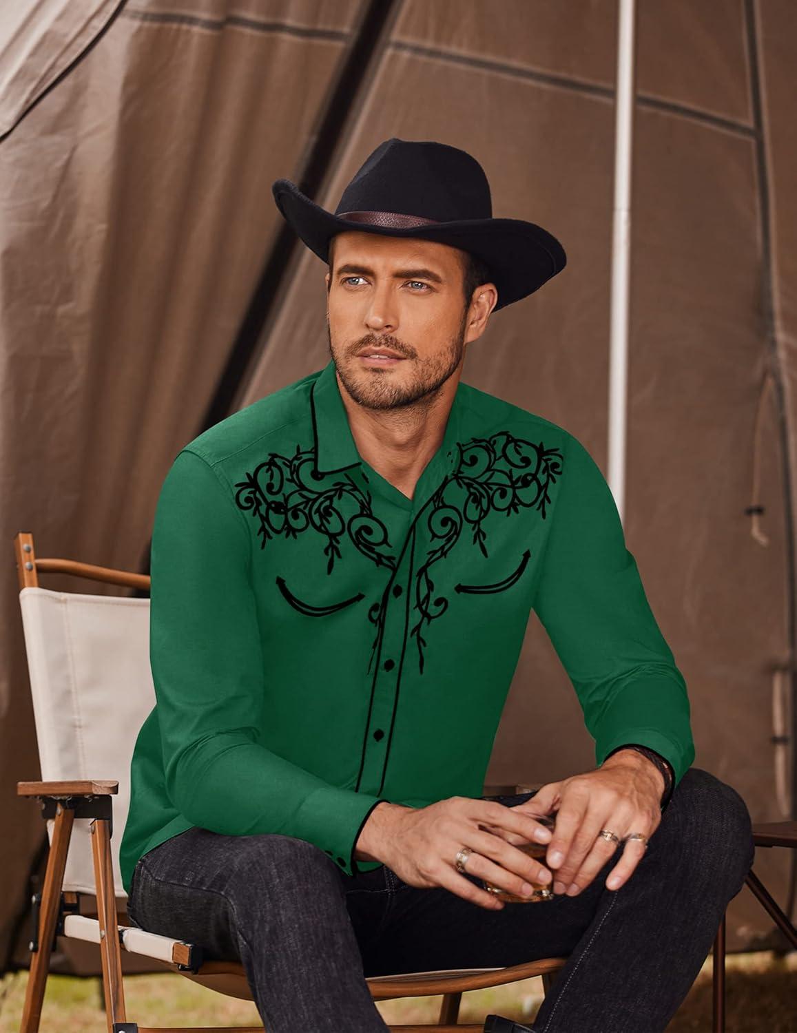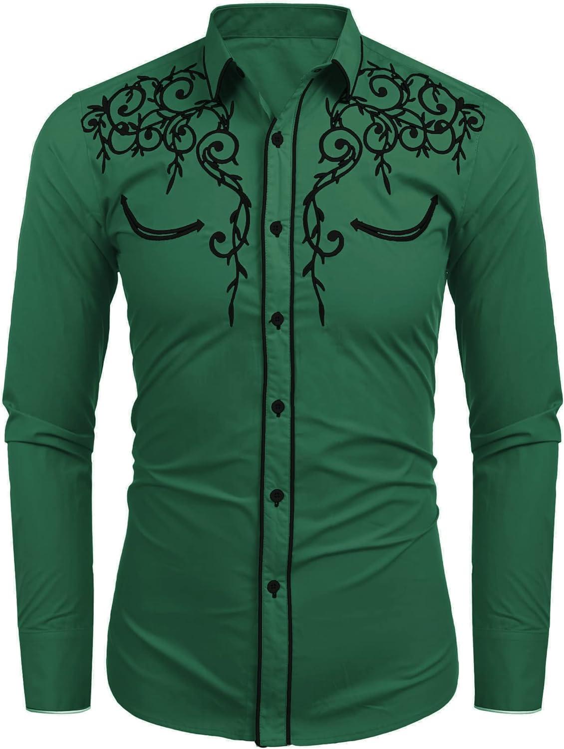 COOFANDY Men's Western Cowboy Shirts Long Sleeve Embroidered Shirt Slim Fit Casual Button Down Shirts(Dark Green)