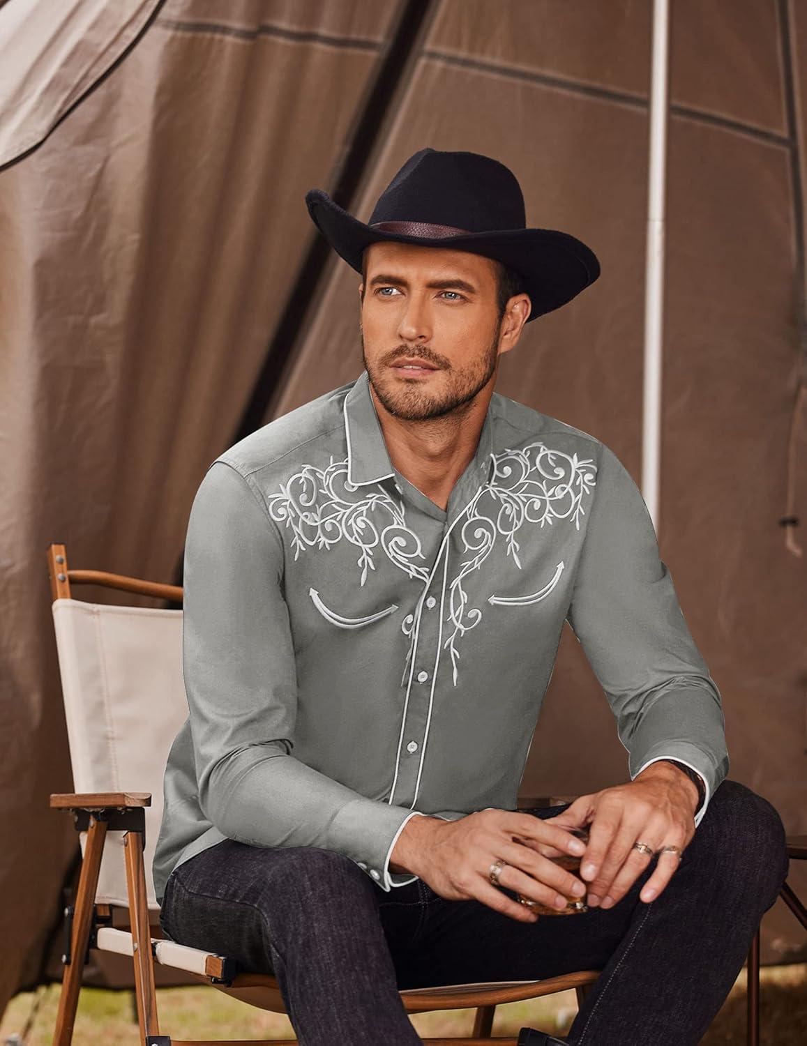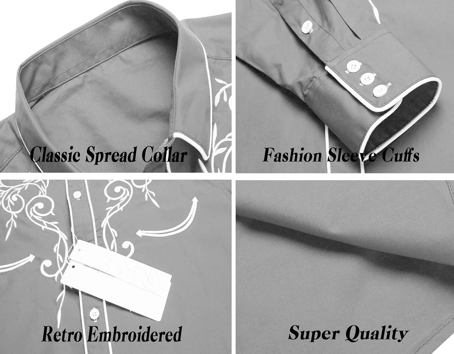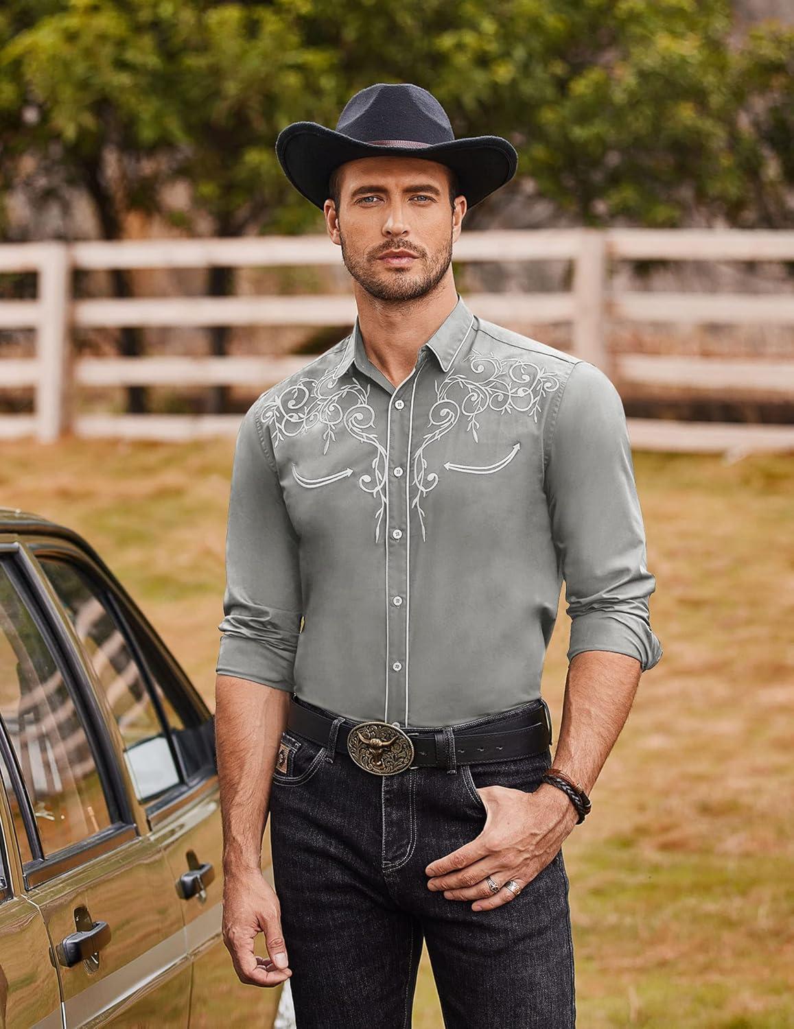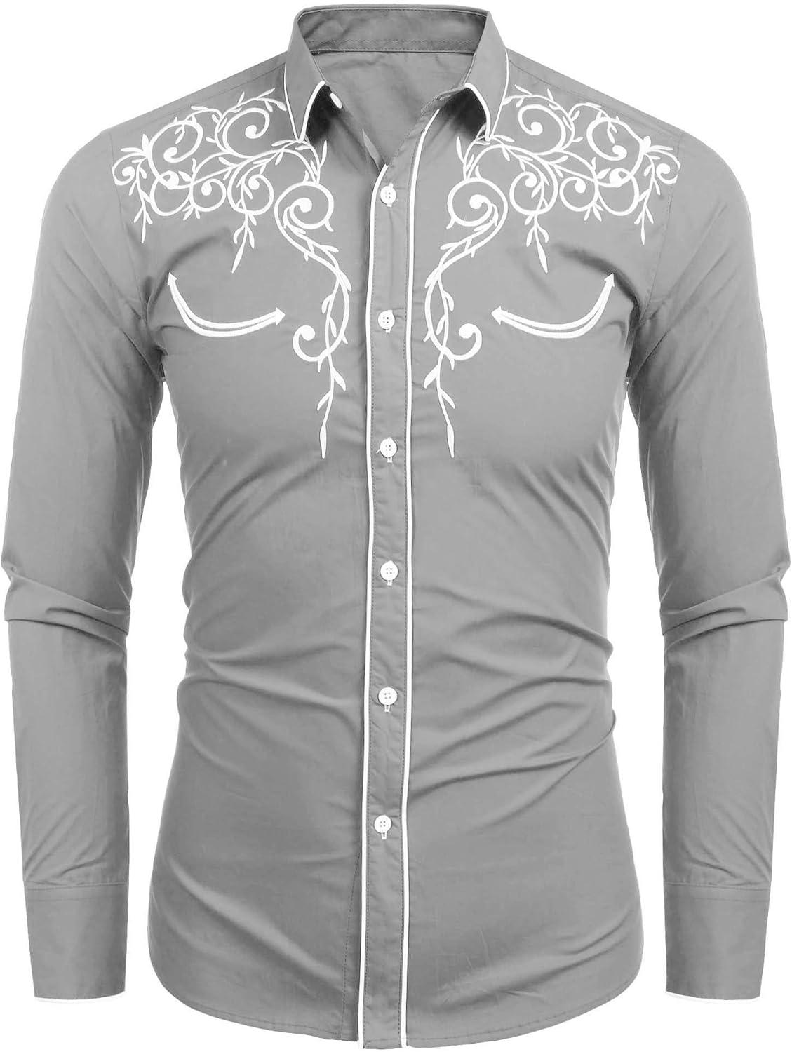 COOFANDY Men's Western Cowboy Shirts Long Sleeve Embroidered Shirt Slim Fit Casual Button Down Shirts(Grey)