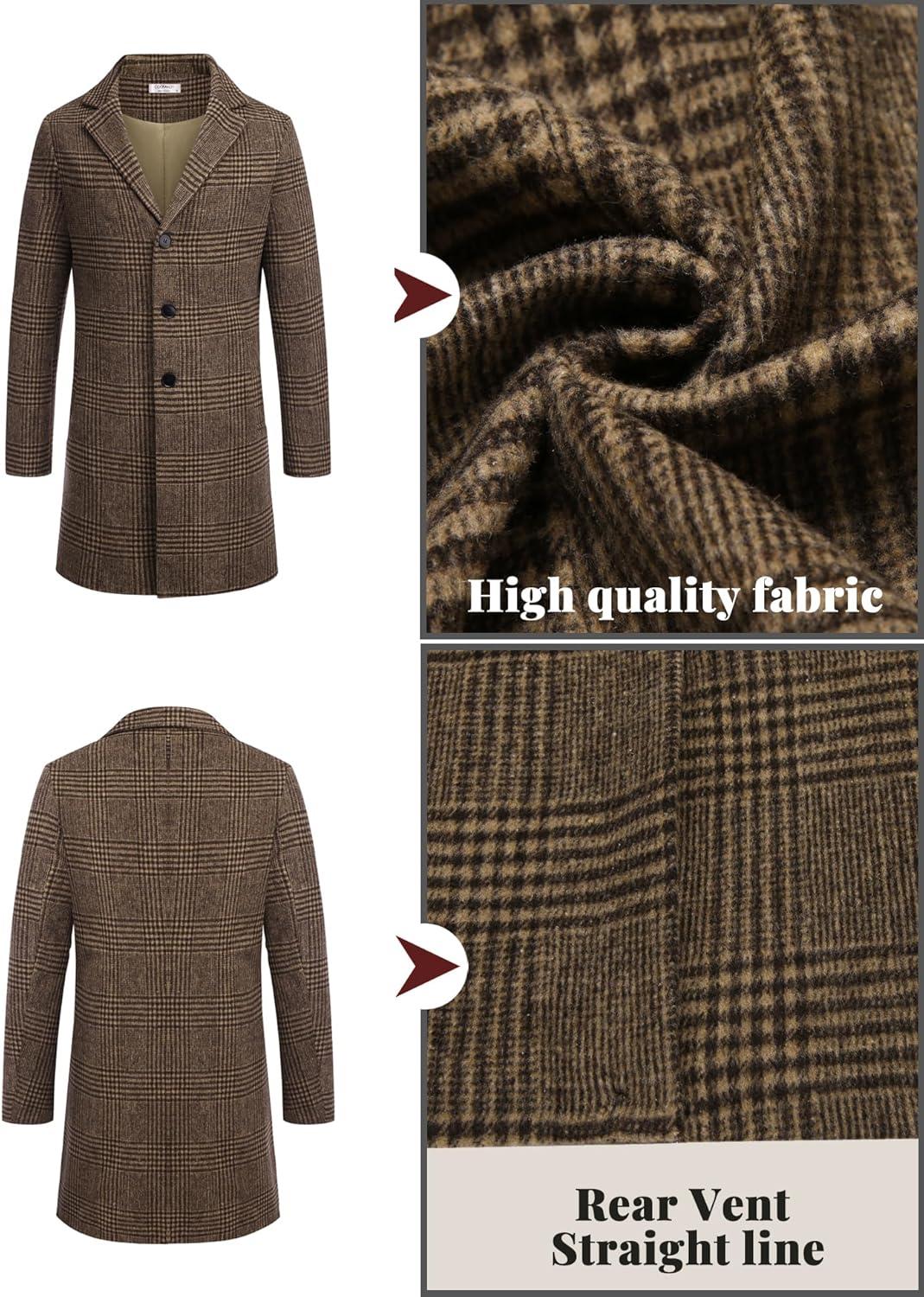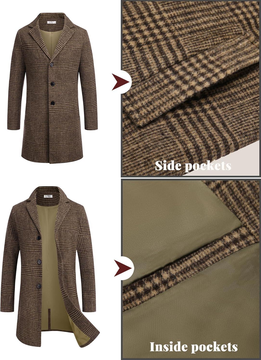 COOFANDY Mens Wool Blend Coat Winter Trench Coats Notched Lapel Collar Single Breasted Overcoat Classic Peacoat With Pockets(Brown Plaid)