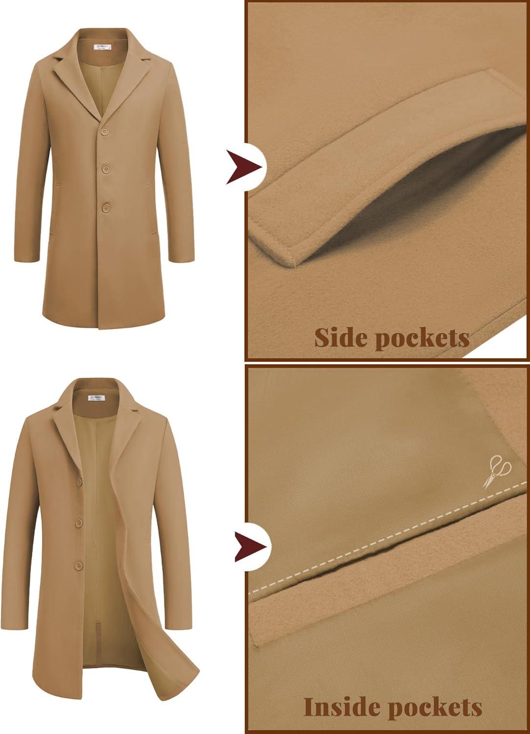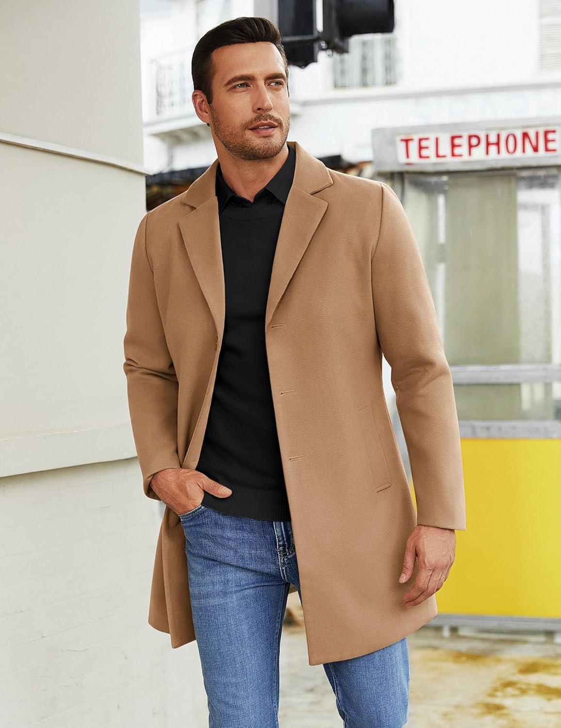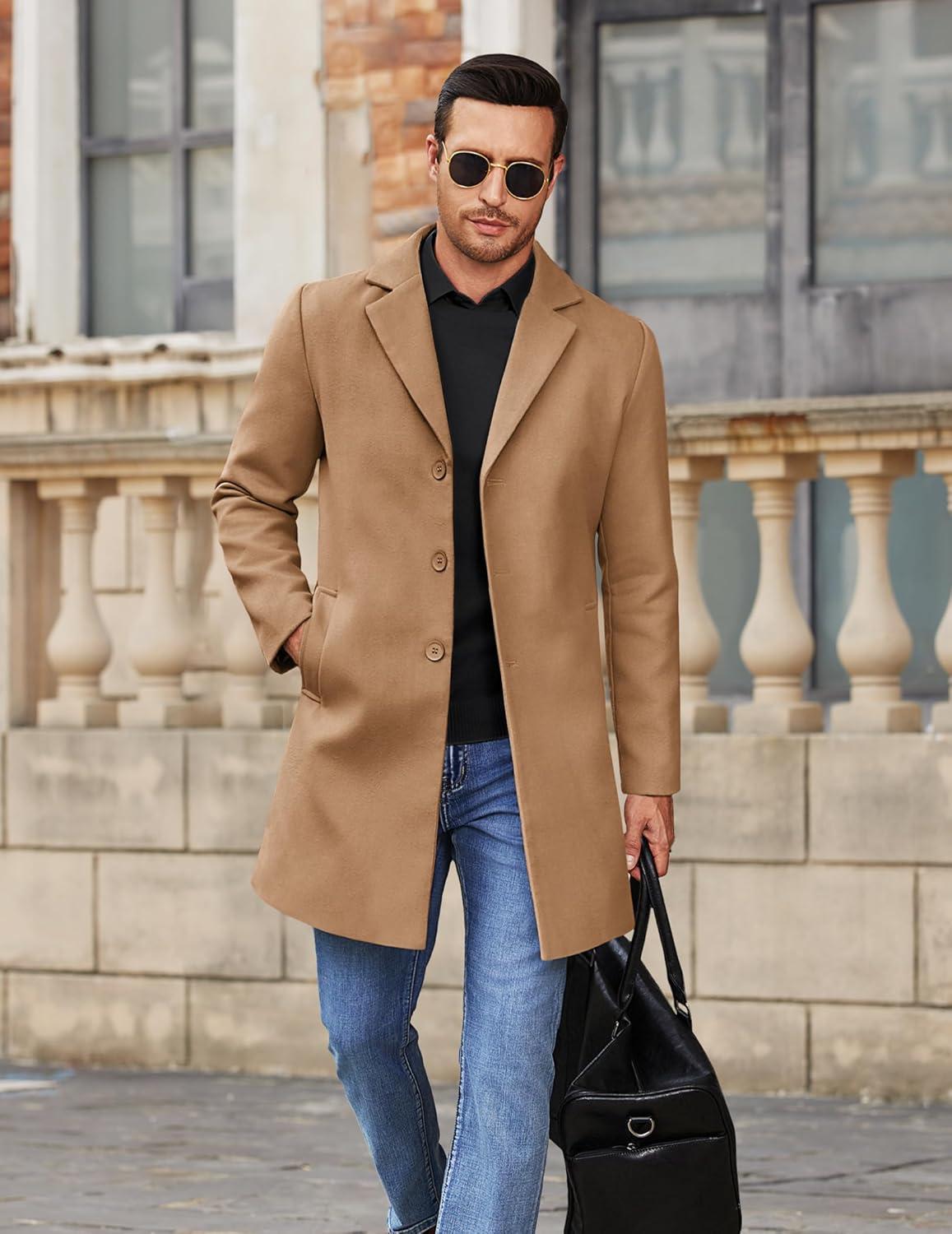 COOFANDY Mens Wool Blend Coat Winter Trench Coats Notched Lapel Collar Single Breasted Overcoat Classic Peacoat With Pockets(Camel)