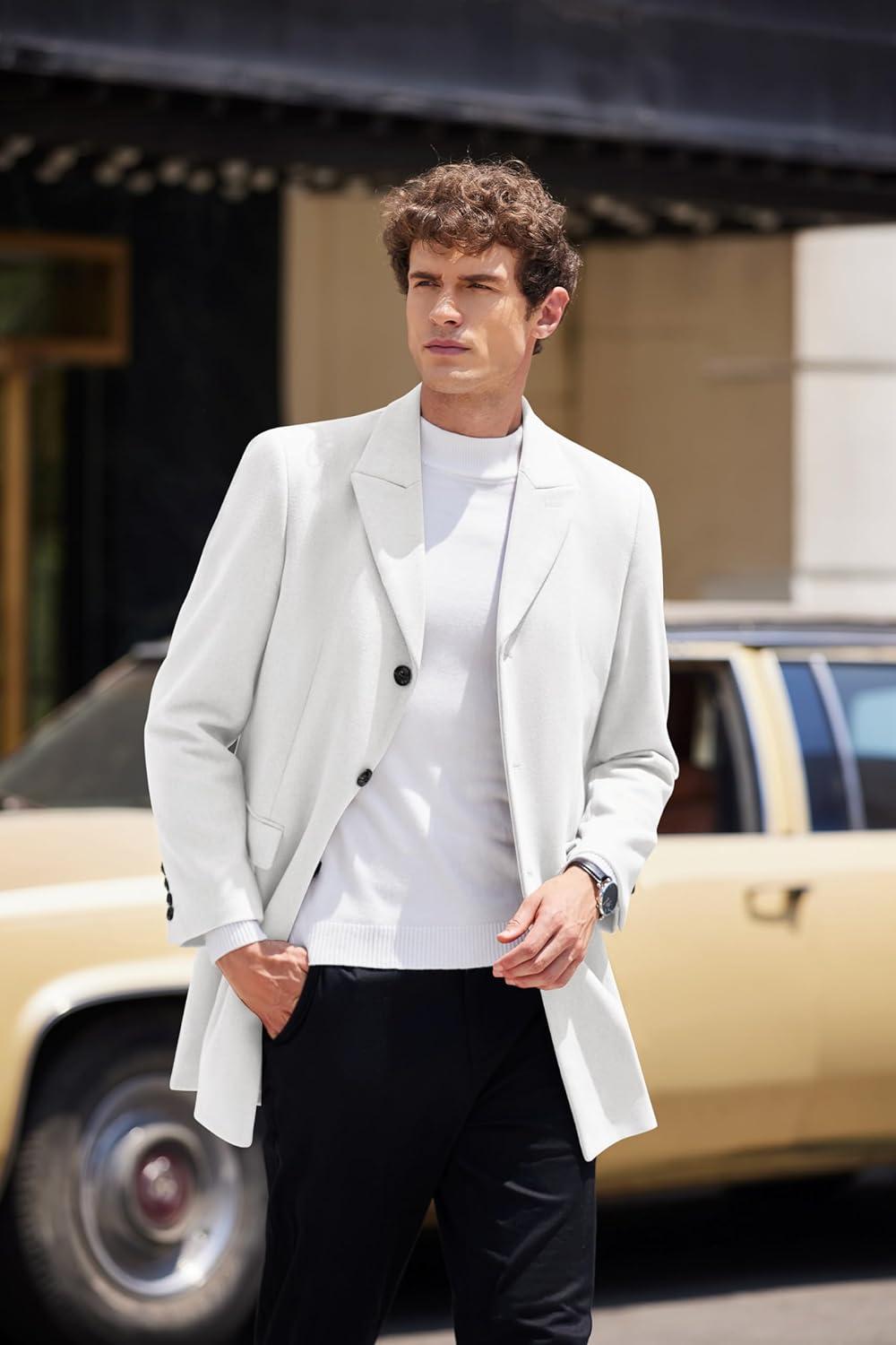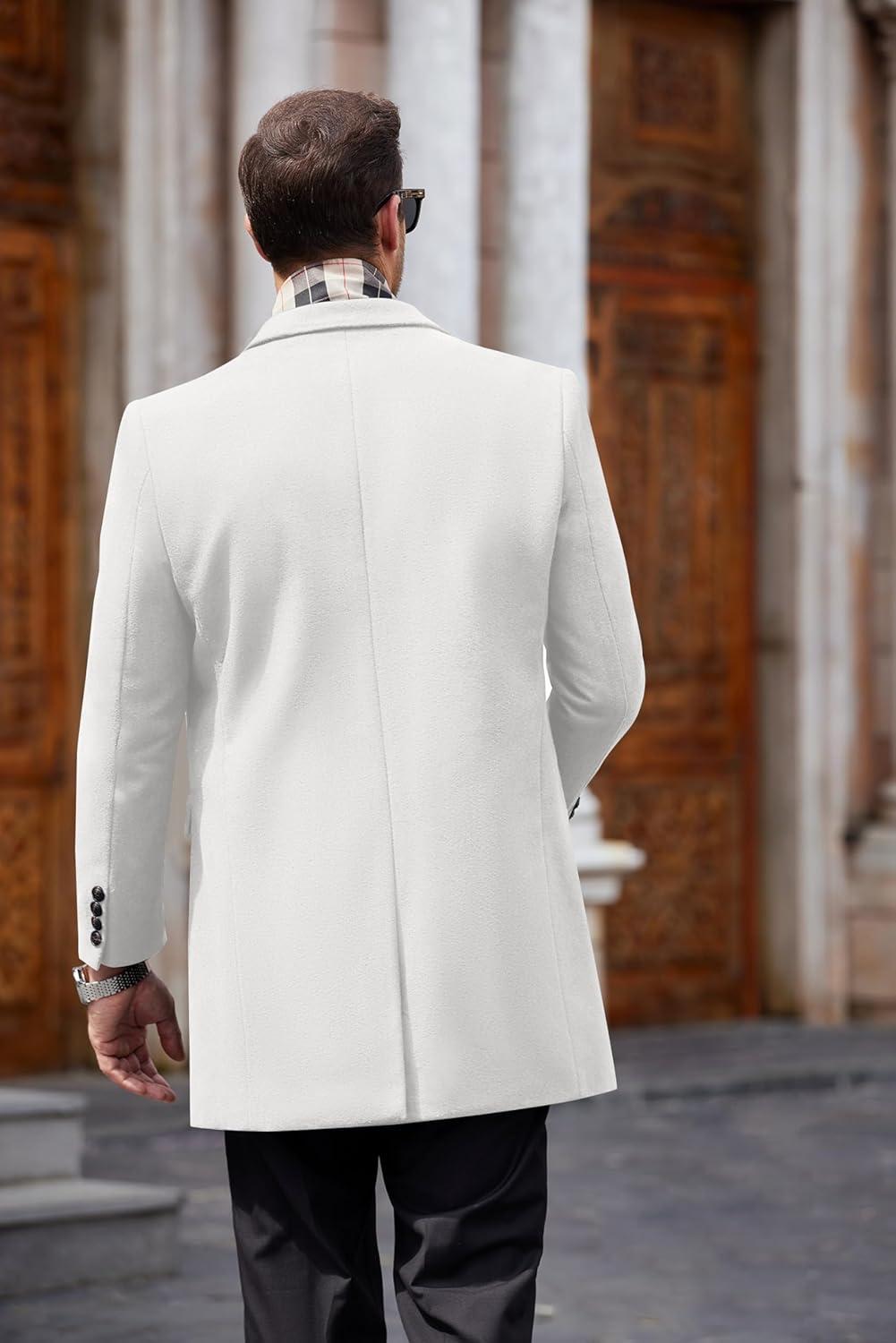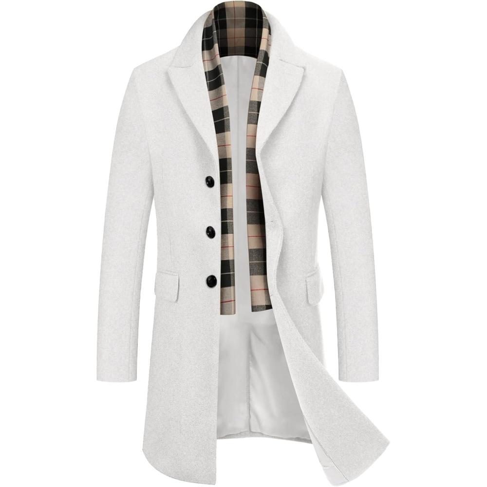 COOFANDY Men's Wool Blend Coat with Detachable Plaid Scarfs Notched Collar Single Breasted Pea Coat Trench Overcoat(White)