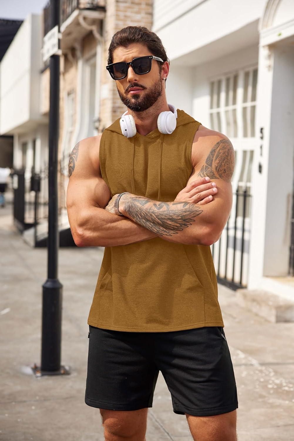 COOFANDY Men’s Workout Hooded Tank Tops Bodybuilding Muscle Cut Off T Shirt Sleeveless Gym Hoodies(Brown)