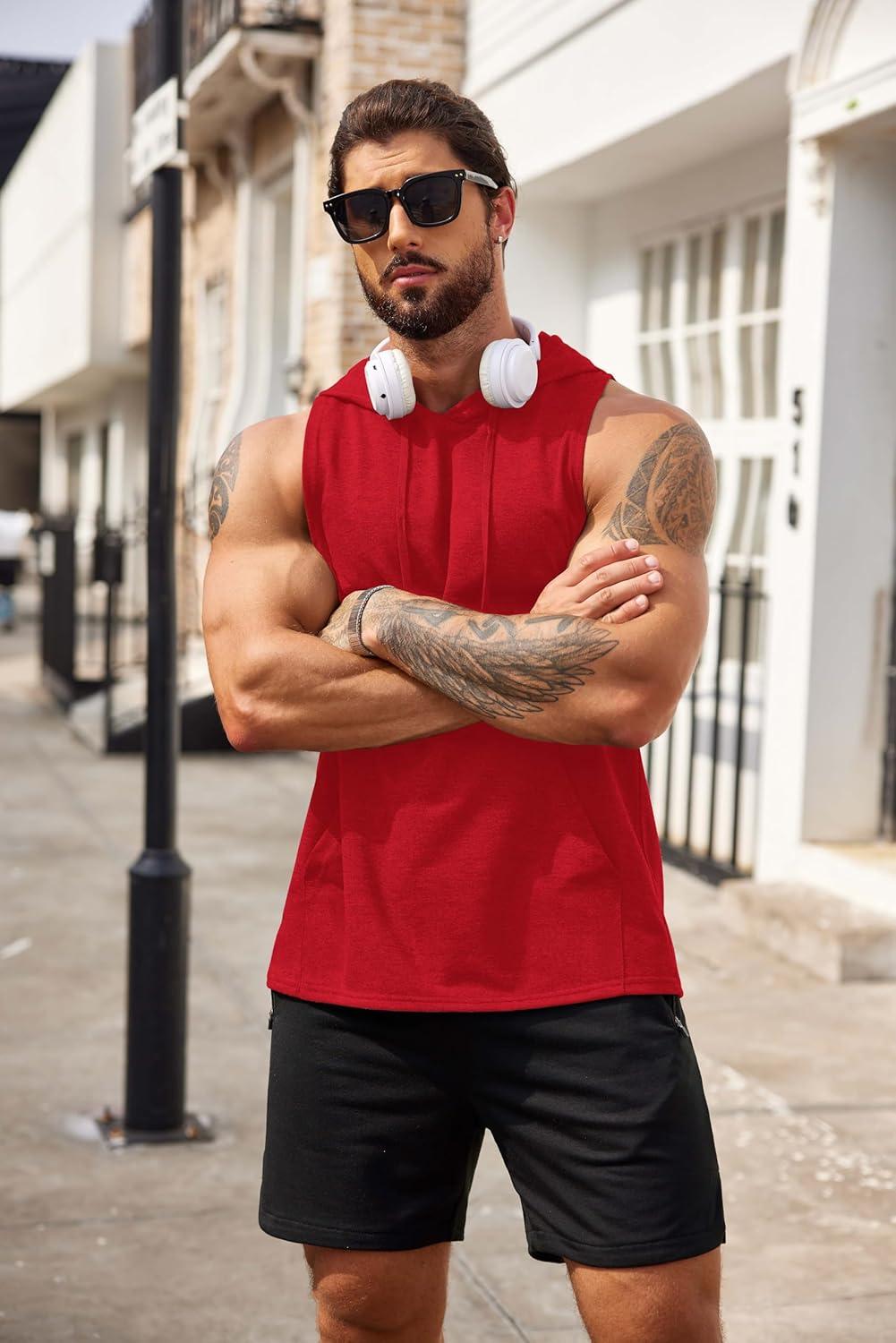 COOFANDY Men's Workout Hooded Tank Tops Bodybuilding Muscle Cut Off T Shirt Sleeveless Gym Hoodies(Red)