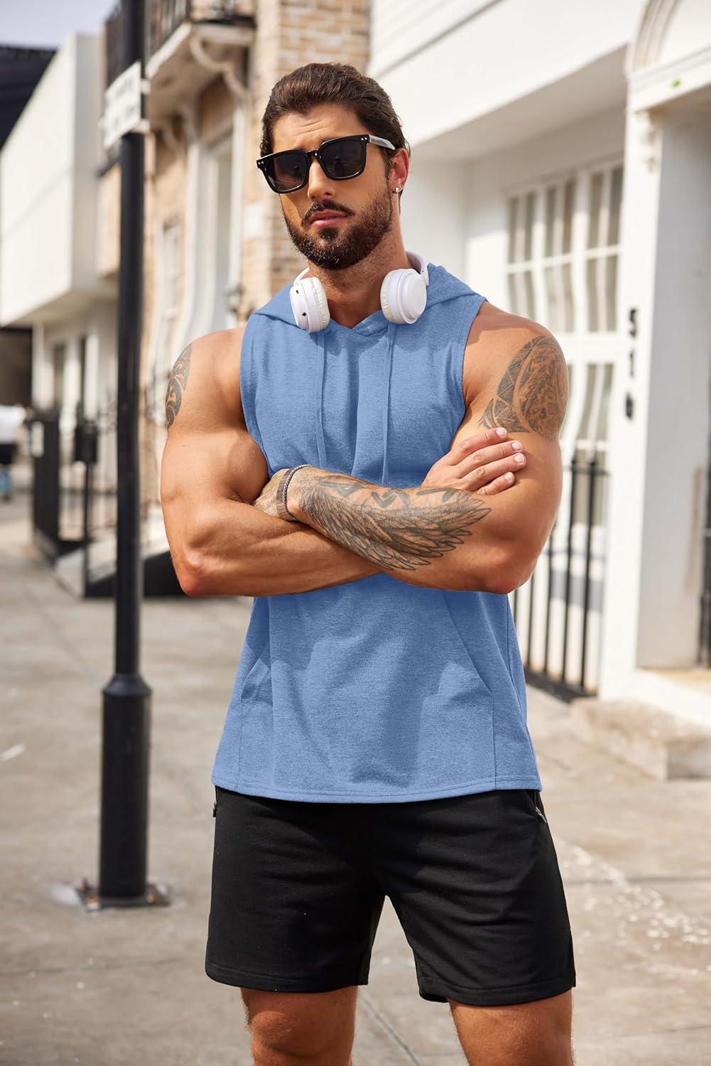 COOFANDY Men's Workout Hooded Tank Tops Bodybuilding Muscle Cut Off T Shirt Sleeveless Gym Hoodies(Sky Blue)