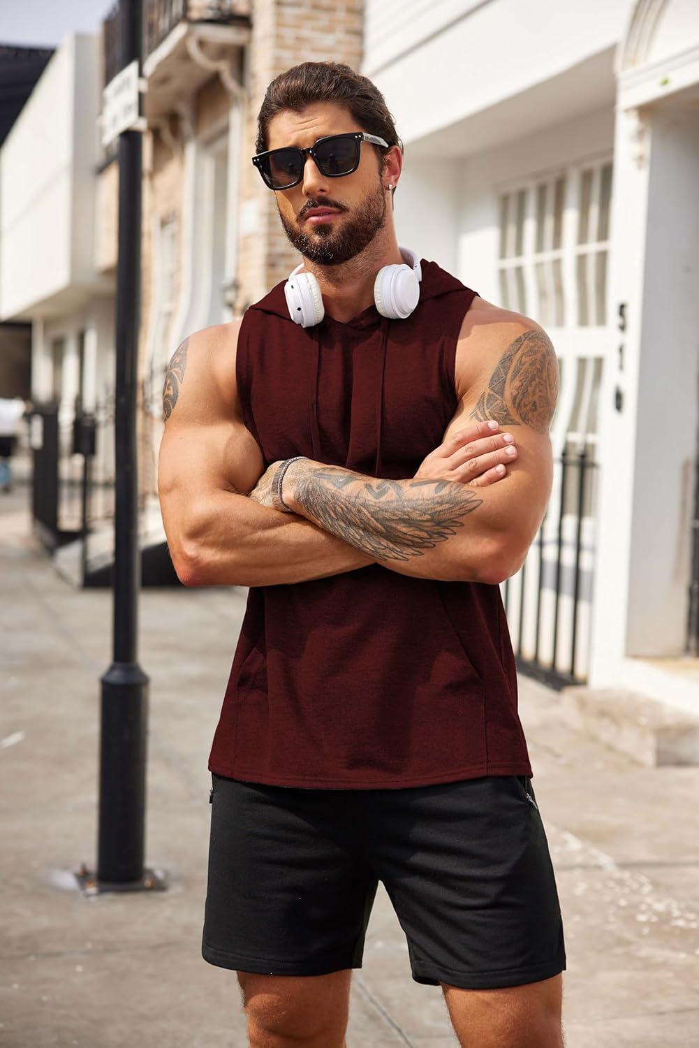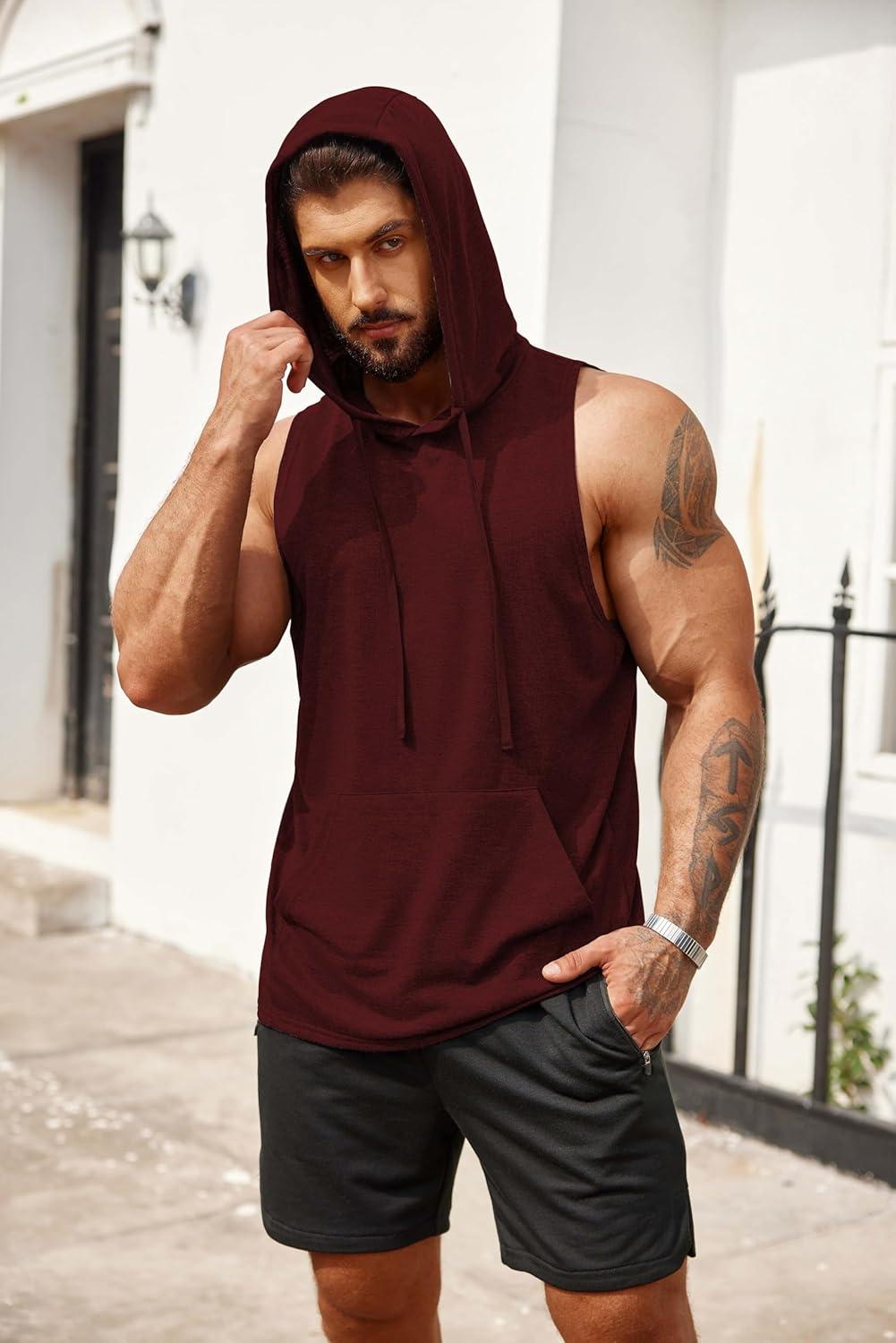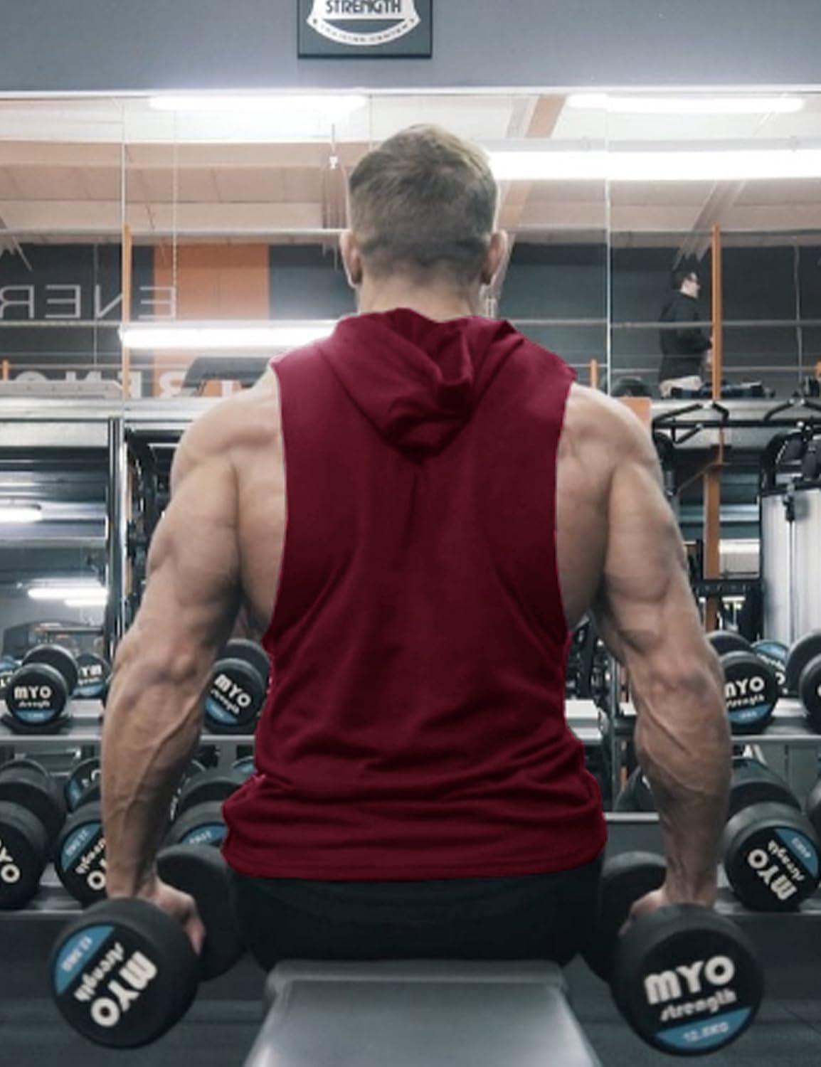 COOFANDY Men’s Workout Hooded Tank Tops Bodybuilding Muscle Cut Off T Shirt Sleeveless Gym Hoodies(Wine Red)