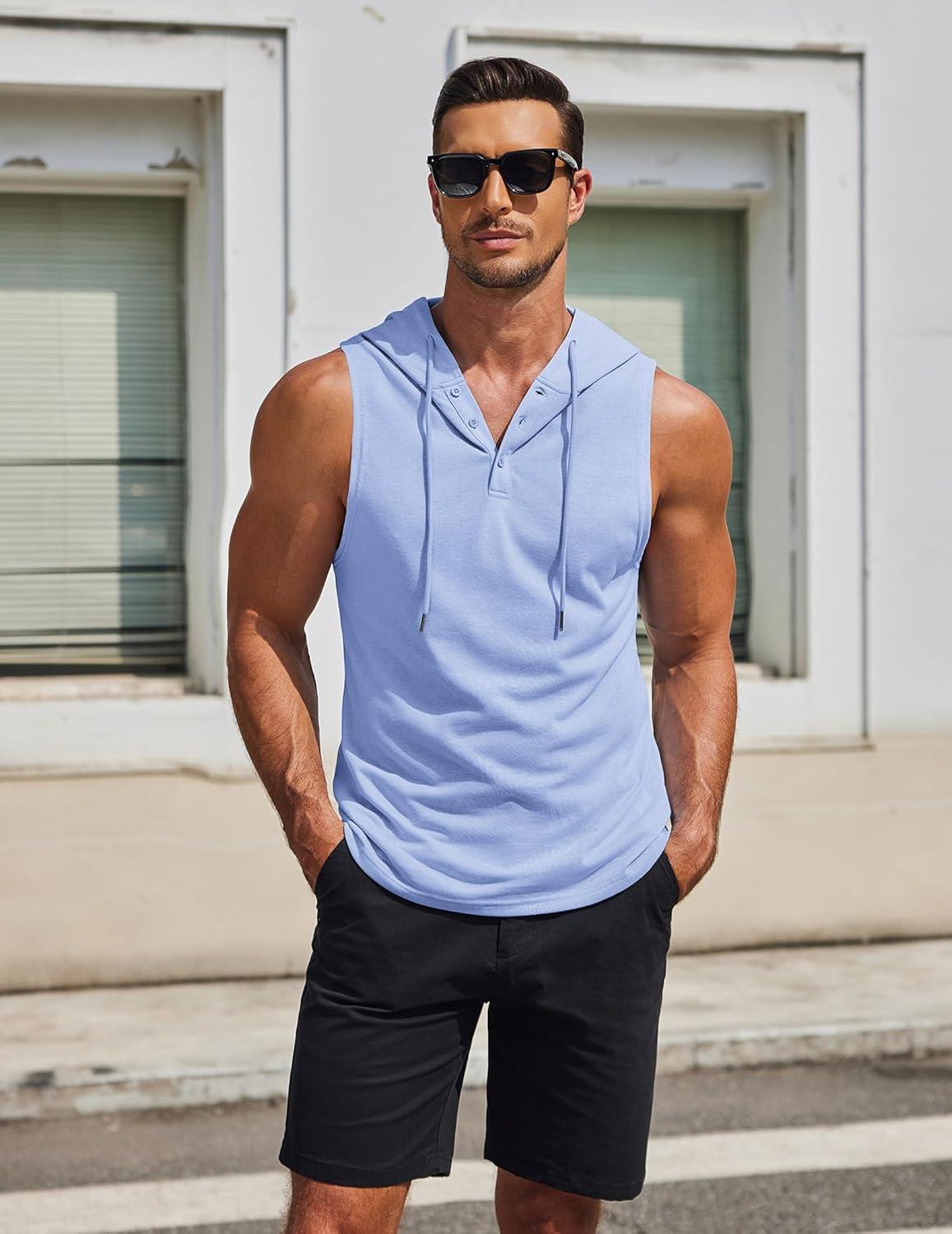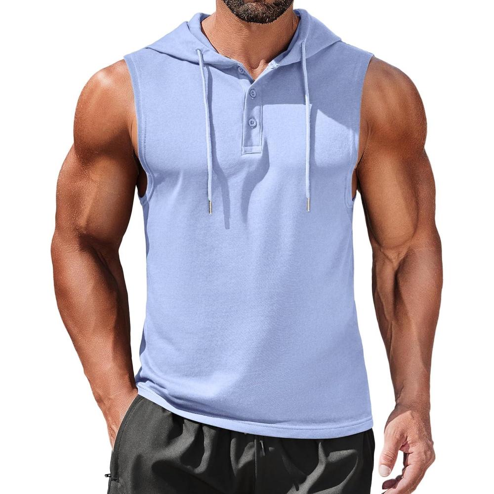 COOFANDY Men’s Workout Hooded Tank Tops Sleeveless Gym Hoodies Cotton Muscle Cut Off Shirt Bodybuilding Henley Shirts(Light Blue)