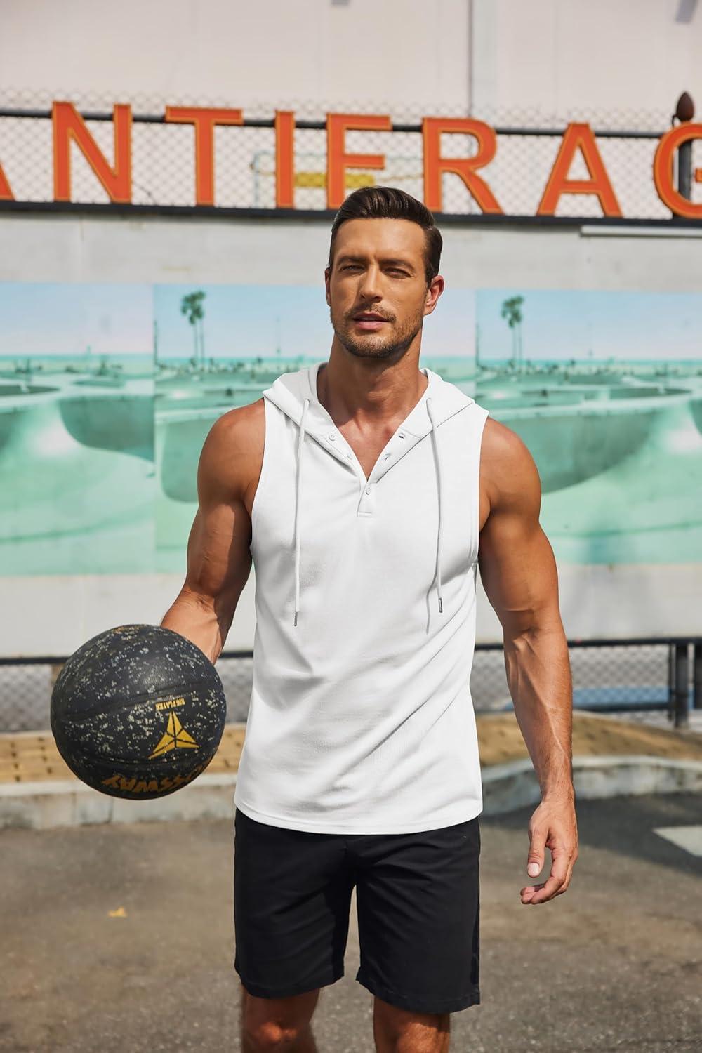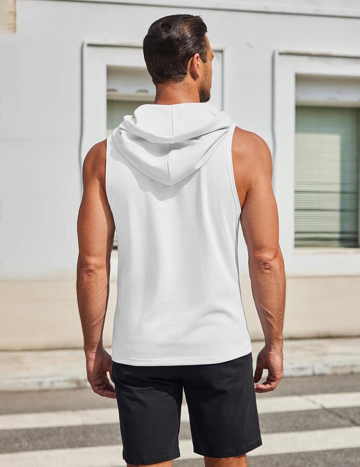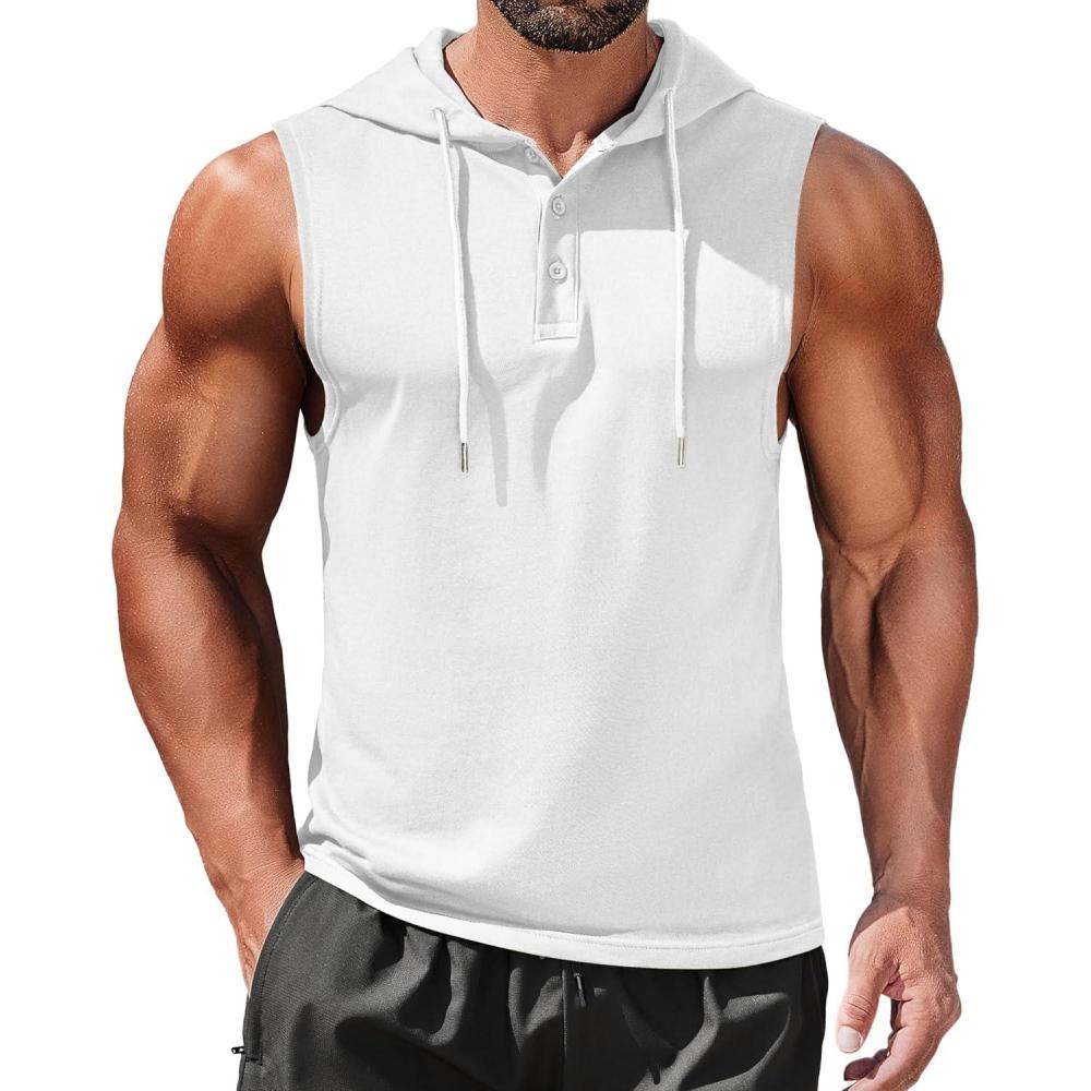 COOFANDY Men's Workout Hooded Tank Tops Sleeveless Gym Hoodies Cotton Muscle Cut Off Shirt Bodybuilding Henley Shirts(White)