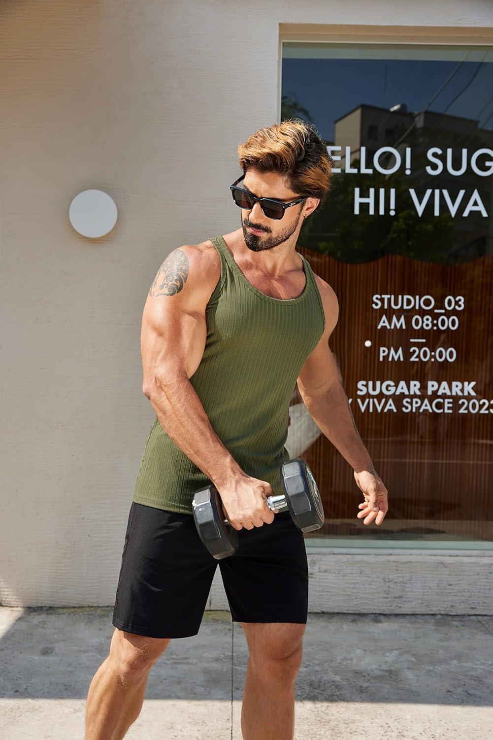 COOFANDY Men's Workout Tank Top Ribbed Knit Sleeveless Gym Muscle T Shirts Bodybuilding Tee(Army Green(1 Pcs))