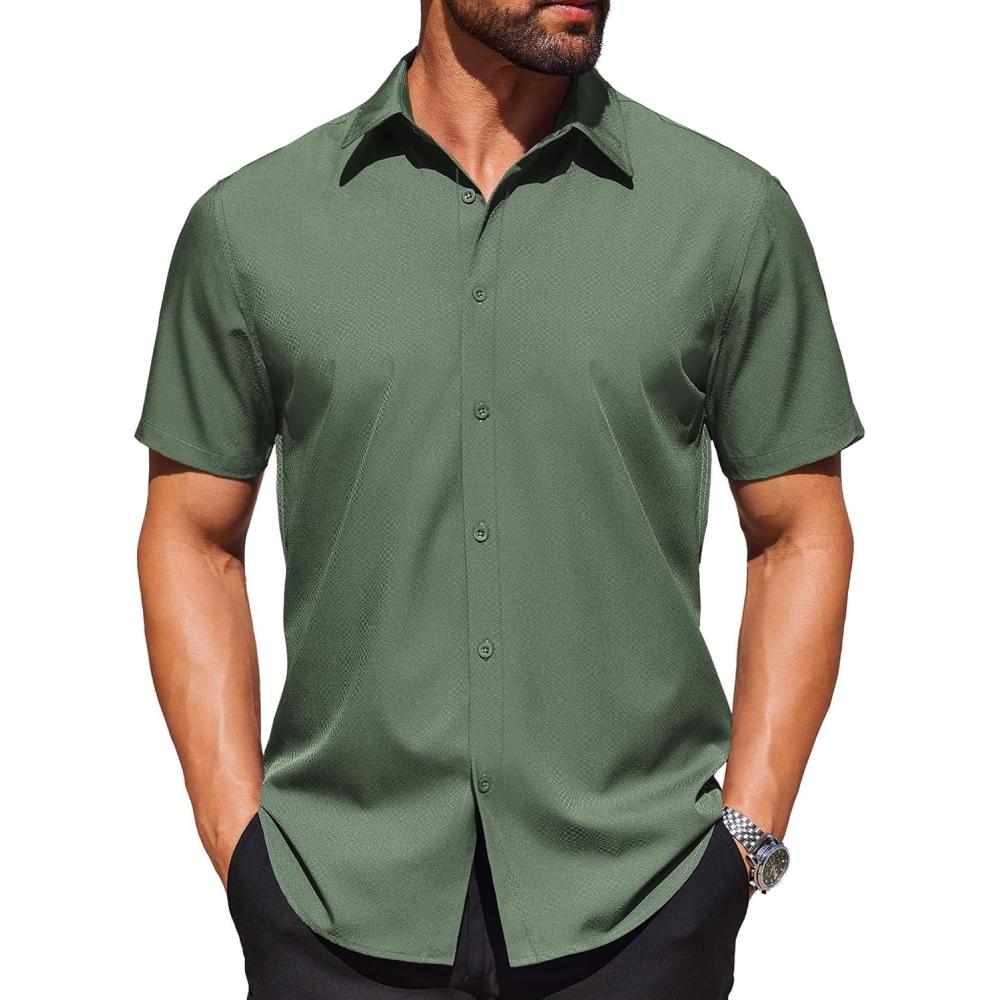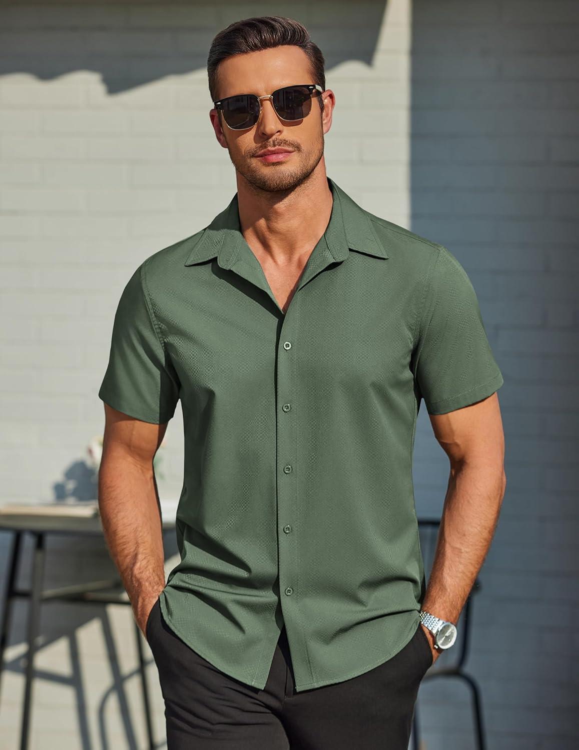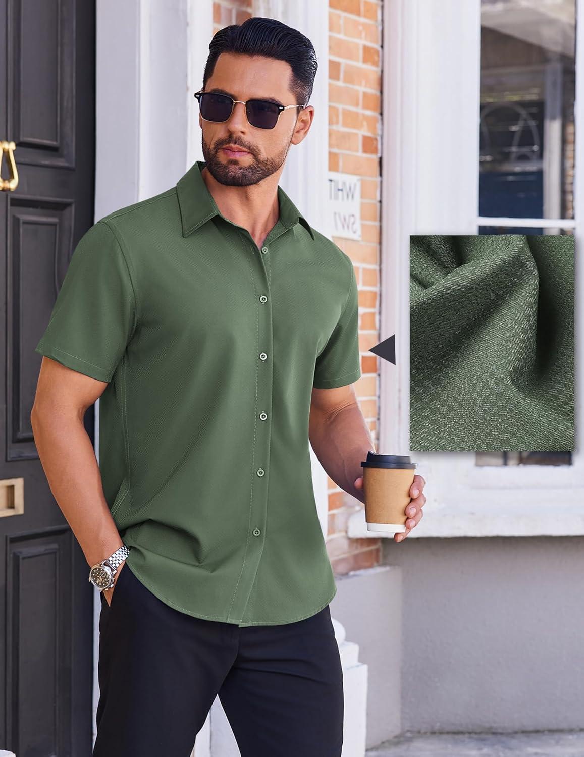 COOFANDY Mens Wrinkle Free Dress Shirt Polka Dot Short Sleeve Button Down Business Casual Shirts(Army Green)