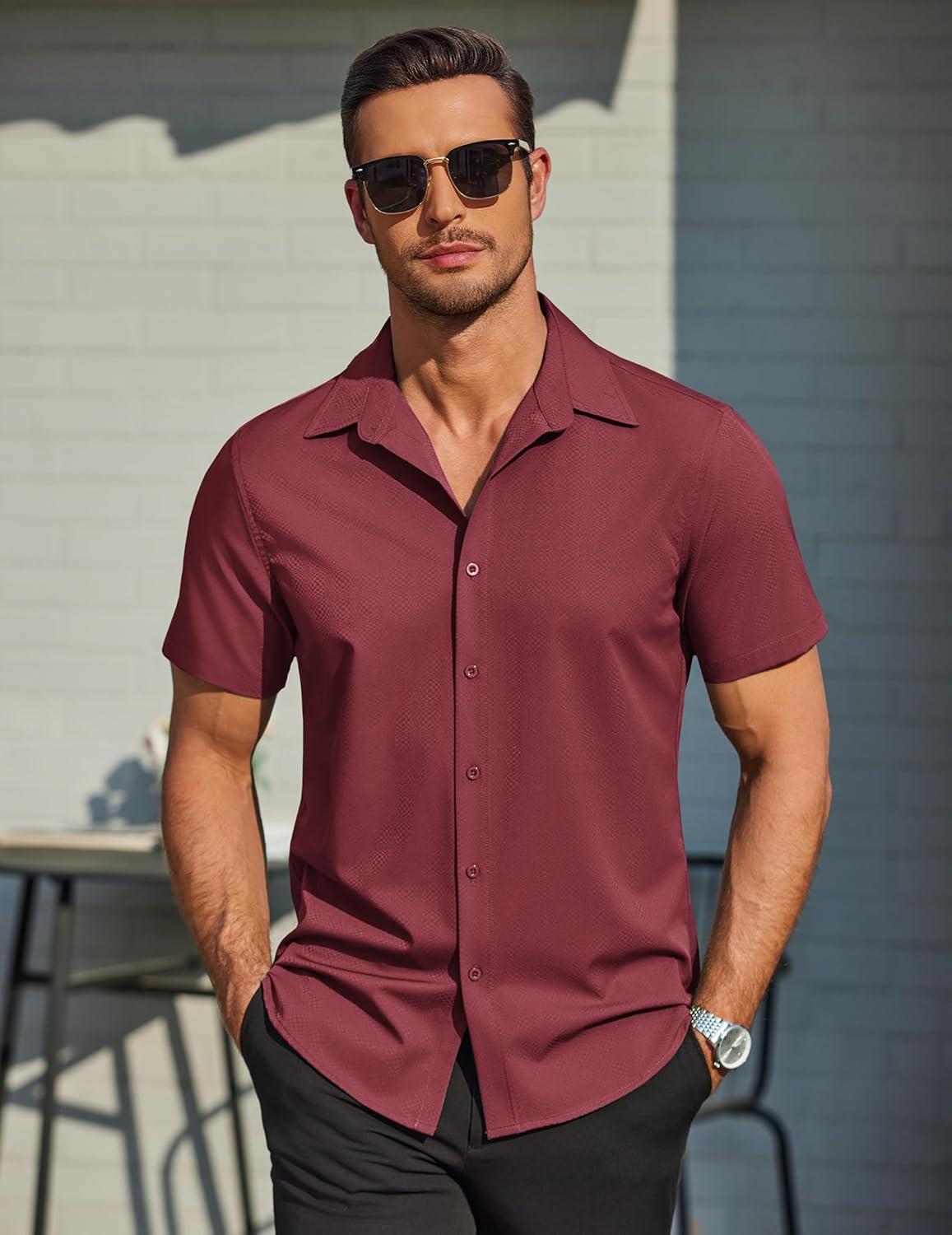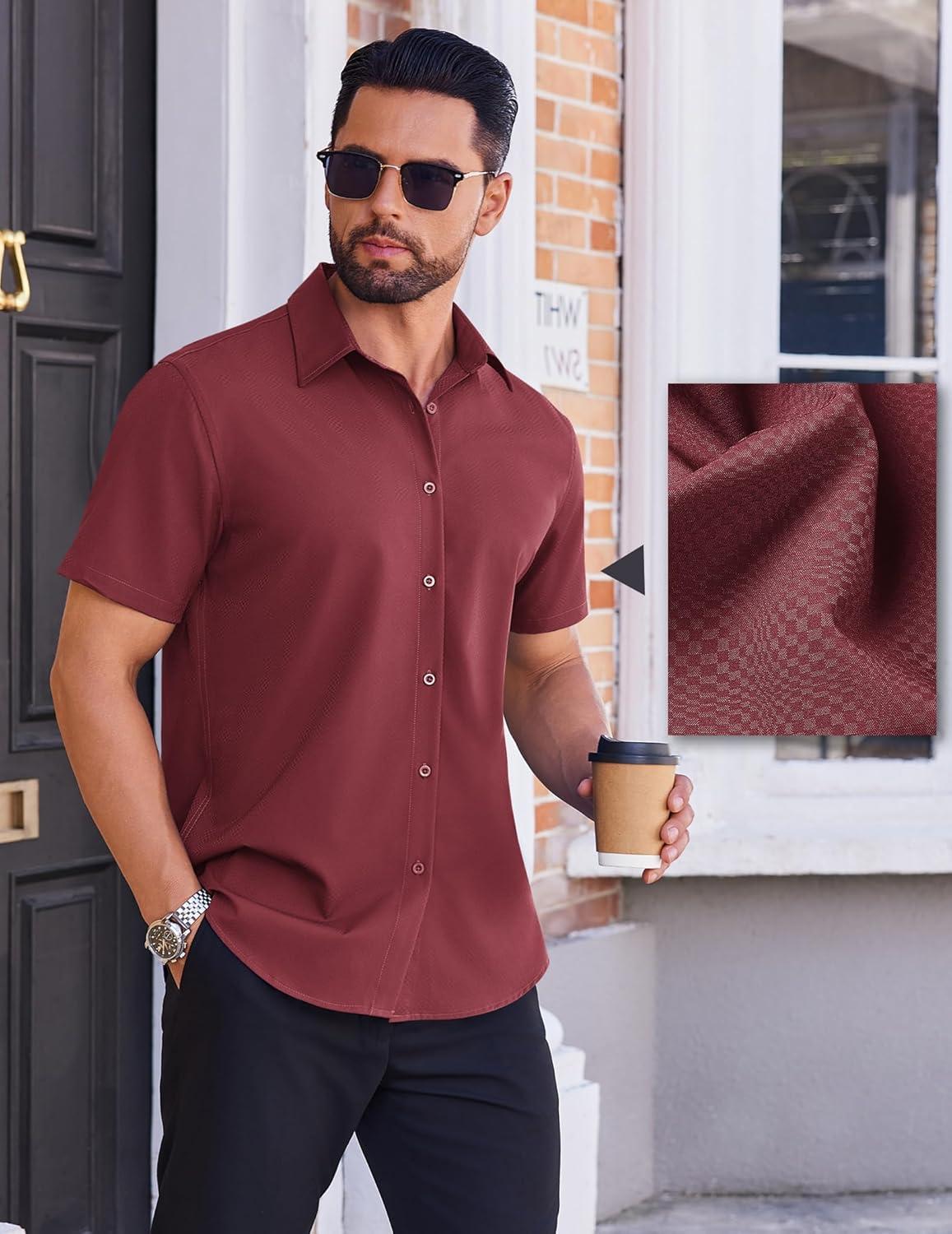 COOFANDY Mens Wrinkle Free Dress Shirt Polka Dot Short Sleeve Button Down Business Casual Shirts(Burgundy)