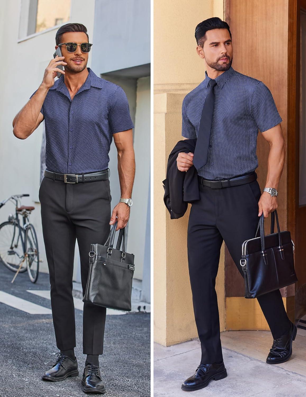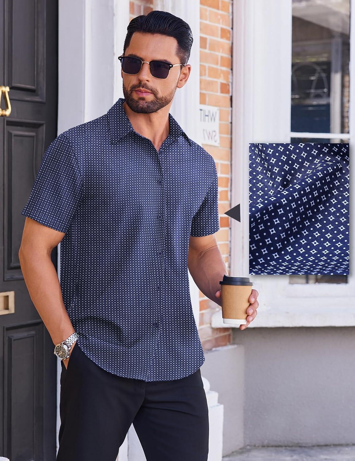COOFANDY Mens Wrinkle Free Dress Shirt Polka Dot Short Sleeve Button Down Business Casual Shirts(Navy Blue-square)
