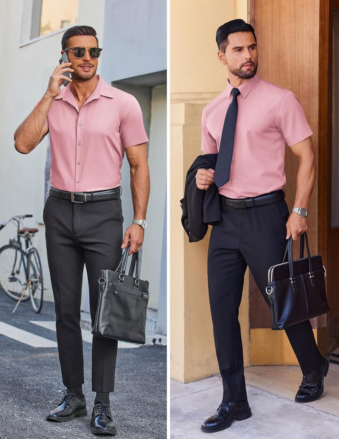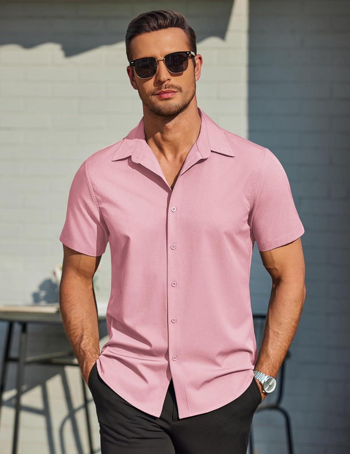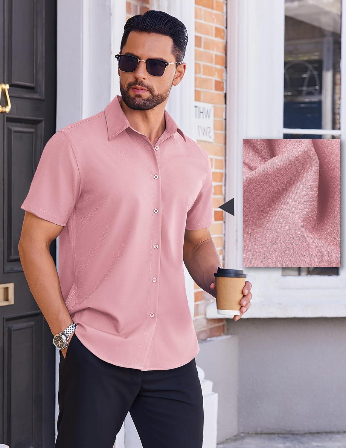 COOFANDY Mens Wrinkle Free Dress Shirt Polka Dot Short Sleeve Button Down Business Casual Shirts(Pink)
