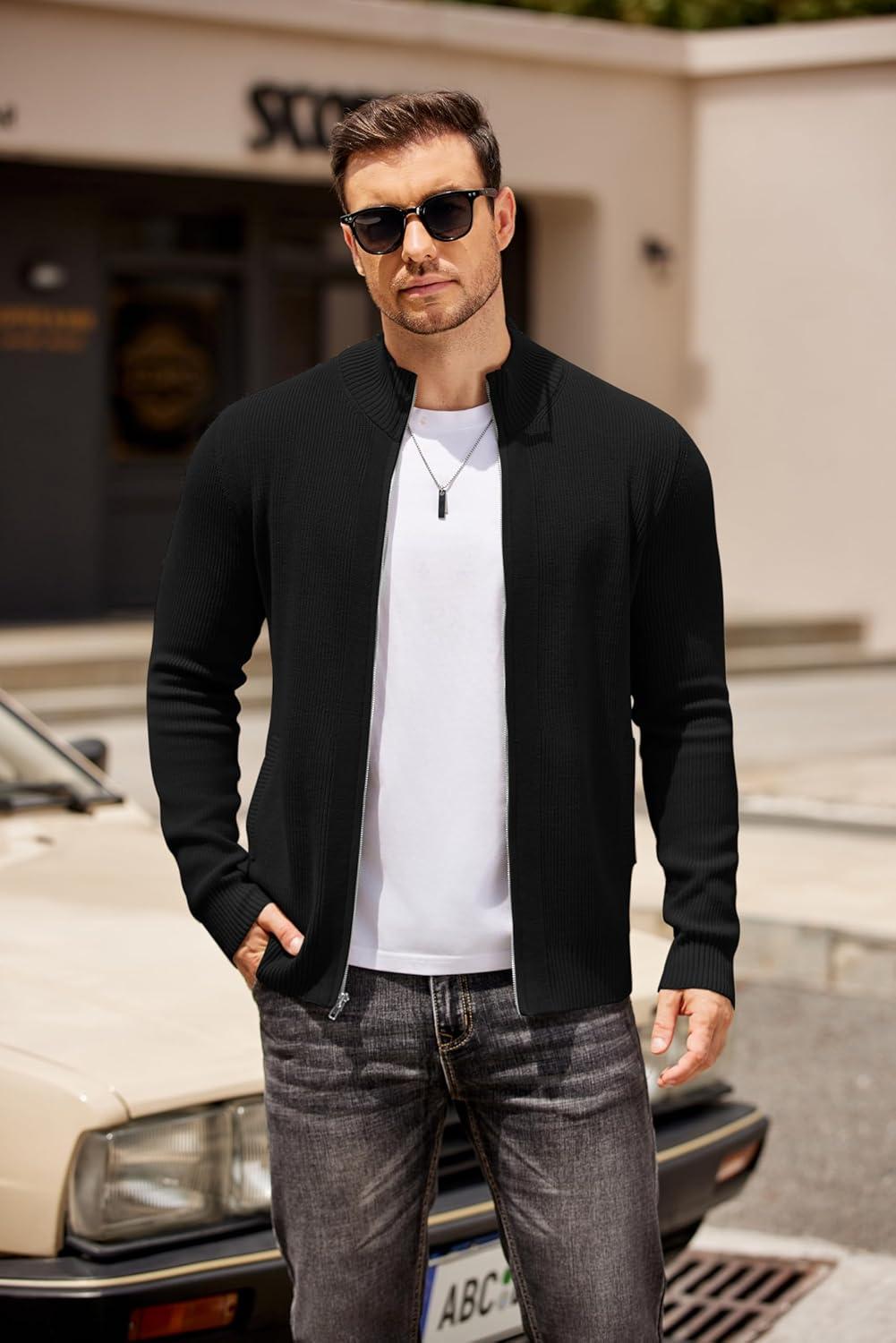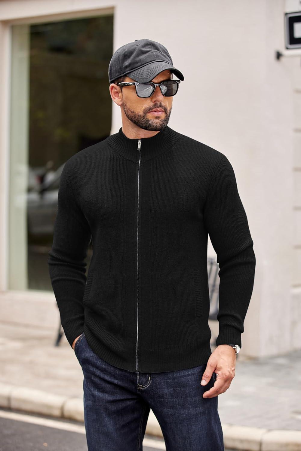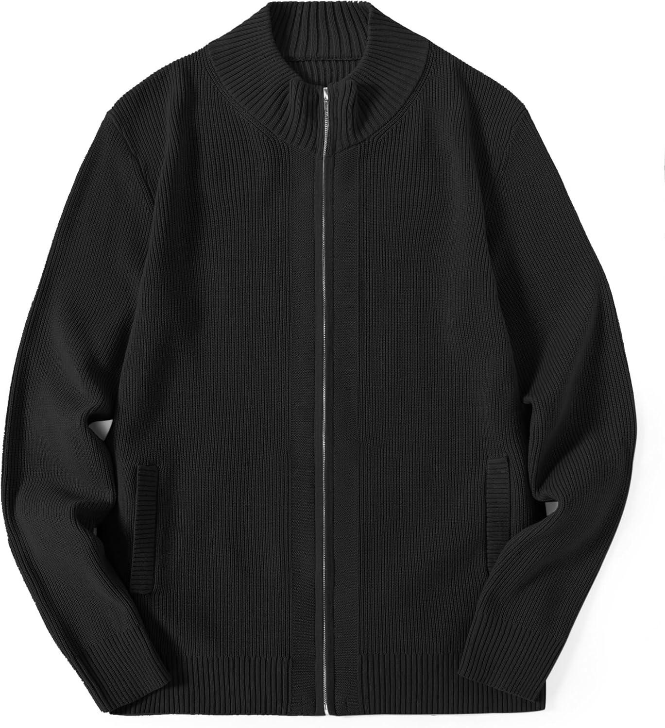 COOFANDY Mens Zip Up Cardigan Sweater Slim Fit Casual Full Zip Sweaters Knit Stand Collar Cardigans with 2 Front Pockets(Black)