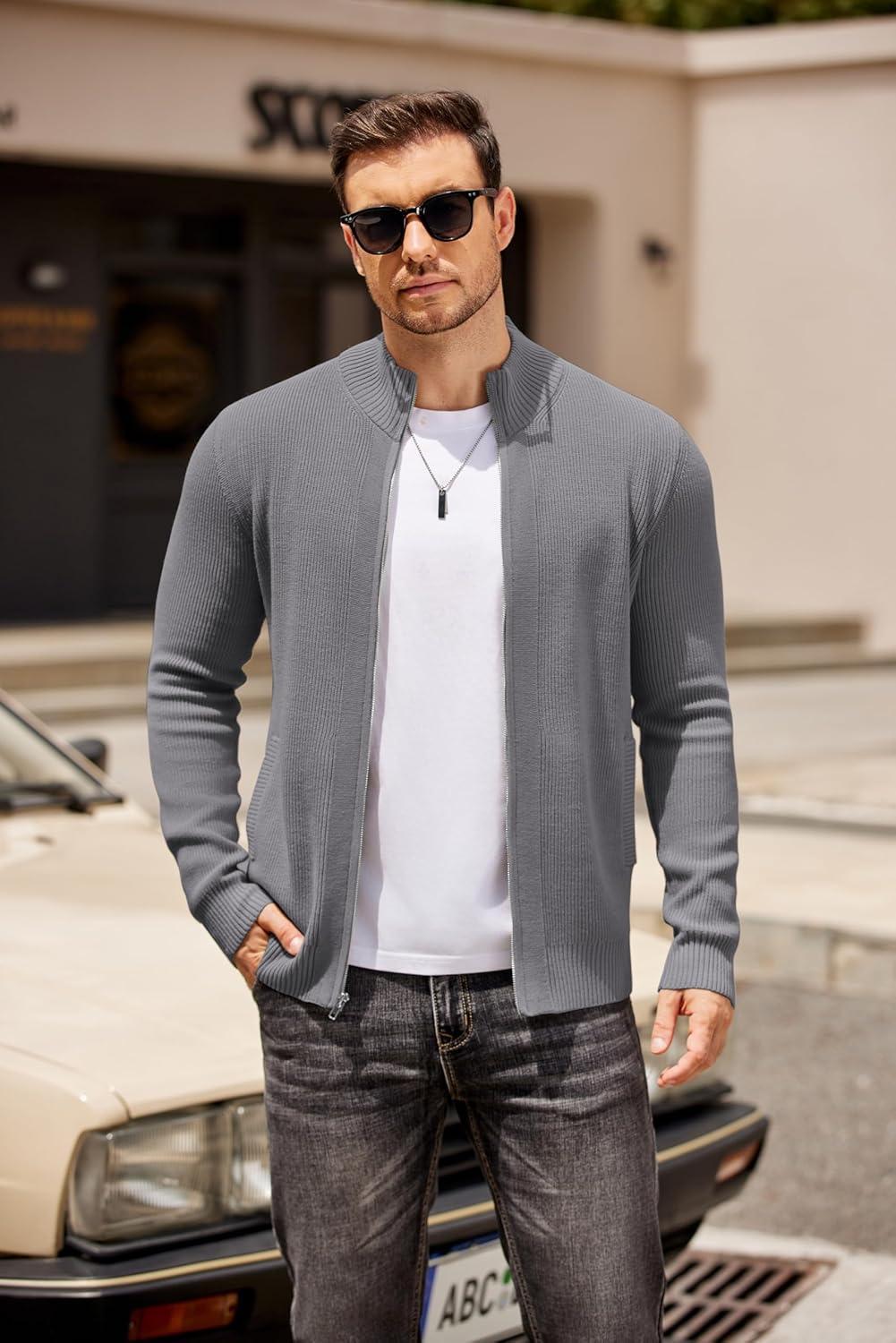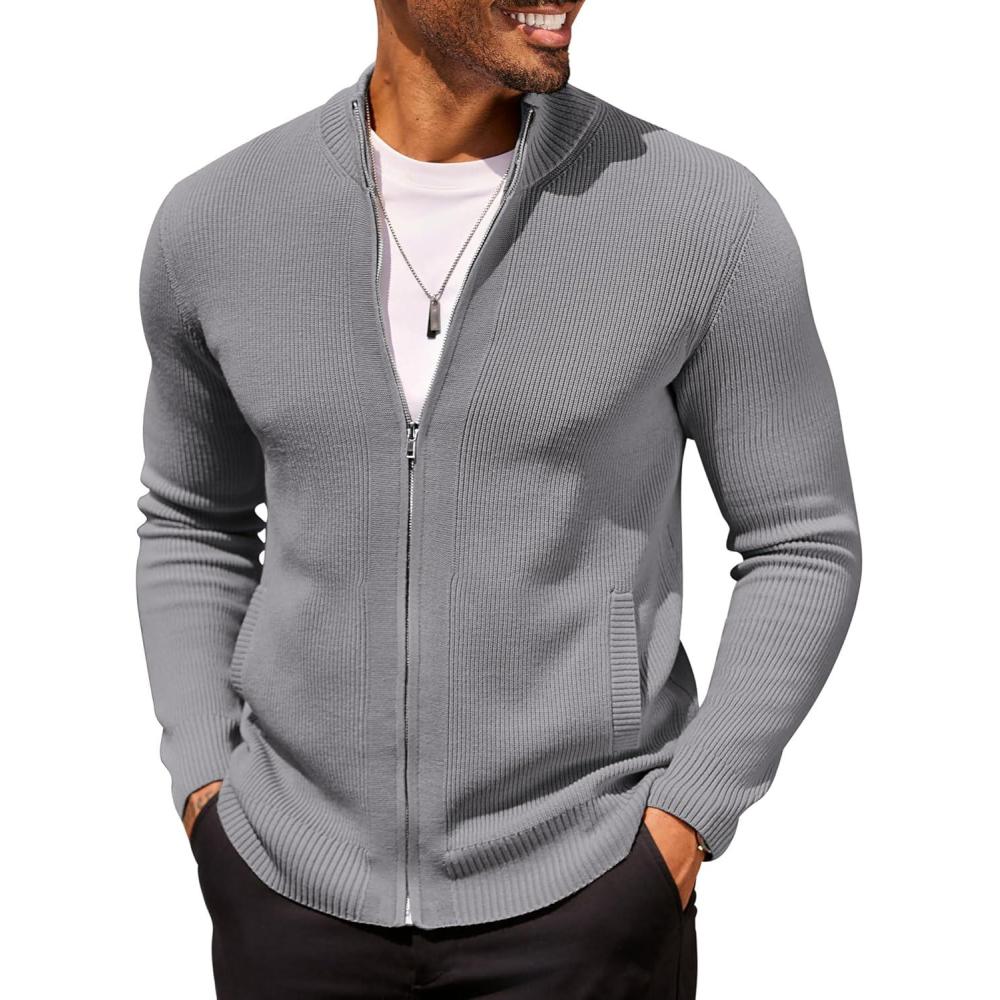 COOFANDY Mens Zip Up Cardigan Sweater Slim Fit Casual Full Zip Sweaters Knit Stand Collar Cardigans with 2 Front Pockets(Grey)