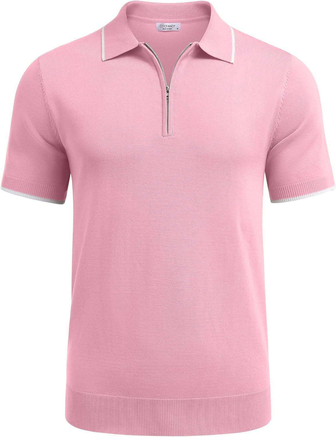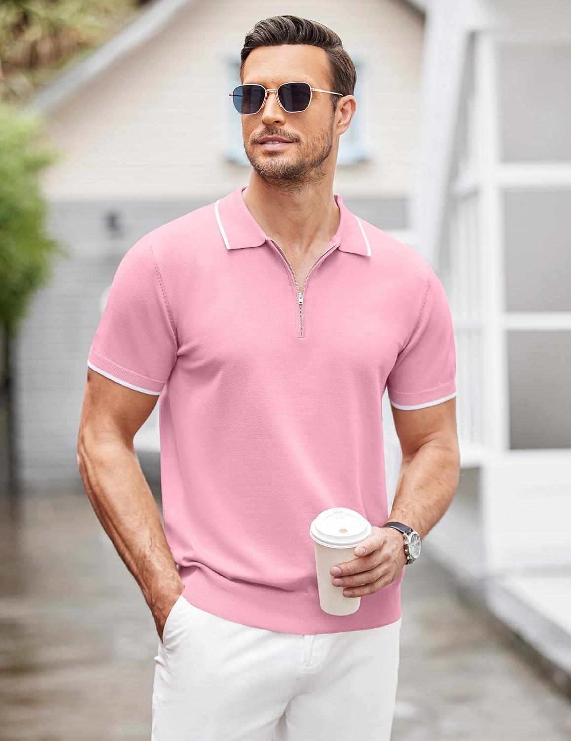 COOFANDY Men’s Zipper Polo Shirt Casual Knit Short Sleeve Polo T Shirt Classic Fit Shirts(Bright Pink)