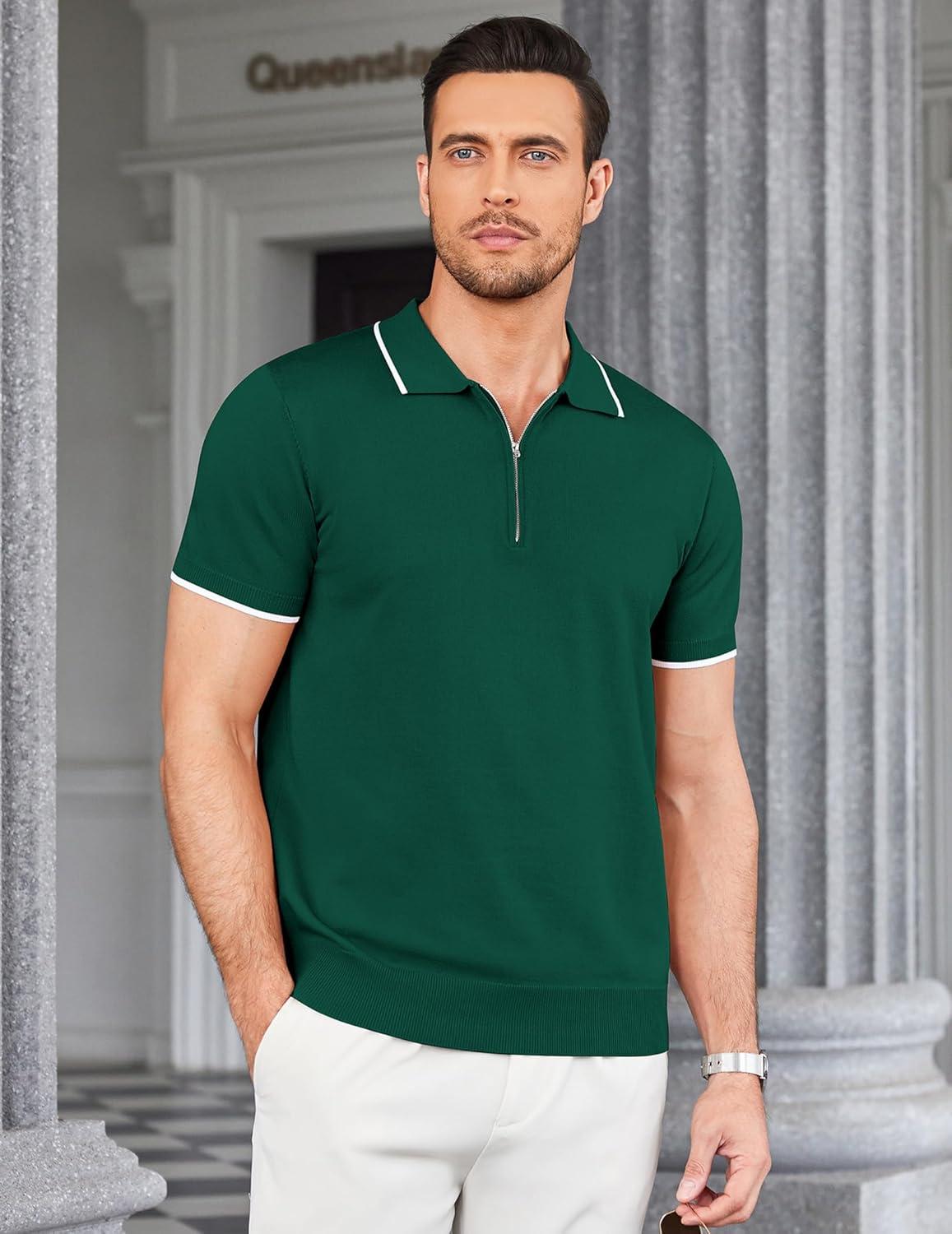 COOFANDY Men’s Zipper Polo Shirt Casual Knit Short Sleeve Polo T Shirt Classic Fit Shirts(Green)