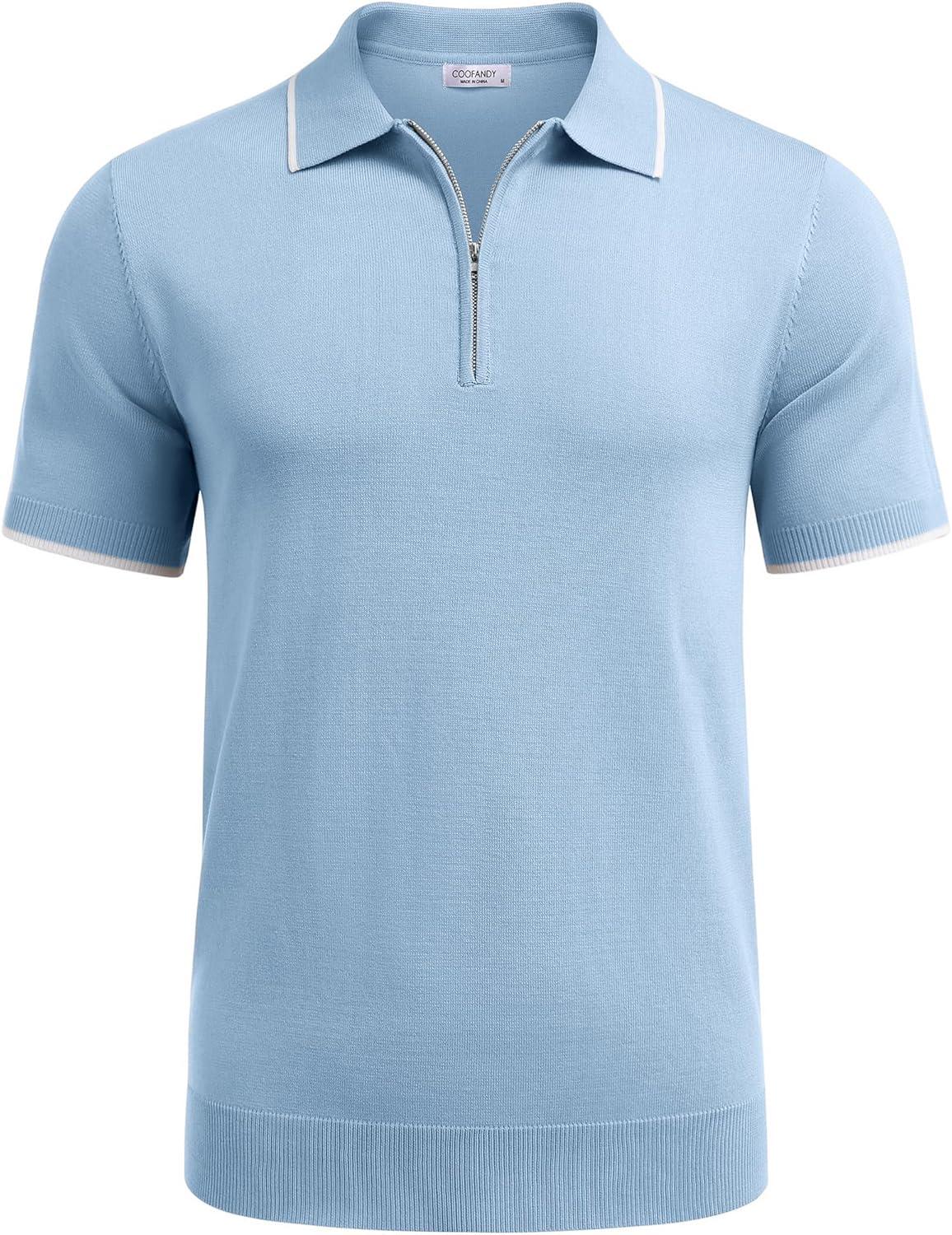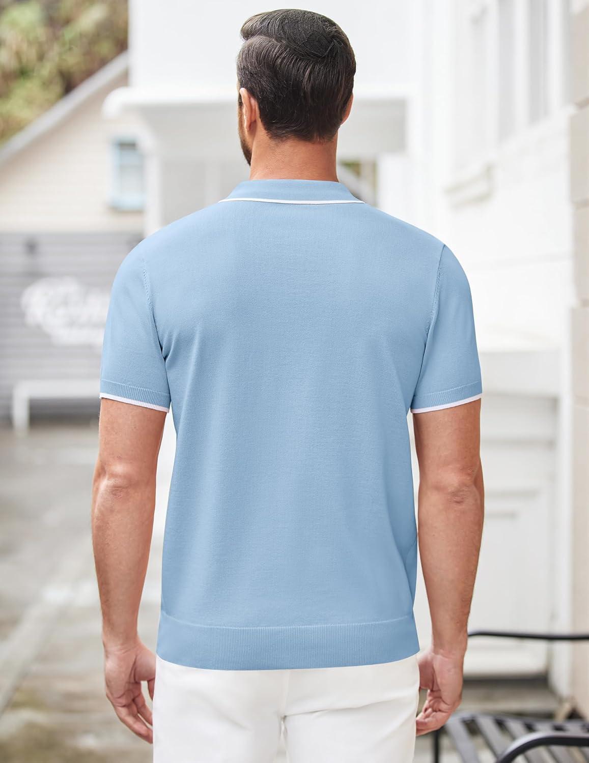 COOFANDY Men's Zipper Polo Shirt Casual Knit Short Sleeve Polo T Shirt Classic Fit Shirts(Light Blue)