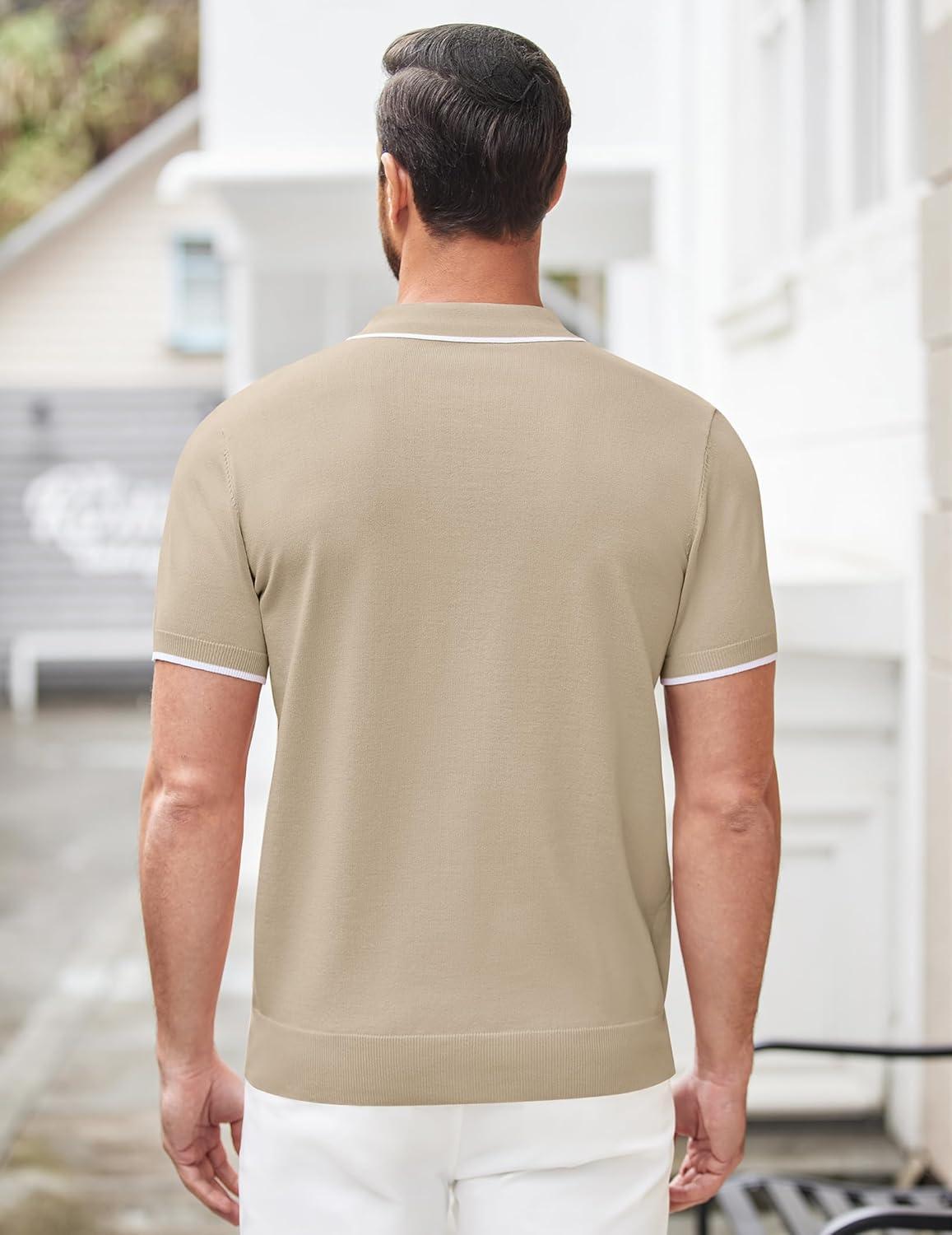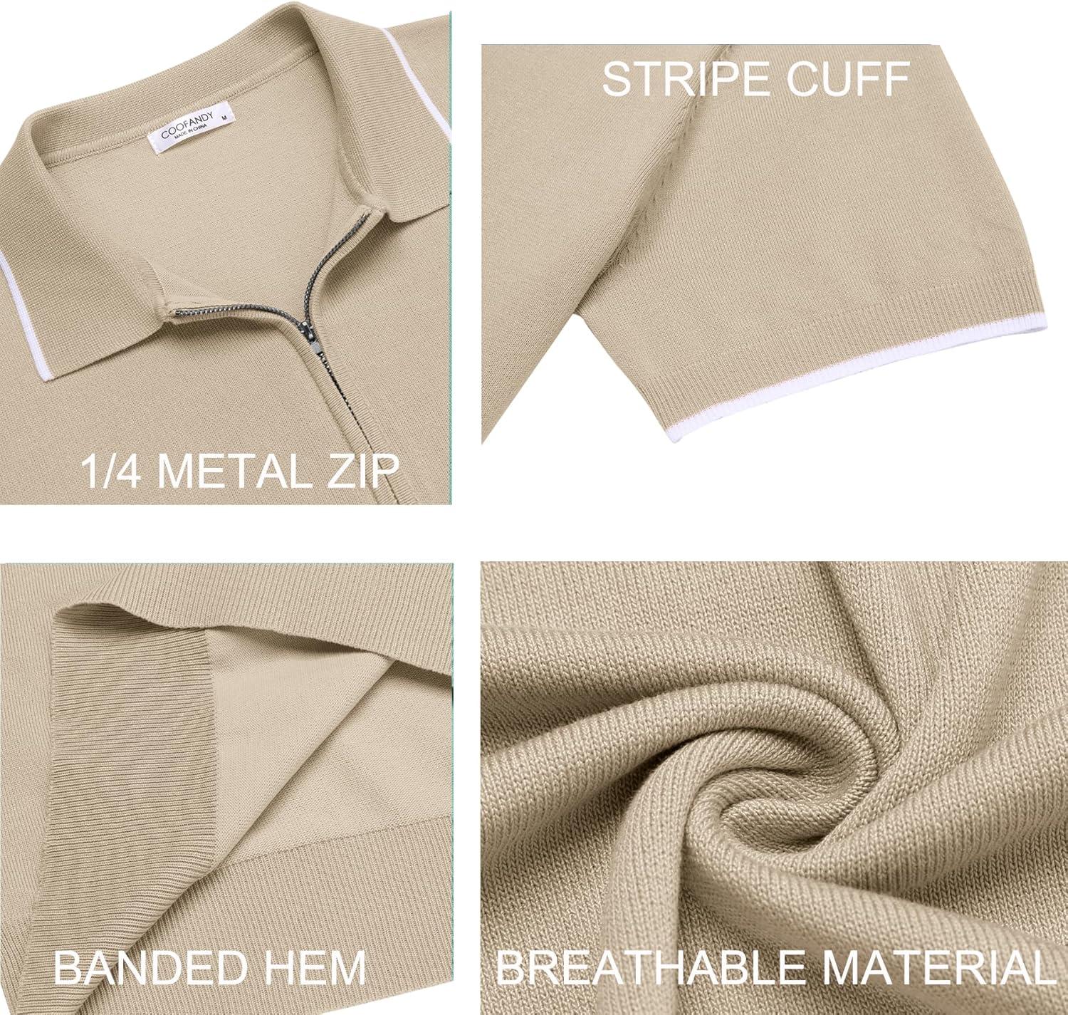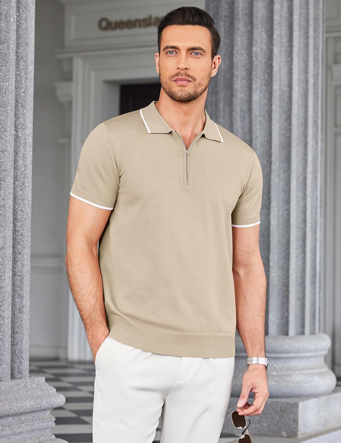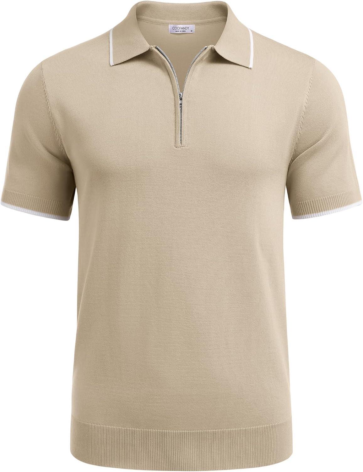 COOFANDY Men’s Zipper Polo Shirt Casual Knit Short Sleeve Polo T Shirt Classic Fit Shirts(Light Khaki)