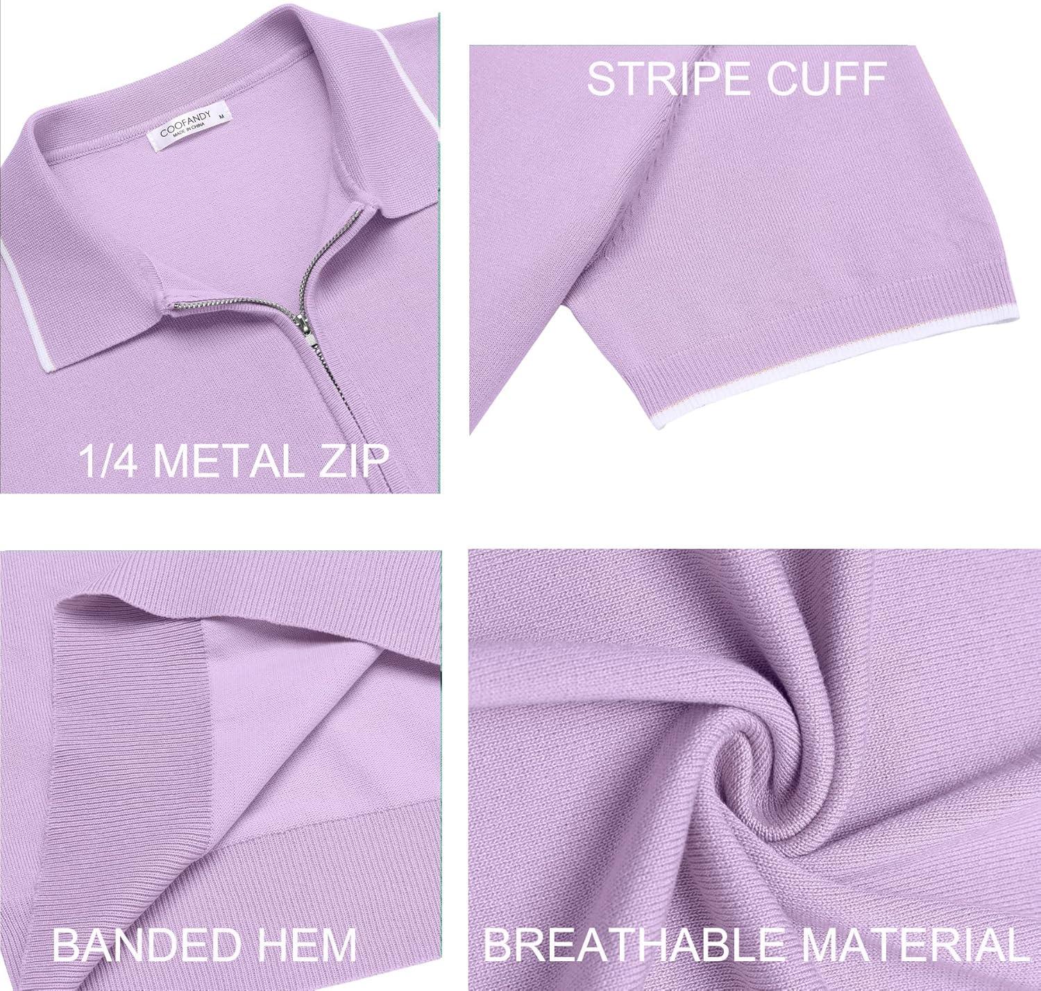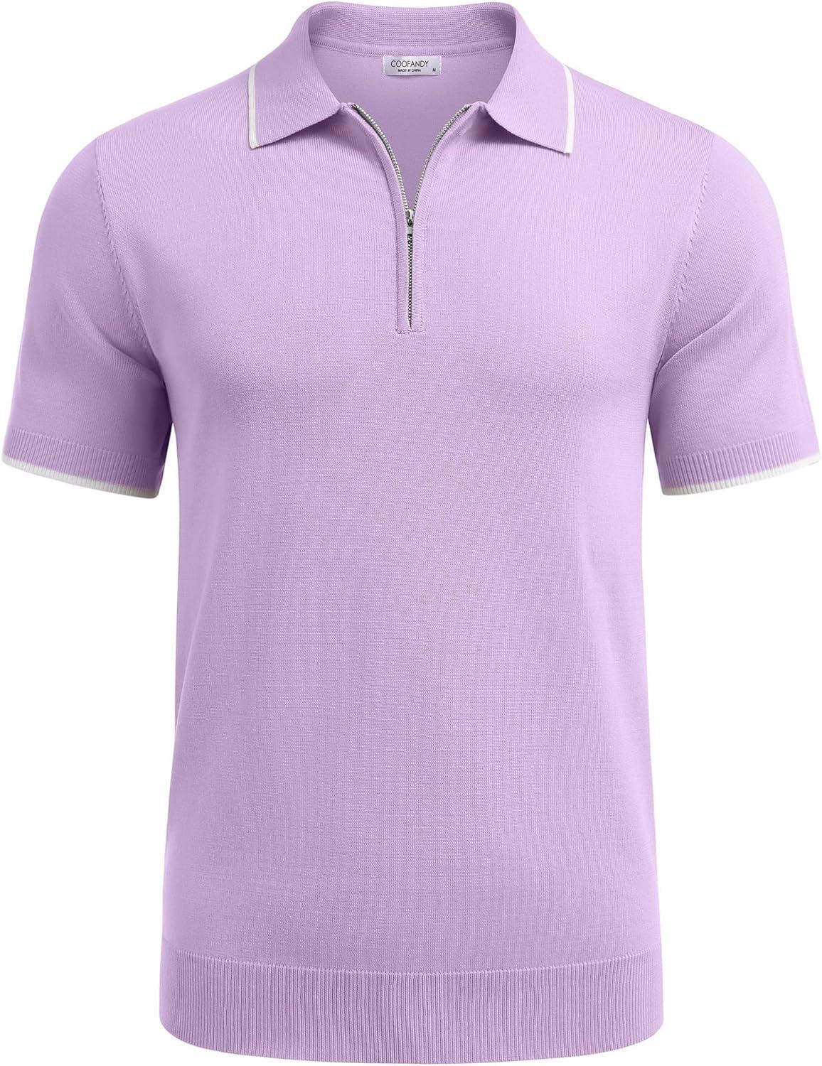 COOFANDY Men's Zipper Polo Shirt Casual Knit Short Sleeve Polo T Shirt Classic Fit Shirts(Light Purple)