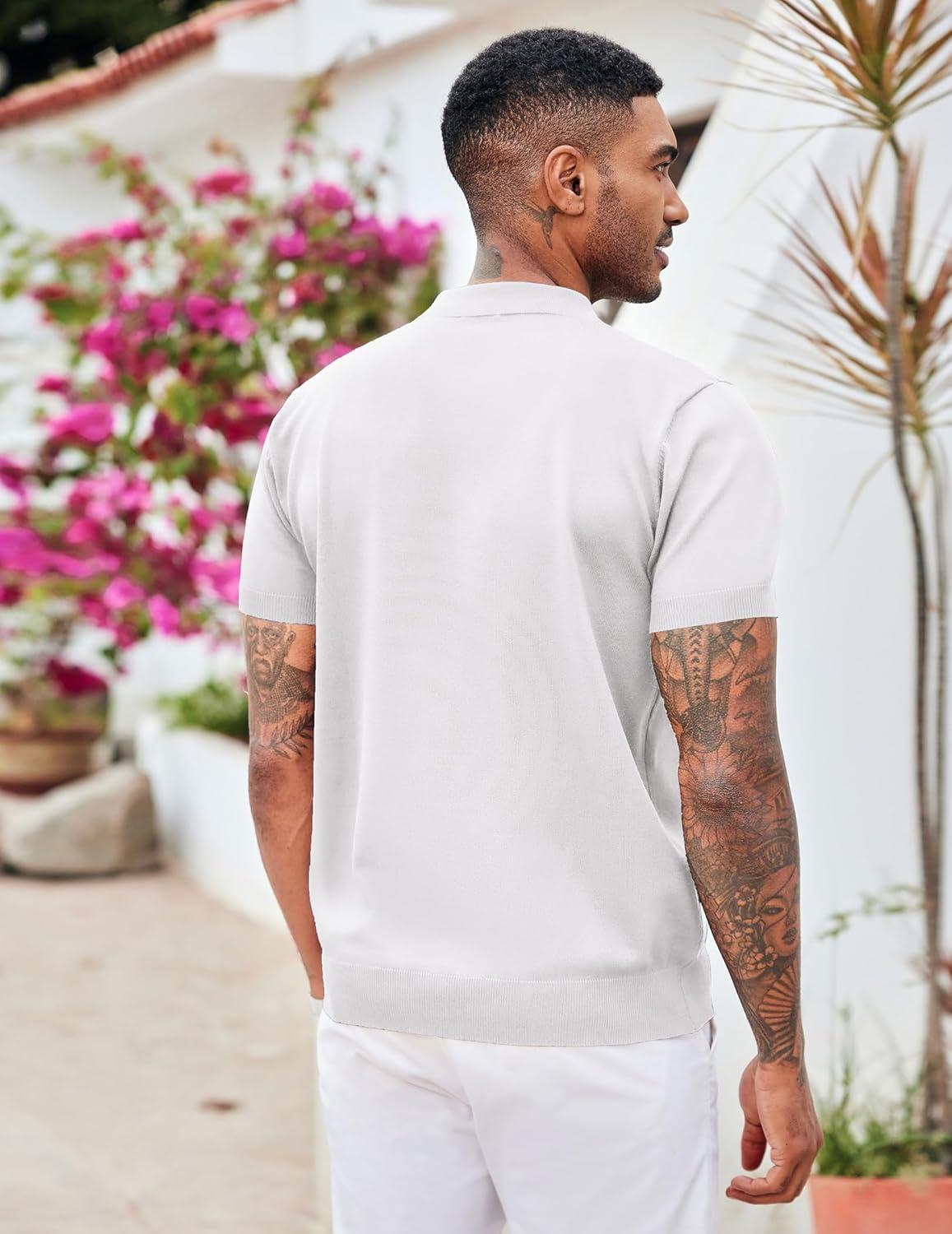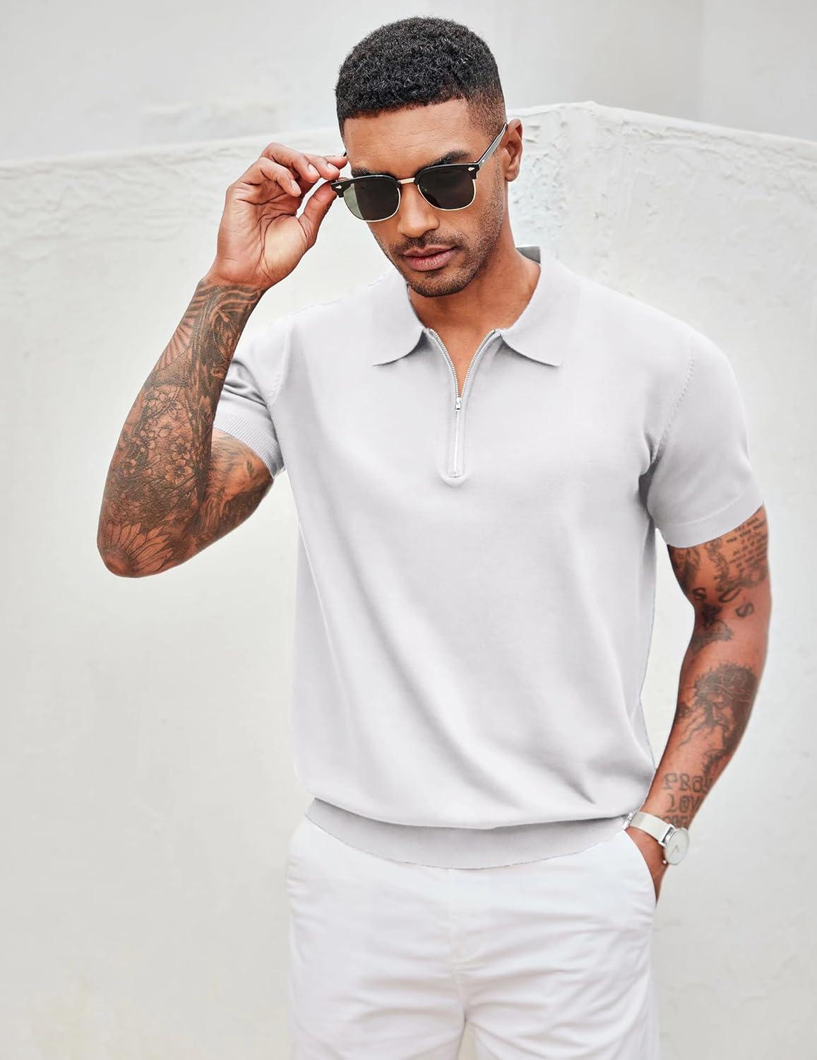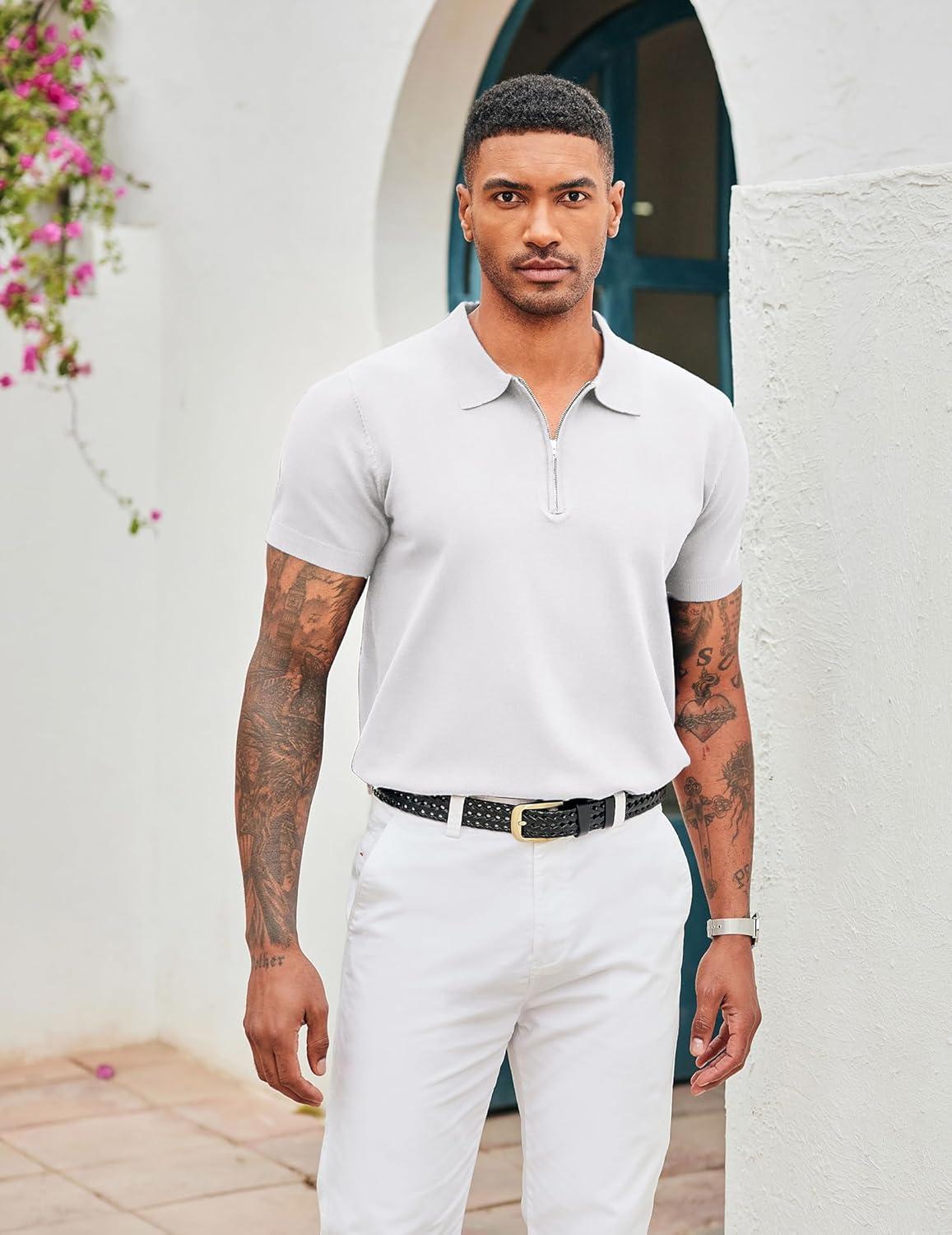 COOFANDY Men's Zipper Polo Shirt Casual Knit Short Sleeve Polo T Shirt Classic Fit Shirts(Solid- 01 White)