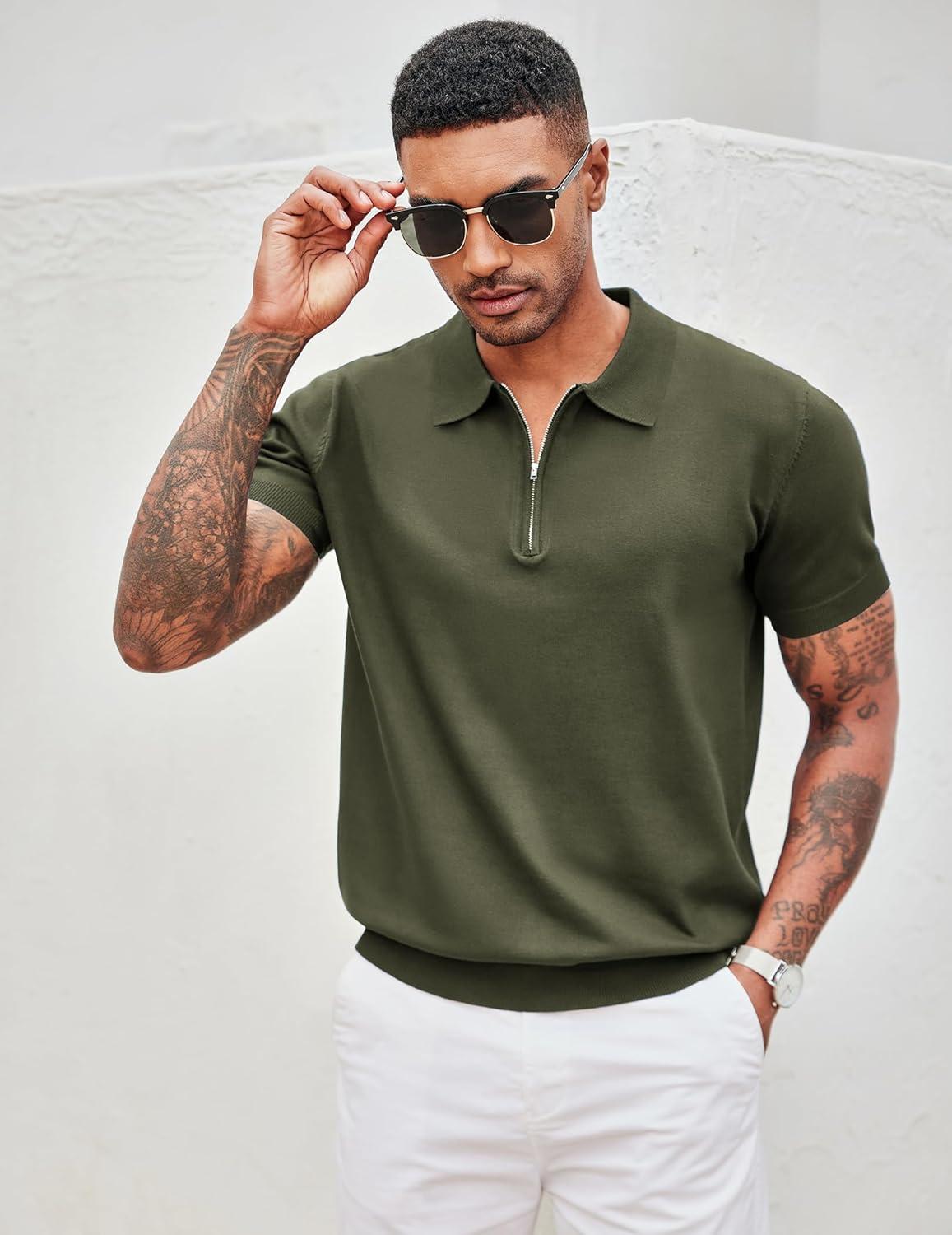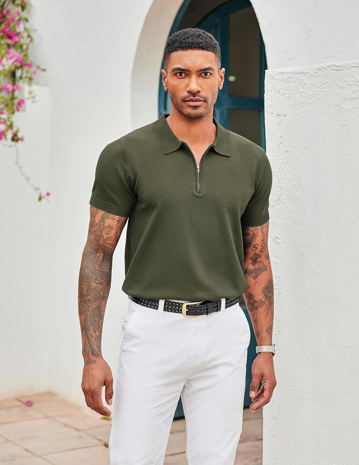 COOFANDY Men's Zipper Polo Shirt Casual Knit Short Sleeve Polo T Shirt Classic Fit Shirts(Solid- Army Green)