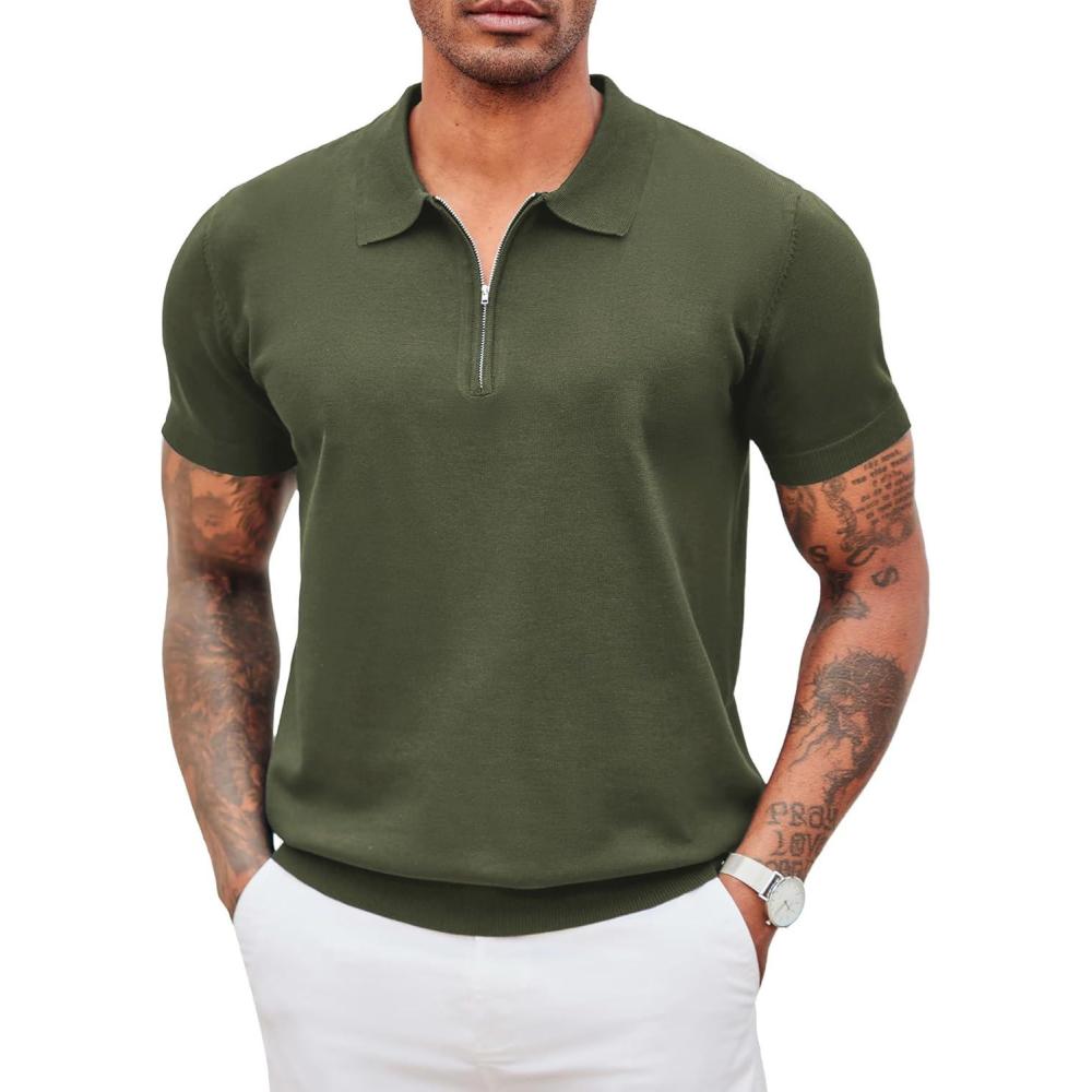 imageCOOFANDY Mens Zipper Polo Shirt Casual Knit Short Sleeve Polo T Shirt Classic Fit ShirtsSolid Army Green