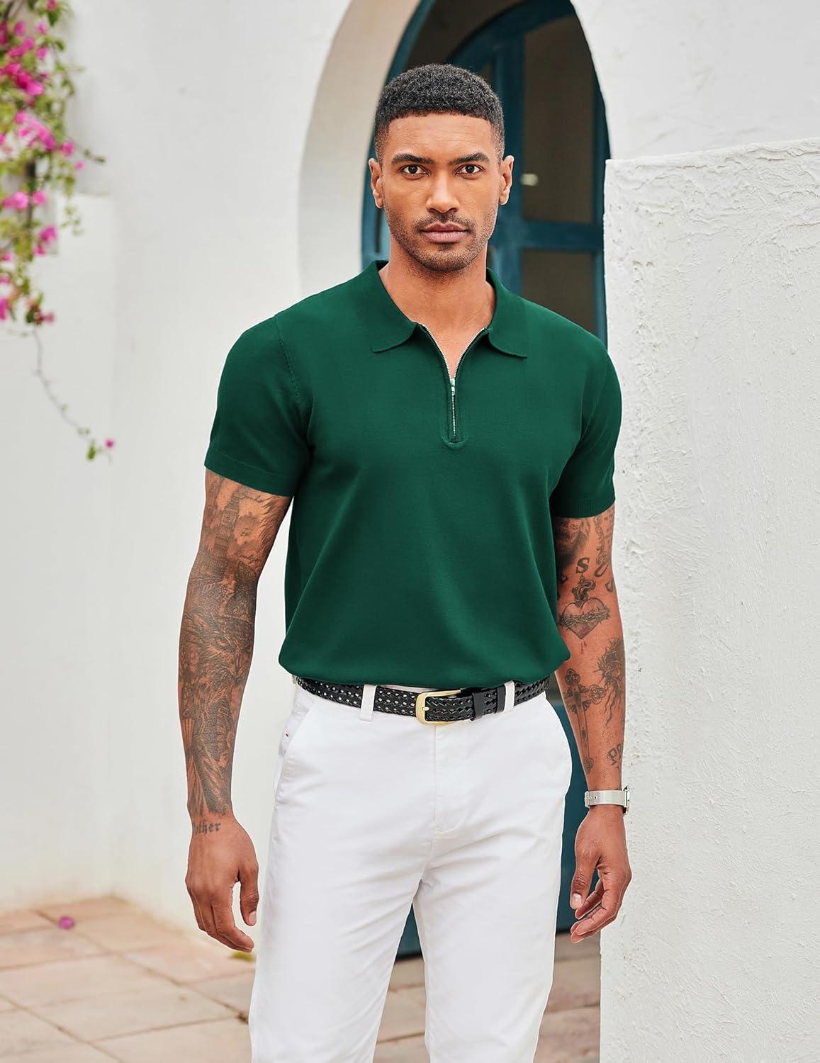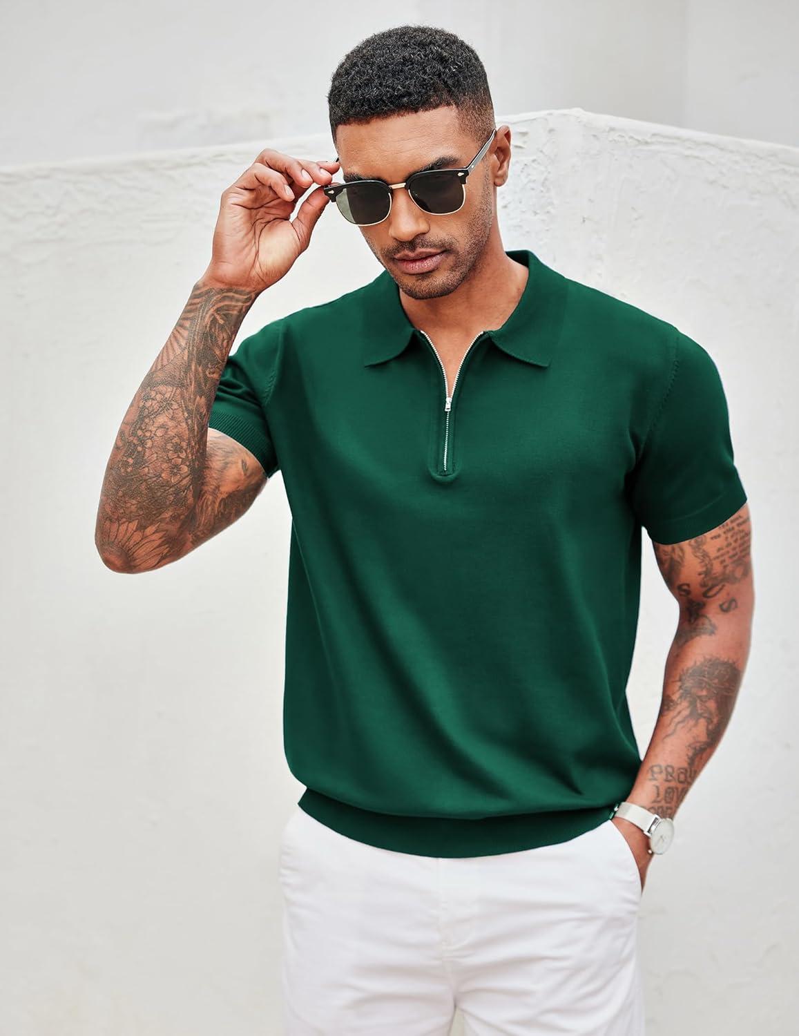 COOFANDY Men's Zipper Polo Shirt Casual Knit Short Sleeve Polo T Shirt Classic Fit Shirts(Solid- Green)