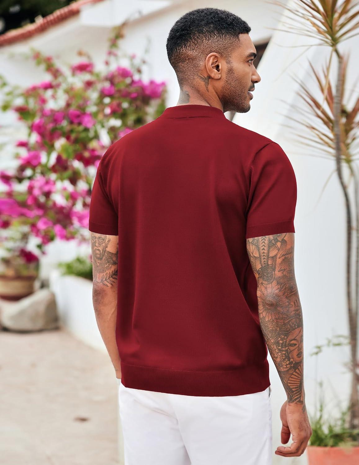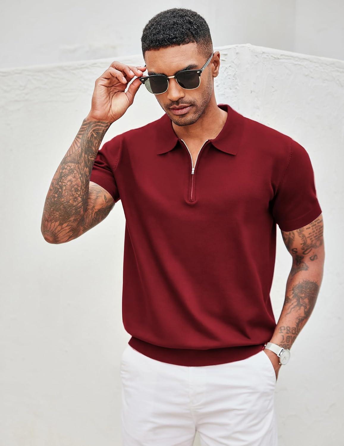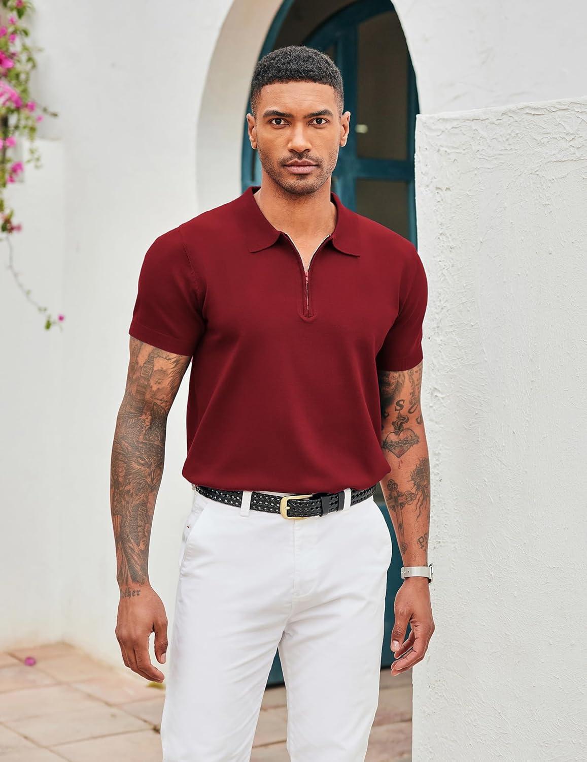 COOFANDY Men’s Zipper Polo Shirt Casual Knit Short Sleeve Polo T Shirt Classic Fit Shirts(Solid- Wine Red)