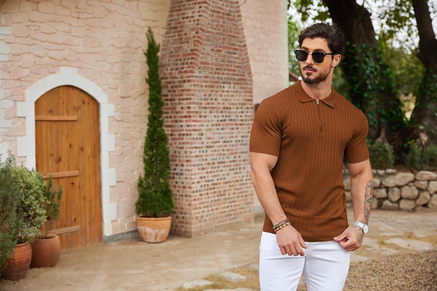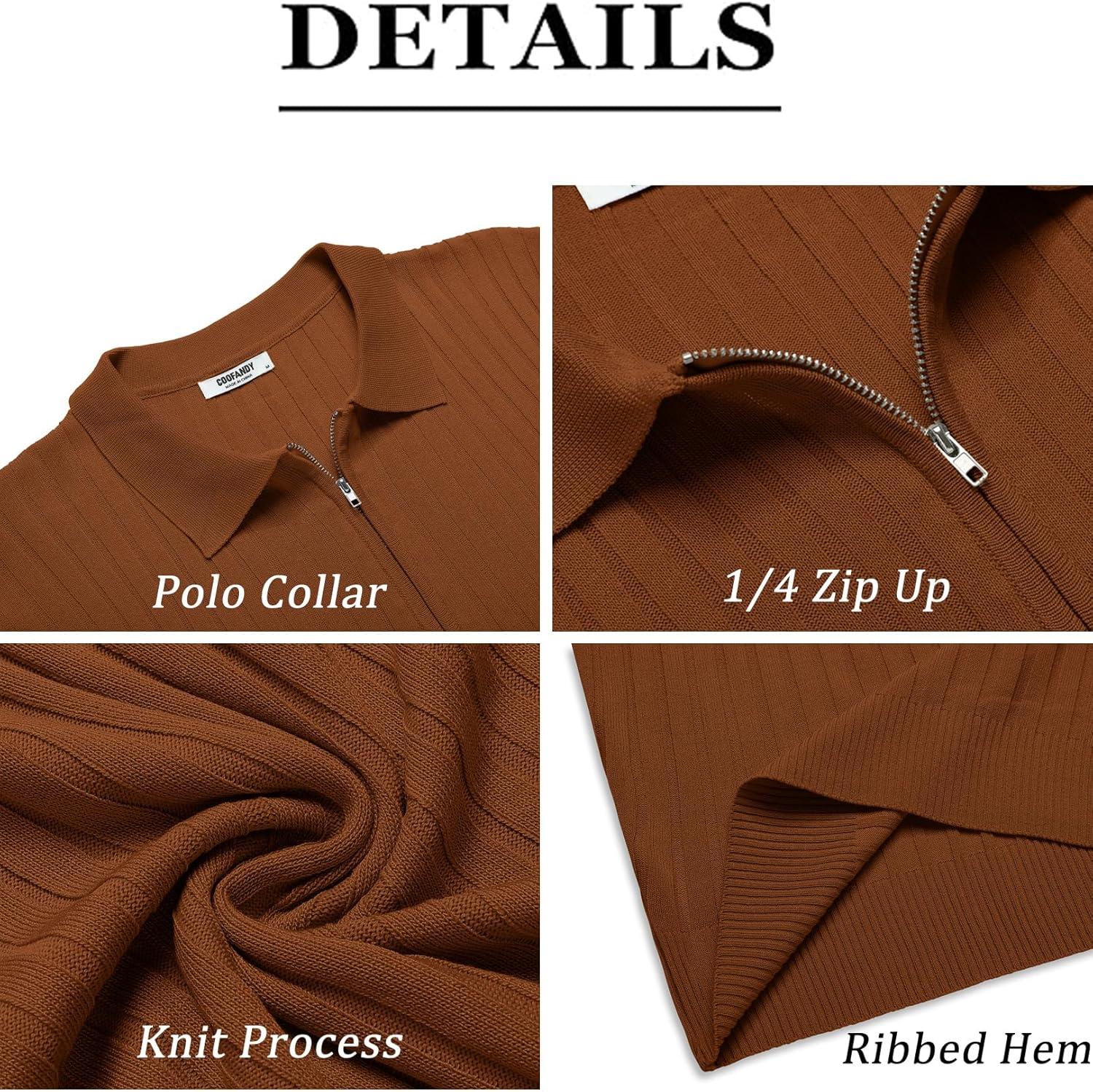 COOFANDY Men's Zipper Polo Shirts Short Sleeve Ribbed Knit Polo T Shirts Fashion Casual Golf Shirts(Brown)