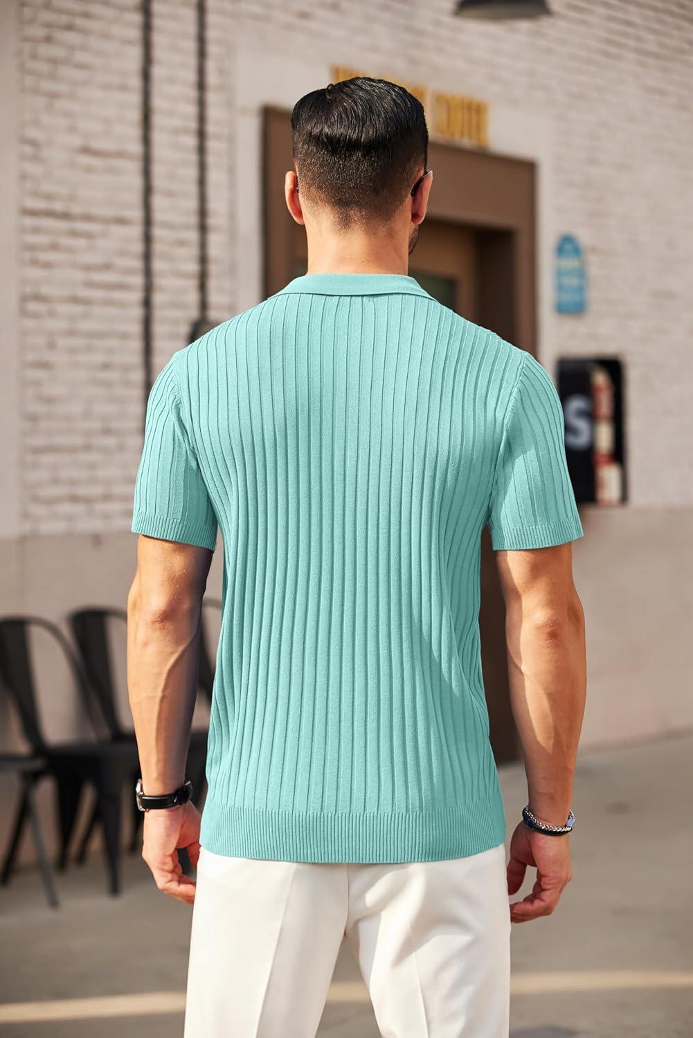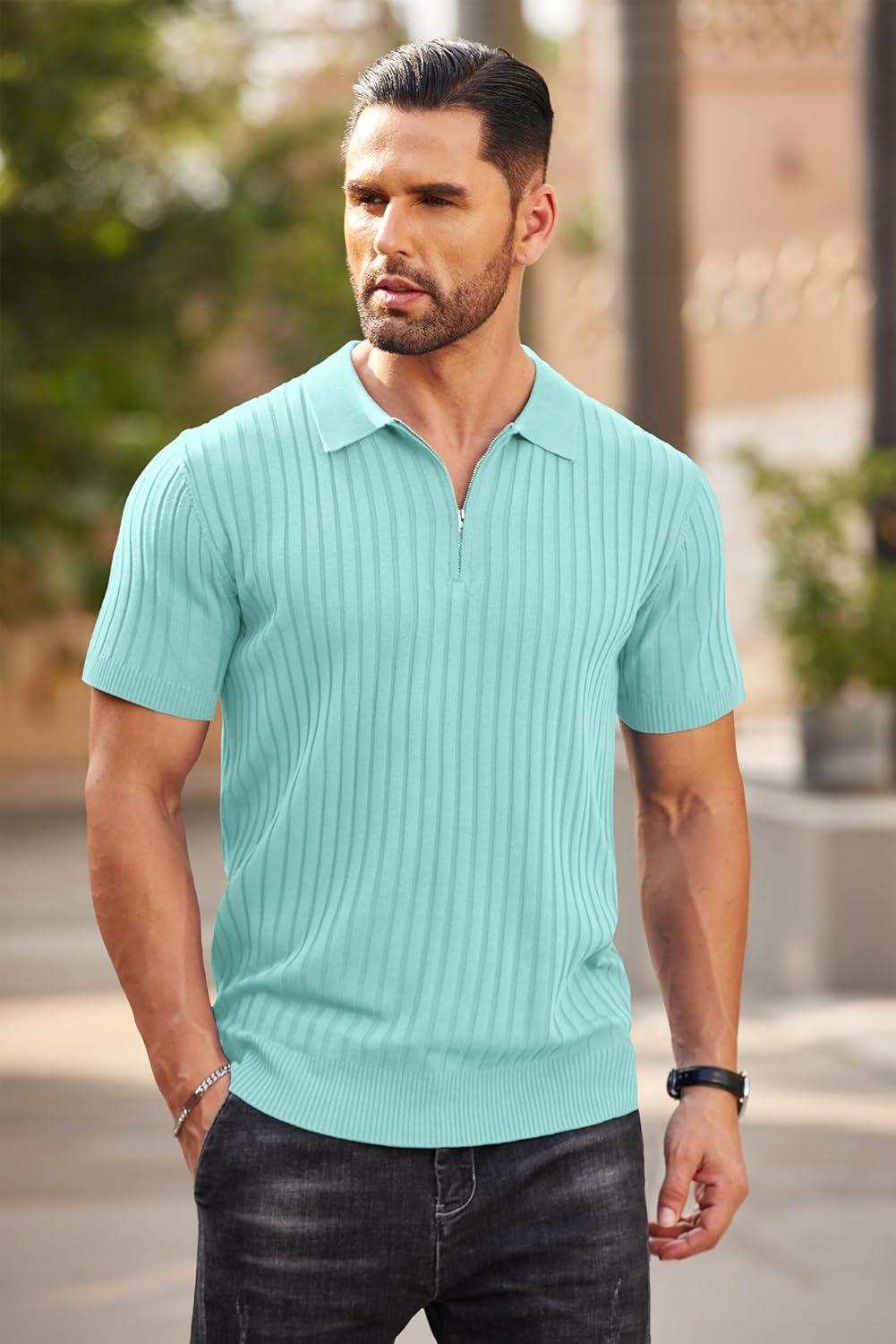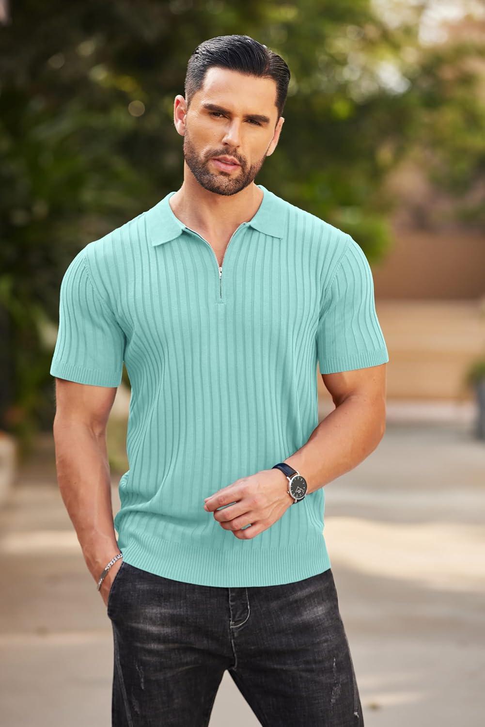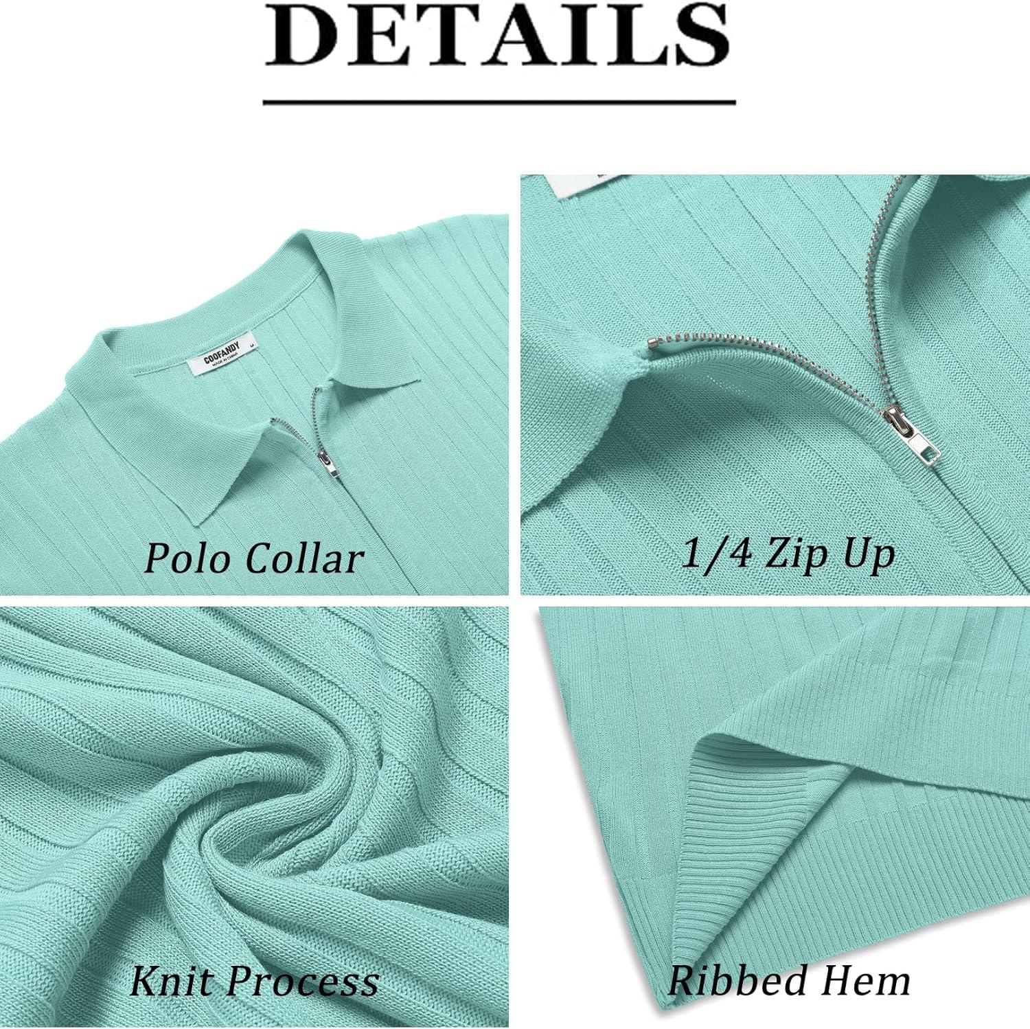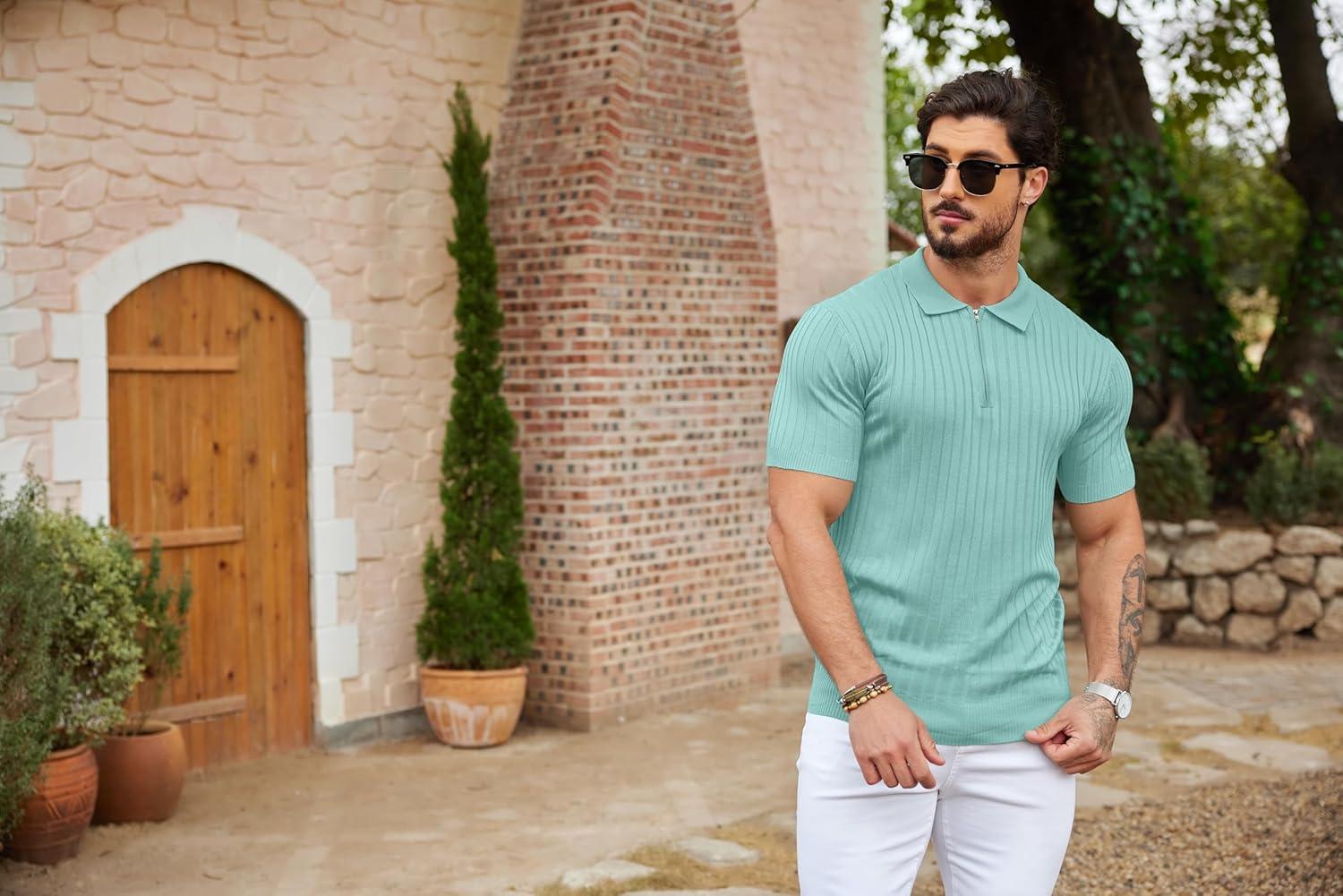 COOFANDY Men's Zipper Polo Shirts Short Sleeve Ribbed Knit Polo T Shirts Fashion Casual Golf Shirts(Green)