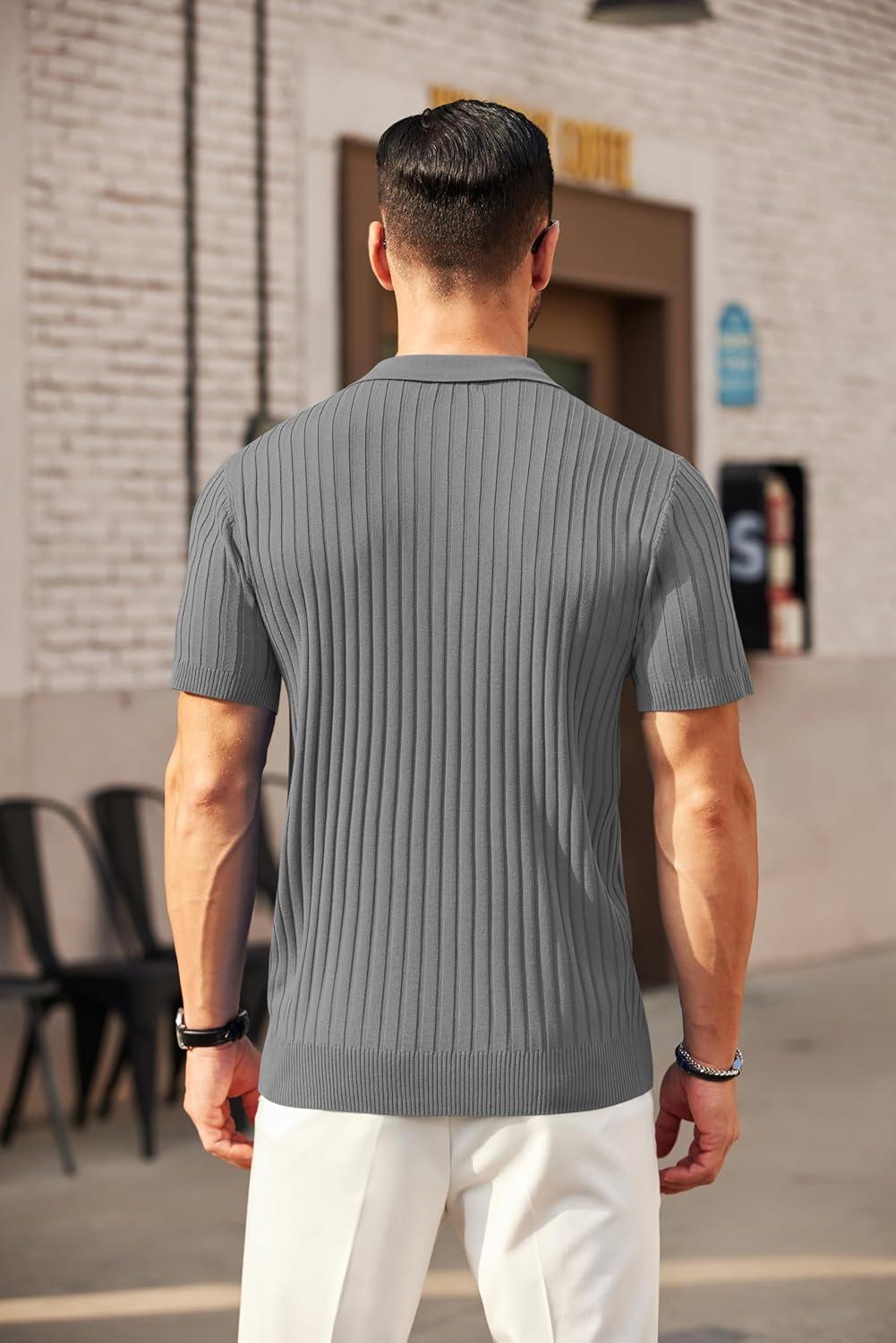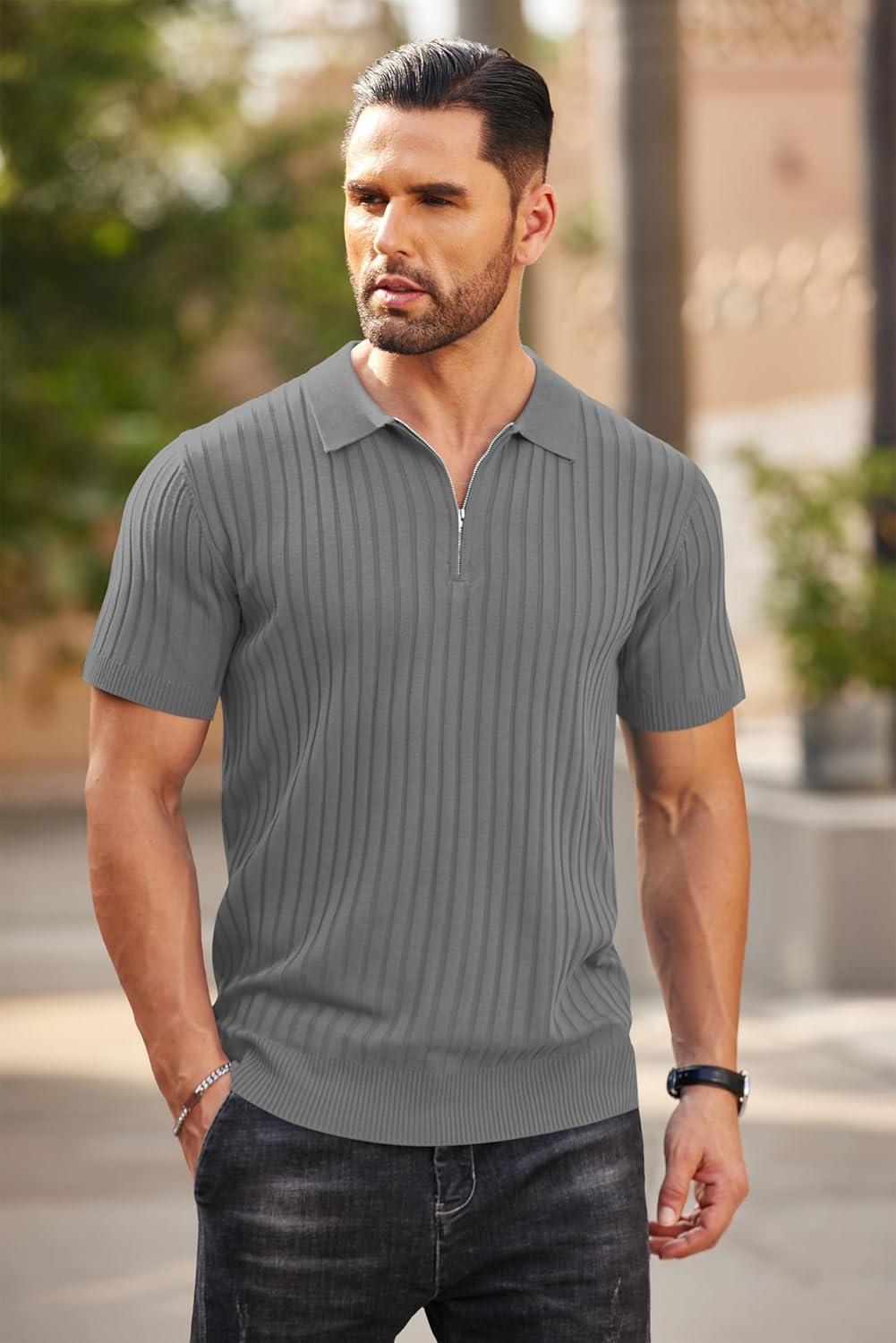 COOFANDY Men's Zipper Polo Shirts Short Sleeve Ribbed Knit Polo T Shirts Fashion Casual Golf Shirts(Grey)