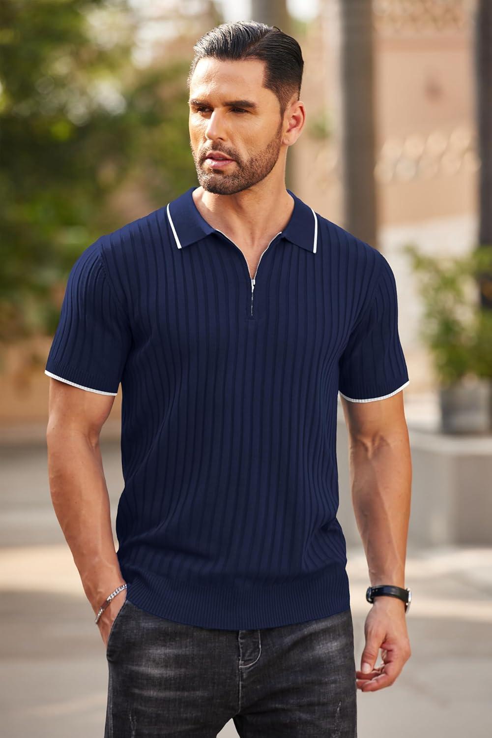 COOFANDY Men's Zipper Polo Shirts Short Sleeve Ribbed Knit Polo T Shirts Fashion Casual Golf Shirts(Navy Blue Stripes)