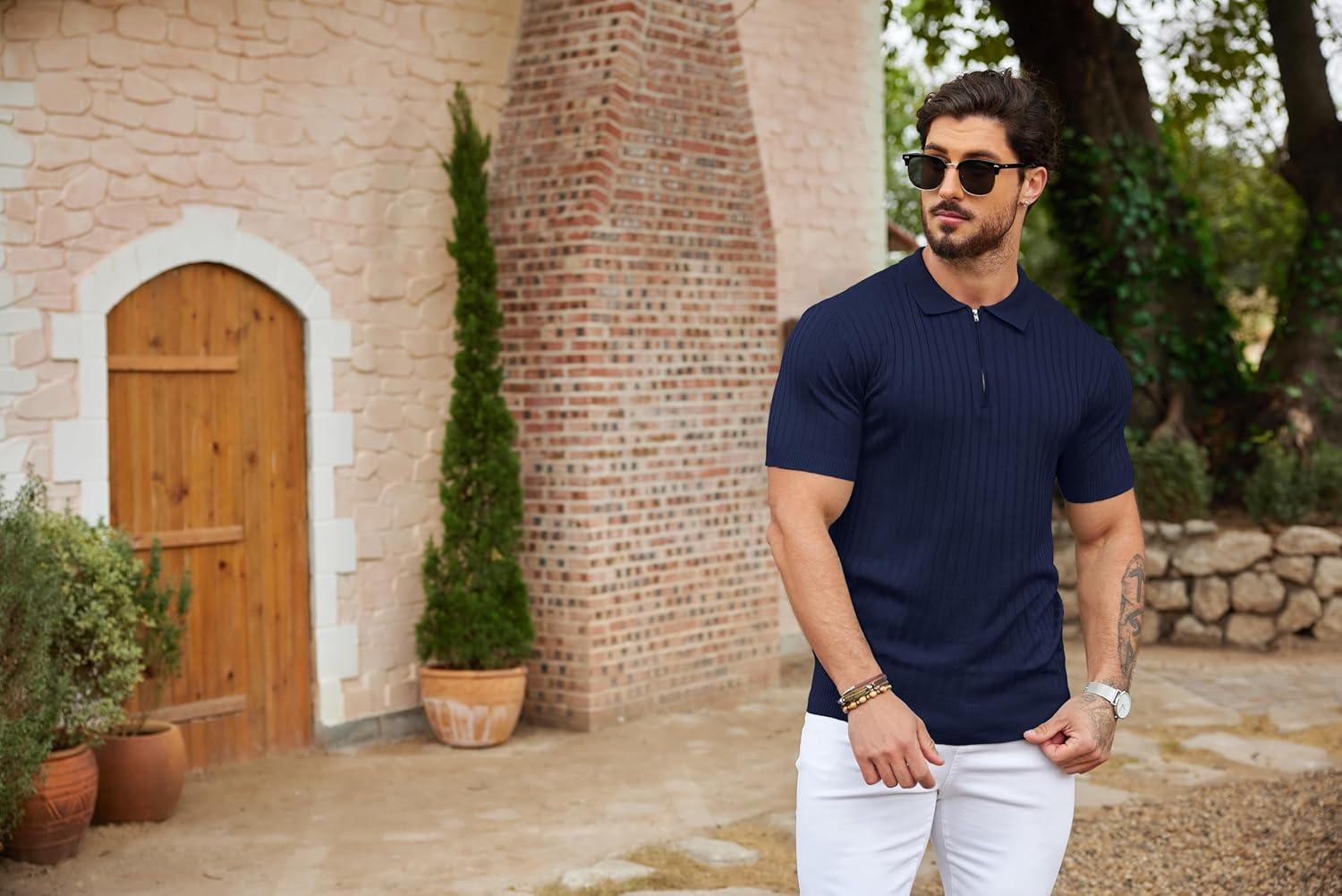 COOFANDY Men's Zipper Polo Shirts Short Sleeve Ribbed Knit Polo T Shirts Fashion Casual Golf Shirts(Navy Blue)