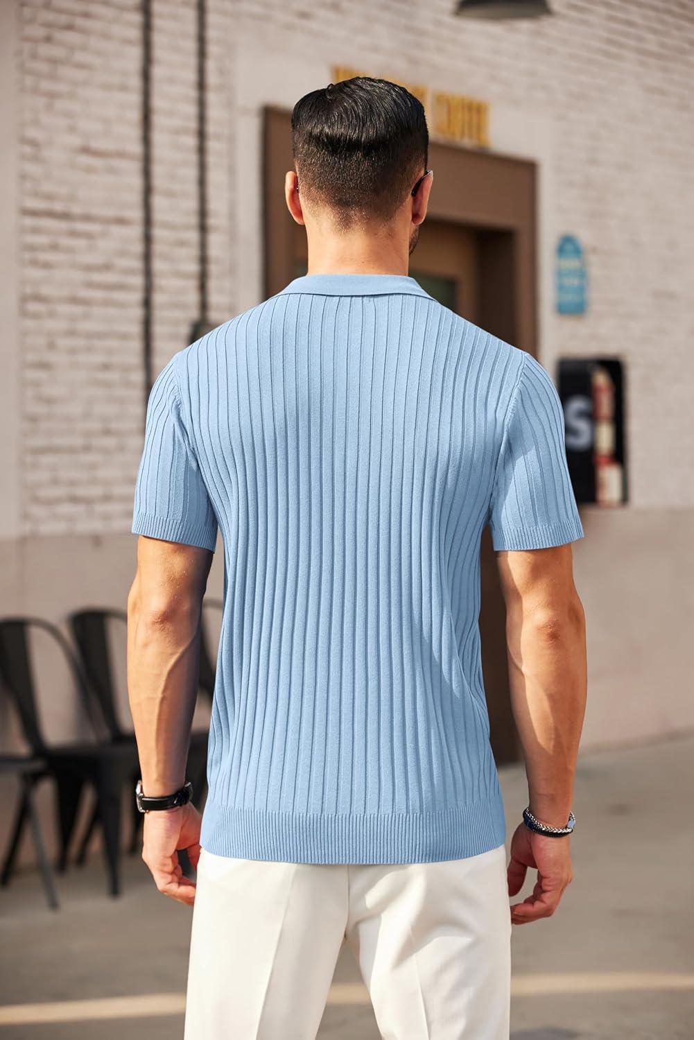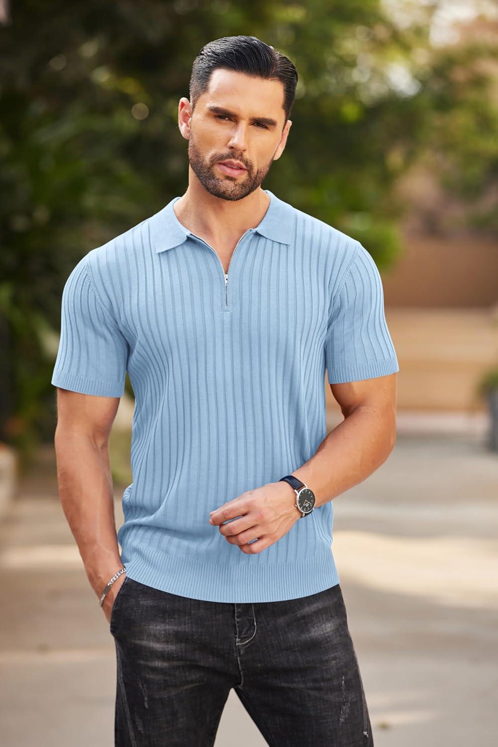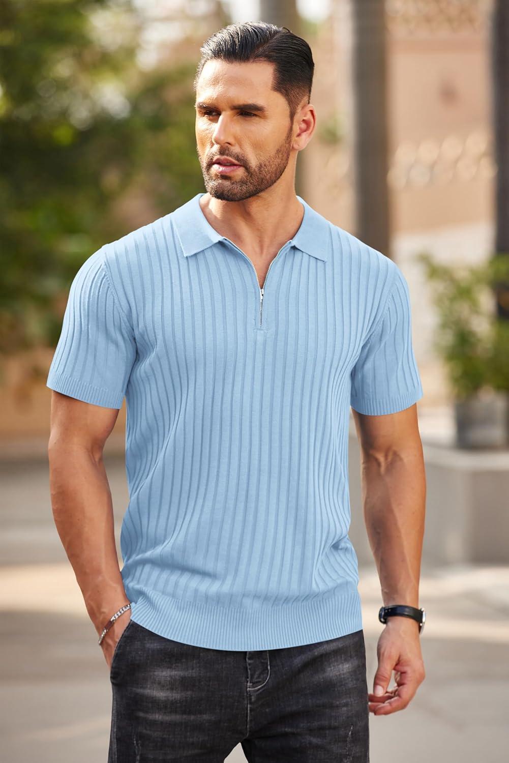 COOFANDY Men's Zipper Polo Shirts Short Sleeve Ribbed Knit Polo T Shirts Fashion Casual Golf Shirts(Sky Blue)
