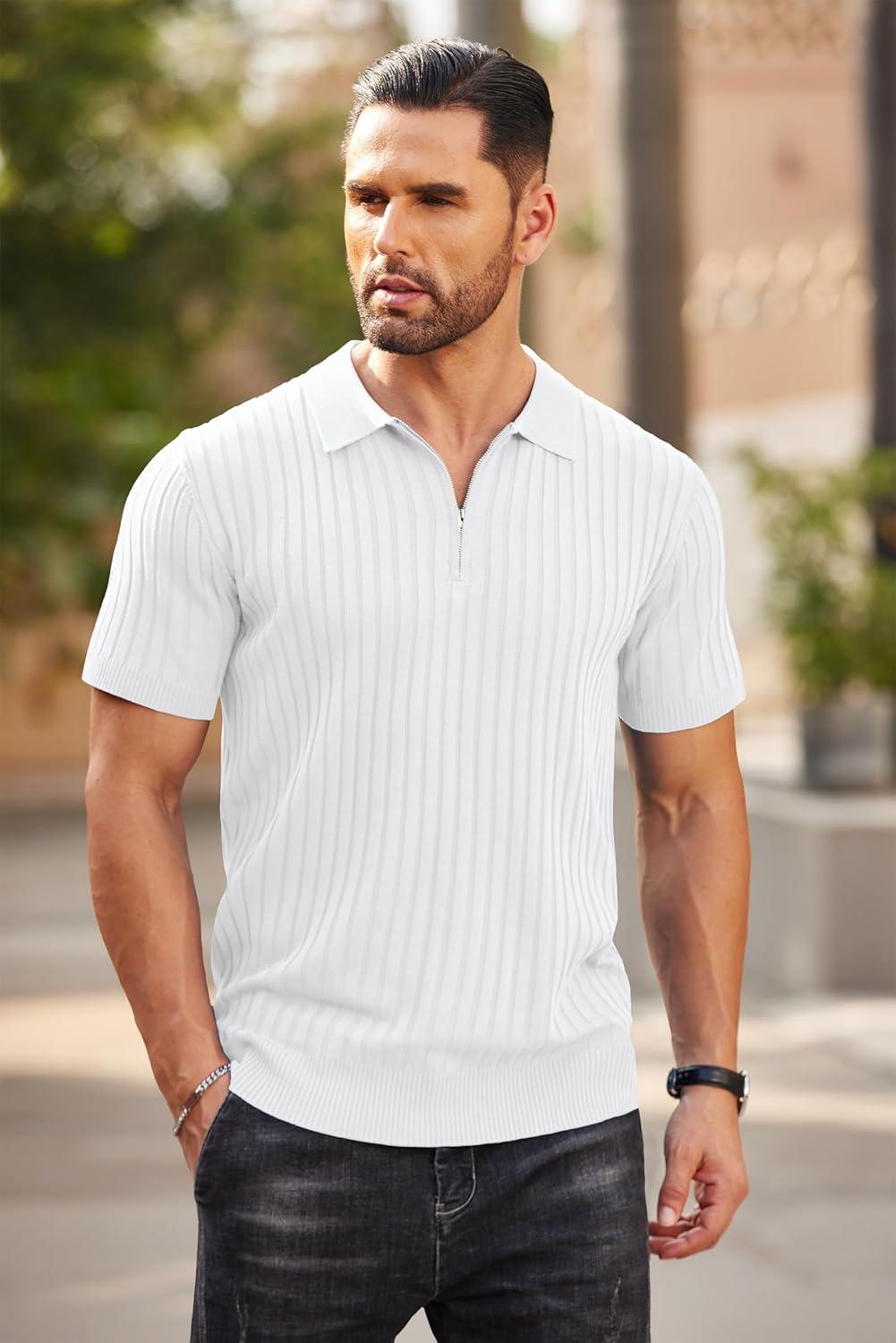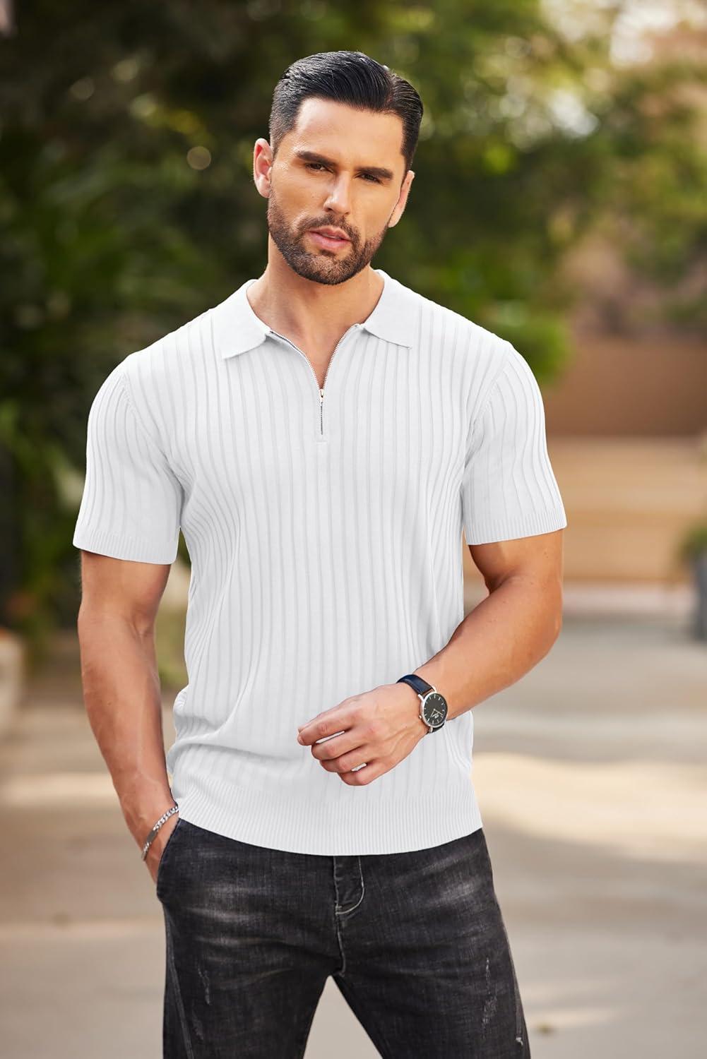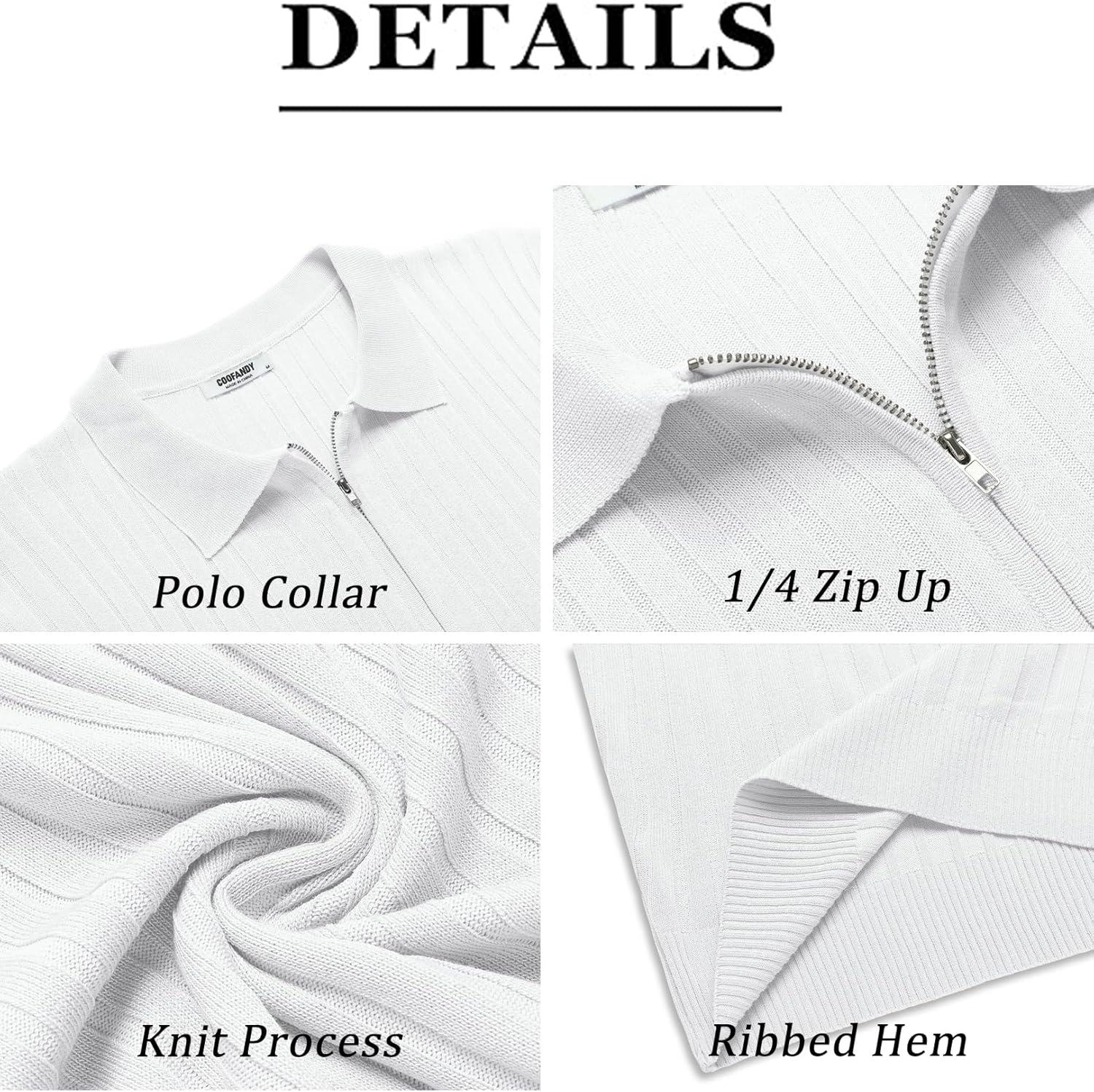 COOFANDY Men's Zipper Polo Shirts Short Sleeve Ribbed Knit Polo T Shirts Fashion Casual Golf Shirts(White)