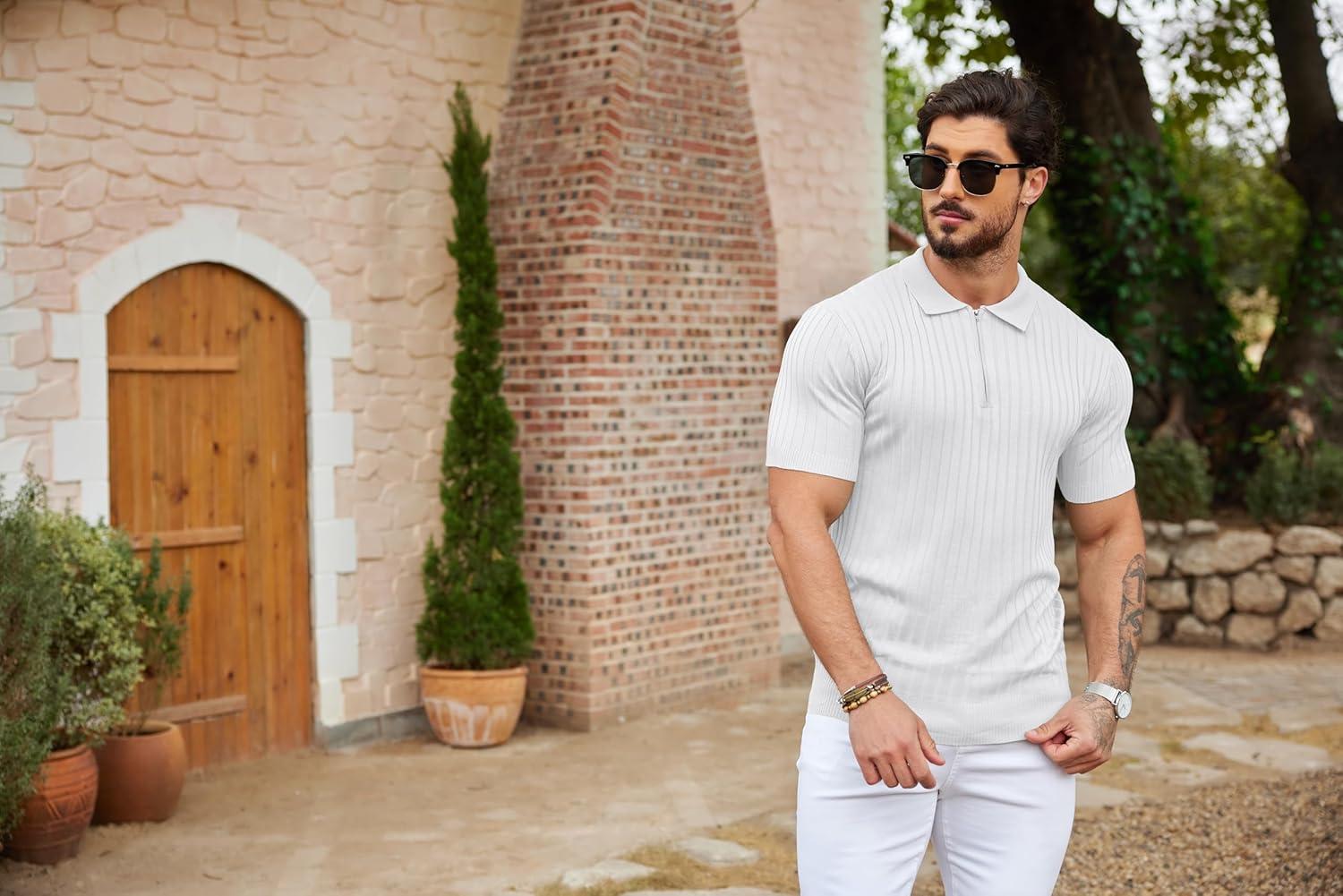 COOFANDY Men’s Zipper Polo Shirts Short Sleeve Ribbed Knit Polo T Shirts Fashion Casual Golf Shirts(White)