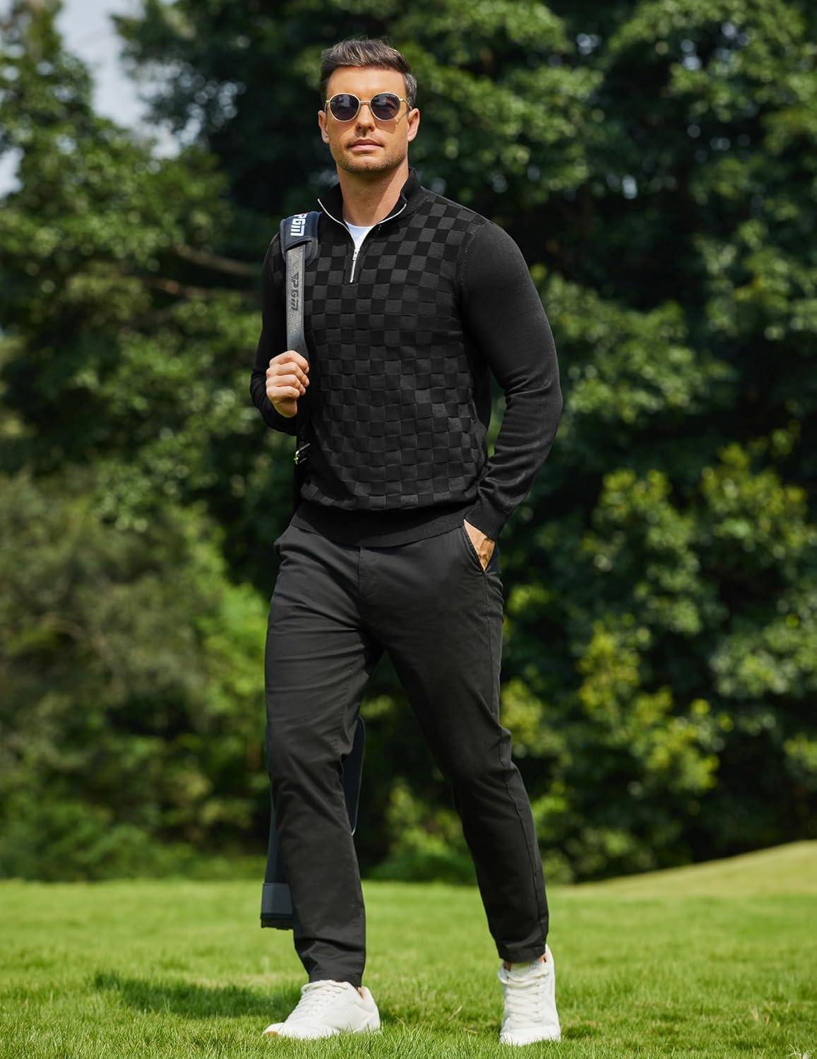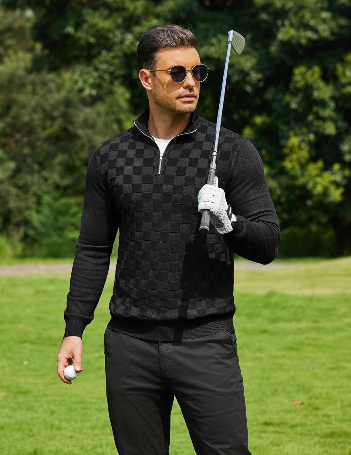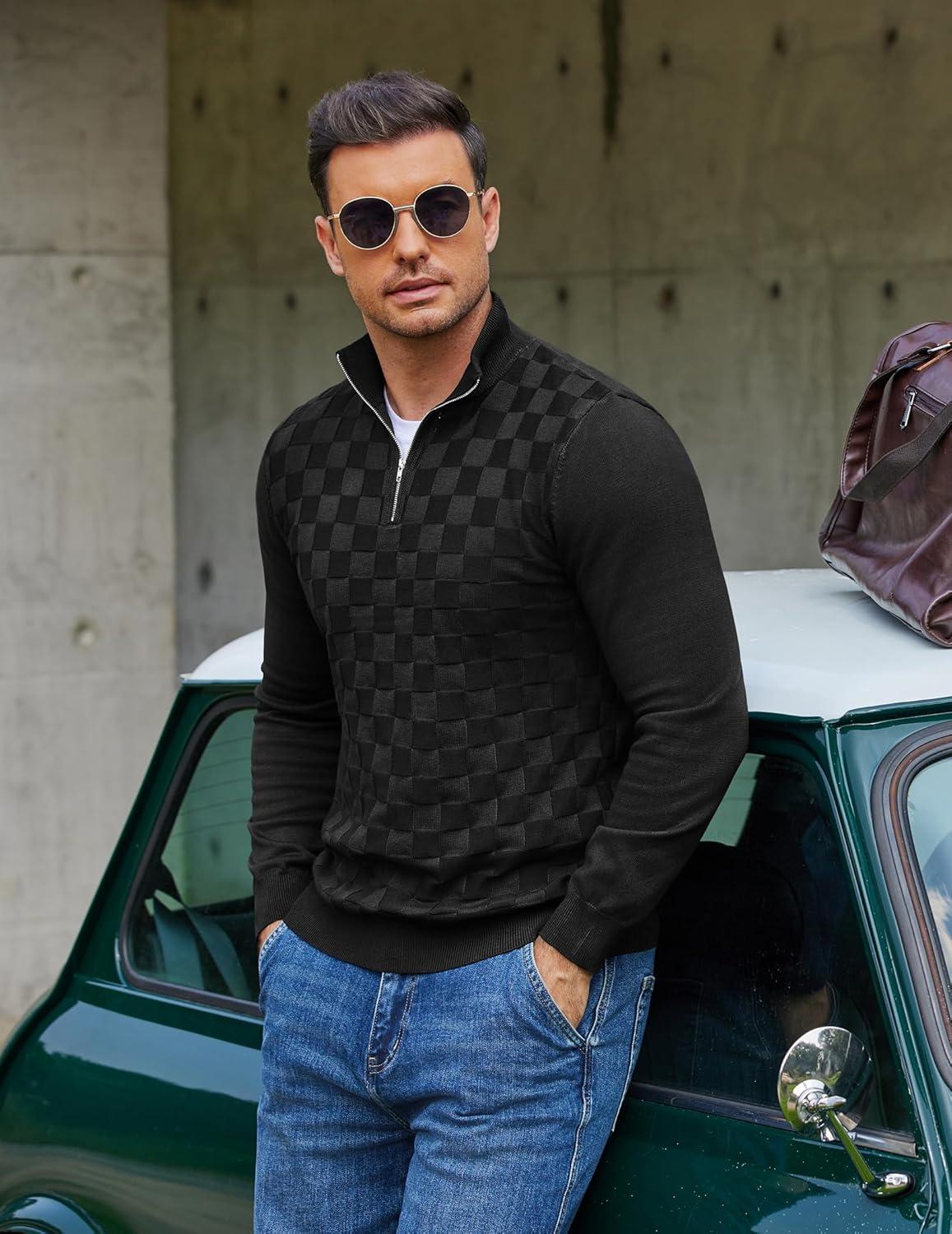 COOFANDY Quarter Zip Pullover Men Dress Sweaters Long Sleeve Jacquard Checkered Sweater(Black)