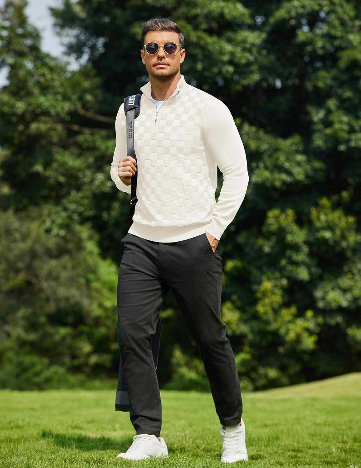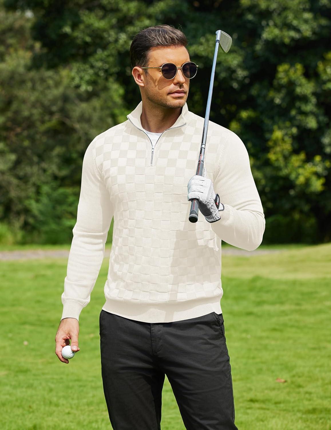 COOFANDY Quarter Zip Pullover Men Dress Sweaters Long Sleeve Jacquard Checkered Sweater(Champagne)